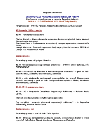 Program konferencji JAK UTRZYMA PRZEWAG KONKURENCYJN FIRMY? Konferencja organizowana w ramach Tygodnia Jako ci. WISŁA – 17-18 LISTOPADA 2005 (Hotel Goł biewski) Organizatorzy - RWTÜV Polska i Akademia Ekonomiczna w Katowicach 17 listopada 2005 - czwartek 10.00 – Powitanie uczestników Florian Ku nik – Uwarunkowania regionalne konkurencyjno ci, Rektor Akademii Ekonomicznej w Katowicach Stanisław Pater – Doskonalenie kompetencji naszym wyzwaniem, Prezes RWTÜV Polska Henryk Warkocz - Szanse i zagro enia fuzji na przykładzie koncernu TÜV Nord Group, V-ce Prezes RWTÜV Polska Sesja plenarna Prowadz cy sesj - Krystyna Lisiecka 10.40 - Globalizacja szans polskiego przemysłu – dr Horst Dieter Schulze, TÜV NORD GROUP 11.00 – Jak uczy si klientów w konkurencyjnym otoczeniu? – prof. dr hab. Zofia K dzior, Akademia Ekonomiczna, Katowice 11.20 – Jak skutecznie motywowa pracowników do pracy? Nowoczesne techniki motywacji – prof. dr hab. Gra yna Gruszczy ska – Malec, Akademia Ekonomiczna, Katowice 11.40–12.10 - przerwa na kaw 12.10-12.40 - Wr czenie Certyfikatu Organizacji Publicznej – Polskie Radio Opole, Referat przedstawiciela scertyfikowanej jednostki: Czy certyfikat umacnia wizerunek organizacji publicznej? - dr Bogusław Nierenberg, Polskie Radio Opole. Sesja plenarna- c.d. Prowadz cy sesj - prof. dr hab. Zofia K dzior 12.40 - Strategie zarz dzania wiedz dla wzrostu efektywno ci działa w firmie – prof. dr hab. Celina Olszak, Akademia Ekonomiczna, Katowice 13.10 - Controlling metod wspomagania zarz dzania firm – prof. dr hab. Krystyna J dralska 13.30 –15.30 przerwa obiadowa 15.30– 16.45 Dyskusja panelowa w sekcjach I. SEKCJA 1 – Koncepcje i strategie marketingowe Moderator - prof.dr hab. Zofia K dzior 1. Nowe strategie zdobywania klienta na rynku dóbr inwestycyjnych – Prezes Marian B k, Centrala Zaopatrzenia Hutnictwa, Katowice 2. Zarz dzanie klientami kluczowymi czyli jak zaprzyja ni si z klientami– Mirosław Kosi ski, RWTUV Polska 3. Programy budowania lojalno ci klientów – dr Maciej Mitr ga, AE Katowice Przerwa na kaw -16.45 – 17.00 Praca w sekcji - w godz. od 17.00 -18.30 II. SEKCJA 2 - Jak skutecznie motywowa pracowników do pracy? Stosowanie nowoczesnych technik w praktyce. Moderator - Gra yna Gruszczy ska - Malec + asystent 1. Praktyka zarz dzania wiedz czyli lud mi na przykładzie Fiat - GM Power Train – Prezes Tadeusz wierczek 2. Modele gromadzenia i dzielenia si wiedz wewn trz firmy– dr Anna Adamus – Matuszy ska, Akademia Ekonomiczna, Katowice 3. Model oceny zarz dzania wiedz w obszarze jako ci wg propozycji normy ISO 10014 – Krystyna Lisiecka, Akademia Ekonomiczna/RWTUV Katowice. Uroczysta kolacja –godzina 19.00 18 listopada 2005 - pi tek 9.00 -12.30 godz. – 9.00 - 10.30 III. SEKCJA 3 - Controlling w praktyce –modele i systemy Moderator - dr Paweł Kosin 1. Model controllingu kosztów na przykładzie firmy produkcyjnej - Prezes dr in . Jerzy Szpineter, Belos, Sp. z o.o., Bielsko-Biała 2. System controllingu kosztów- dr Paweł Kosin, AE Katowice 3. Uwarunkowania wdra ania systemu controllingu w praktyce - dr Wojciech Czakon, AE Katowice Przerwa na kaw -10.30 -11.00 SEKCJA 4 - Systemy bezpiecze stwa informacji – projektowanie i analiza Moderator – Robert Wójcik 1. Systemy zarz dzania bezpiecze stwem informacji no nikiem przewagi konkurencyjnej w biznesie – Robert Wójcik, RWTÜV Polska, Katowice 2. Zarz dzanie ryzykiem informacji – Marcin Zastawa, DGA Pozna 3. Audity bezpiecze stwa informacji – Krzysztof Sierota, RWTÜV Polska, Katowice Sesja plenarna zamykaj ca konferencj – godzina 12.30 Podsumowanie obrad. Wnioski z odbytych sesji i przeprowadzonych dyskusji (referuj moderatorzy). Zako czenie konferencji –około godziny 13.00 Obiad – godzina 13.30