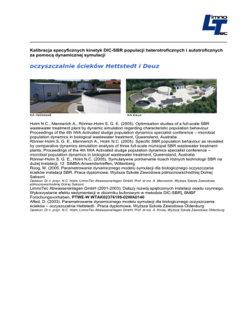 Kalibracja specyficznych kinetyk DIC-SBR populacji heterotroficznych i autotroficznych za pomocą dynamicznej symulacji oczyszczalnie ścieków Hettstedt i Deuz KA Hettstedt KA Deuz Holm N.C., Mennerich A., Rönner-Holm S. G. E. (2005). Optimisation studies of a full-scale SBR wastewater treatment plant by dynamic simulation regarding characteristic population behaviour. Proceedings of the 4th IWA Activated sludge population dynamics specialist conference – microbial population dynamics in biological wastewater treatment, Queensland, Australia Rönner-Holm S. G. E., Mennerich A., Holm N.C. (2005). Specific SBR population behaviour as revealed by comparative dynamics simulation analysis of three full-scale municipal SBR wastewater treatment plants. Proceedings of the 4th IWA Activated sludge population dynamics specialist conference – microbial population dynamics in biological wastewater treatment, Queensland, Australia Rönner-Holm S. G. E., Holm N.C. (2005). Symulatywne porównanie trzech różnych technologii SBR na dużej instalacji. 12. SIMBA-Anwendertreffen, Wittenberg Roog, M. (2005. Parametrowanie dynamicznego modelu symulacji dla biologicznego oczyszczania ścieków instalacji SBR, Praca dyplomowa. Wyższa Szkoła Zawodowa północnowschodniej Dolnej Saksoni Opiekun: Dr n. przyr. N.C. Holm, LimnoTec Abwasseranlagen GmbH; Prof. dr-inż. A. Mennerich, Wyższa Szkoła Zawodowa północnowschodniej Dolnej Saksoni LimnoTec Abwasseranlagen GmbH (2001-2003), Dalszy rozwój spiętrzonych instalacji osadu czynnego. Wykorzystanie efektu sedymentacji w zbiorniku buforowym w metodzie DIC-SBR], BMBF Forschungsvorhaben, PTWE-W WTAK02376199-02WA0140 Affed, D. (2003). Parametrowanie dynamicznego modelu symulacji dla biologicznego oczyszczania ścieków – oczyszczalnia Hettstedt-. Praca dyplomowa. Wyższa Szkoła Zawodowa Oldenburg Opiekun: Dr n. przyr. N.C. Holm, LimnoTec Abwasseranlagen GmbH; Prof. dr-inż. A. Kruse, Wyższa Szkoła Zawodowa Oldenburg