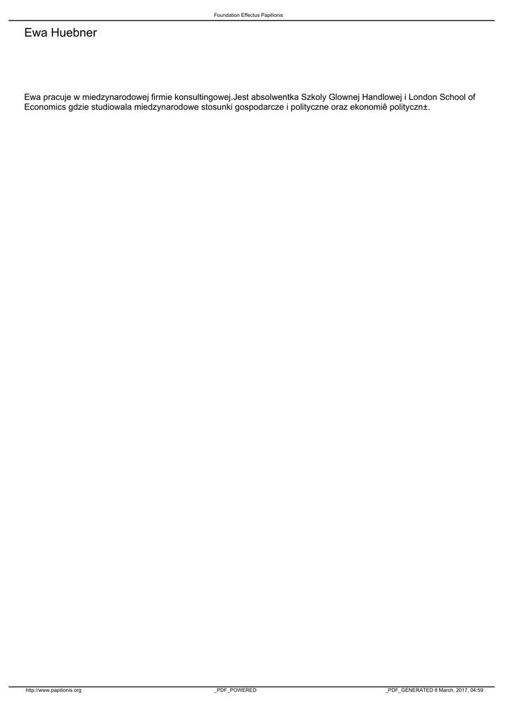 Foundation Effectus Papilionis Ewa Huebner Ewa pracuje w miedzynarodowej firmie konsultingowej.Jest absolwentka Szkoly Glownej Handlowej i London School of Economics gdzie studiowala miedzynarodowe stosunki gospodarcze i polityczne oraz ekonomiê polityczn±. http://www.papilionis.org _PDF_POWERED _PDF_GENERATED 8 March, 2017, 04:59