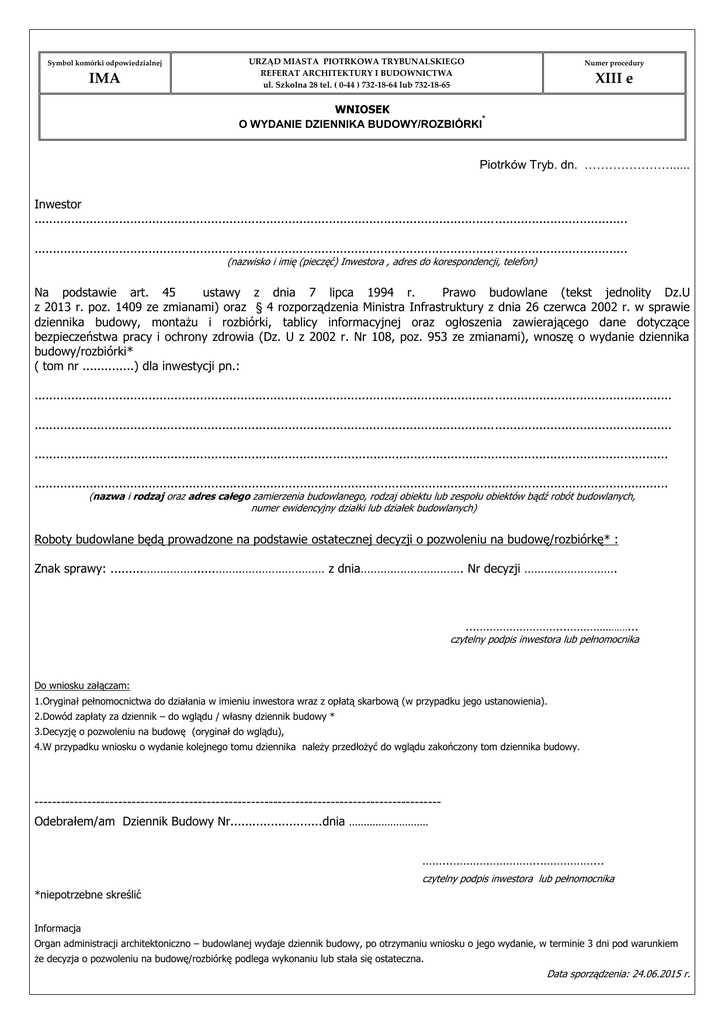 Symbol komórki odpowiedzialnej IMA URZĄD MIASTA PIOTRKOWA TRYBUNALSKIEGO REFERAT ARCHITEKTURY I BUDOWNICTWA ul. Szkolna 28 tel. ( 0-44 ) 732-18-64 lub 732-18-65 Numer procedury XIII e WNIOSEK * O WYDANIE DZIENNIKA BUDOWY/ROZBIÓRKI Piotrków Tryb. dn. …………………...... Inwestor ................................................................................................................................................................. ................................................................................................................................................................. (nazwisko i imię (pieczęć) Inwestora , adres do korespondencji, telefon) Na podstawie art. 45 ustawy z dnia 7 lipca 1994 r. Prawo budowlane (tekst jednolity Dz.U z 2013 r. poz. 1409 ze zmianami) oraz § 4 rozporządzenia Ministra Infrastruktury z dnia 26 czerwca 2002 r. w sprawie dziennika budowy, montażu i rozbiórki, tablicy informacyjnej oraz ogłoszenia zawierającego dane dotyczące bezpieczeństwa pracy i ochrony zdrowia (Dz. U z 2002 r. Nr 108, poz. 953 ze zmianami), wnoszę o wydanie dziennika budowy/rozbiórki* ( tom nr ..............) dla inwestycji pn.: ............................................................................................................................................................................. ............................................................................................................................................................................. ............................................................................................................................................................................ ............................................................................................................................................................................ (nazwa i rodzaj oraz adres całego zamierzenia budowlanego, rodzaj obiektu lub zespołu obiektów bądź robót budowlanych, numer ewidencyjny działki lub działek budowlanych) Roboty budowlane będą prowadzone na podstawie ostatecznej decyzji o pozwoleniu na budowę/rozbiórkę* : Znak sprawy: .........……………......…………………………… z dnia…………………………. Nr decyzji ………………………. ………………………………….....……… czytelny podpis inwestora lub pełnomocnika Do wniosku załączam: 1.Oryginał pełnomocnictwa do działania w imieniu inwestora wraz z opłatą skarbową (w przypadku jego ustanowienia). 2.Dowód zapłaty za dziennik – do wglądu / własny dziennik budowy * 3.Decyzję o pozwoleniu na budowę (oryginał do wglądu), 4.W przypadku wniosku o wydanie kolejnego tomu dziennika należy przedłożyć do wglądu zakończony tom dziennika budowy. -------------------------------------------------------------------------------------------Odebrałem/am Dziennik Budowy Nr.........................dnia ........................... ……………………………………………… czytelny podpis inwestora lub pełnomocnika *niepotrzebne skreślić Informacja Organ administracji architektoniczno – budowlanej wydaje dziennik budowy, po otrzymaniu wniosku o jego wydanie, w terminie 3 dni pod warunkiem że decyzja o pozwoleniu na budowę/rozbiórkę podlega wykonaniu lub stała się ostateczna. Data sporządzenia: 24.06.2015 r.