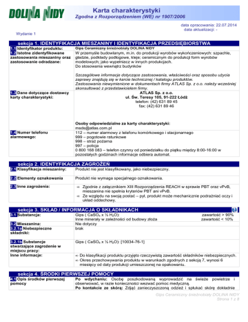 Karta charakterystyki Zgodna z Rozporządzeniem (WE) nr 1907/2006 data opracowania: 22.07.2014 data aktualizacji: Wydanie 1 sekcja 1. IDENTYFIKACJA MIESZANINY I IDENTYFIKACJA PRZEDSIĘBIORSTWA 1.1 Identyfikator produktu: 1.2 Istotne zidentyfikowane zastosowania mieszaniny oraz zastosowanie odradzane: 1.3 Dane dotyczące dostawcy karty charakterystyki: 1.4 Numer telefonu alarmowego: Gips Ceramiczny śnieżnobiały DOLINA NIDY W przemyśle budowlanym, m.in. do produkcji wyrobów wykończeniowych: szpachle, gładzie, podkłady podłogowe, kleje; ceramicznym do produkcji form wyrobów modelowych; jako wypełniacz w innych produkcjach. Do stosowania wewnątrz budynków Szczegółowe informacje dotyczące zastosowania, właściwości oraz sposobu użycia zaprawy znajdują się w karcie technicznej / katalogu produktów. Zastosowania niewymienione w dokumentach firmy ATLAS Sp. z o.o. należy wcześniej skonsultować z przedstawicielem firmy. ATLAS Sp. z o.o. ul. Św. Teresy 105, 91-222 Łódź telefon: (42) 631 89 45 fax: (42) 631 89 46 Osoby odpowiedzialne za karty charakterystyki: [email protected] 112 – numer alarmowy z telefonu komórkowego i stacjonarnego 999 – pogotowie ratunkowe 998 – straż pożarna 997 – policja 0 800 168 083 – telefon czynny od poniedziałku do piątku między 8:00-16:00 w pozostałych godzinach informacje odbiera automat. sekcja 2. IDENTYFIKACJA ZAGROŻEŃ 2.1 Klasyfikacja mieszaniny: Produkt nie jest klasyfikowany, jako niebezpieczny. 2.2 Elementy oznakowania Produkt nie wymaga specjalnego oznakowania. 2.3 Inne zagrożenia: • Zgodnie z załącznikiem XIII Rozporządzenia REACH w sprawie PBT oraz vPvB, mieszanina nie spełnia kryteriów PBT ani vPvB. • Ze względu na swoją postać – pył, produkt może mechanicznie podrażniać oczy i układ oddechowy. sekcja 3. SKŁAD / INFORMACJA O SKŁADNIKACH 3.1 Substancja: 3.2 Mieszanina: 3.2.1a Niebezpieczne składniki: 3.2.1b Substancje stwarzające zagrożenie w miejscu pracy: Inne informacje: Gips ( CaSO4 x ½ H2O): Inne minerały w zależności od budowy złoża Nie dotyczy brak zawartość > 90% zawartość < 10% Gips ( CaSO4 x ½ H2O): [10034-76-1] • Do klasyfikacji produktu przyjęto rzeczywistą zawartość składników niebezpiecznych. • Okres przechowywania produktu w warunkach zgodnych z sekcją 7, wynosi 6 miesięcy od daty produkcji umieszczonej na opakowaniu. sekcja 4. ŚRODKI PIERWSZEJ POMOCY 4.1 Opis środków pierwszej pomocy Po wdychaniu: Osobę poszkodowaną wyprowadzić na świeże powietrze i obserwować, w razie konieczności wezwać pomoc medyczną. Po kontakcie ze skórą: Zdjąć zanieczyszczoną odzież i spłukać skórę dokładnie Gips Ceramiczny śnieżnobiały DOLINA NIDY Strona 1 z 8 Karta charakterystyki Zgodna z Rozporządzeniem (WE) nr 1907/2006 data opracowania: 22.07.2014 data aktualizacji: Wydanie 1 4.2 Najważniejsze ostre i opóźnione objawy oraz skutki narażenia 4.3 Wskazania dotyczące wszelkiej natychmiastowej pomocy lekarskiej i szczególnego postępowania z poszkodowanym wodą. Po kontakcie z oczami: Nie trzeć oczu. Natychmiast opłukać dużą ilością wody przez minimum 15 min, podczas płukania trzymać oczy szeroko otwarte. Wyjąć soczewki kontaktowe. Konieczna konsultacja okulistyczna. Po połknięciu: Nie wywoływać wymiotów. Osobie nieprzytomnej lub półprzytomnej nie podawać nic do picia, jeśli osoba jest przytomna, przepłukać usta wodą. Niezwłocznie skonsultować się z lekarzem. Natychmiast usuwać produkt za skóry, oczu i śluzówek, co pozwoli zapobiec wszelkim opóźnionym skutkom narażenia. W przypadku wystąpienia jakichkolwiek niepokojących objawów wezwać natychmiast pomoc medyczną, pokazać kartę charakterystyki, opakowanie lub etykietę. Nie dopuszczać do stwardnienia zaprawy, natychmiast spłukać/przemyć. W przypadku kontaktu z oczami lub śluzówkami wskazana jest konsultacja medyczna. Ze względu na właściwości drażniące produktu, wskazany jest dostęp do bieżącej wody. W przypadku wielokrotnego lub długotrwałego kontaktu ze skórą stosować kremy ochronne. sekcja 5. POSTĘPOWANIE W PRZYPADKU POŻARU Każdy pracownik powinien zasięgnąć informacji na temat zagrożeń pożarowych na jego stanowisku pracy i w najbliższym otoczeniu. Stanowisko pracy powinno być utrzymane w należytym porządku. Materiały łatwopalne nie mogą znajdować się w pobliżu urządzeń elektrycznych, piecyków czy innych źródeł ognia. W przypadku powstania pożaru należy niezwłocznie, przy użyciu wszystkich dostępnych środków, zaalarmować osoby będące w strefie zagrożenia i wezwać straż pożarną (patrz: sekcja 1.4), podając niezbędne informacje umożliwiające rozpoczęcie akcji przeciwpożarowej (podać gdzie powstało zdarzenie - dokładny adres, co się pali lub jaki rodzaj zagrożenia zaistniał, czy istnieje zagrożenie dla życia ludzkiego, nr telefonu, z którego się alarmuje oraz swoje imię i nazwisko). Następnie przystąpić niezwłocznie, przy użyciu miejscowych środków gaśniczych do gaszenia pożaru i nieść pomoc osobom zagrożonym w przypadku koniecznym przystąpić do ewakuacji ludzi i mienia. Należy czynności te wykonać w taki sposób aby nie doszło do powstania paniki jaka może ogarnąć ludzi będących w zagrożeniu, które wywołuje u ludzi ogień i dym. Panika może być przyczyną niepotrzebnych i tragicznych w skutkach wypadków w trakcie prowadzenia działań ratowniczo gaśniczych. Dlatego prowadząc jakiekolwiek działania w przypadku powstania pożar należy kierować się rozwagą w podejmowaniu decyzji. Do czasu przybycia straży pożarnej kierowanie akcją obejmuje specjalnie do tej funkcji powołana osoba. Należy pamiętać o ochronie dróg oddechowych przed dymem poprzez stosowanie zwilżonych chusteczek oraz poruszania się w dolnych partiach w pomieszczeniach o dużym stopniu zadymienia. 5.1 Środki gaśnicze 5.2 Szczególne zagrożenia związane z mieszaniną 5.3 