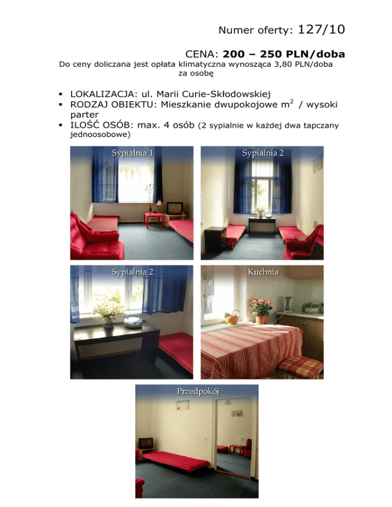 Numer oferty: 127/10 CENA: 200 – 250 PLN/doba Do ceny doliczana jest opłata klimatyczna wynosząca 3,80 PLN/doba za osobę LOKALIZACJA: ul. Marii Curie-Skłodowskiej RODZAJ OBIEKTU: Mieszkanie dwupokojowe m2 / wysoki parter ILOŚĆ OSÓB: max. 4 osób (2 sypialnie w kaŜdej dwa tapczany jednoosobowe) Numer oferty: 127/10 LOKALIZACJA: ul. Marii Curie-Skłodowskiej Lp. PRZEDMIOT OCENY UWAGI 1. Nowe/stare budownictwo Stara ładna kamienica, wysoki parter 2. Nowe/stare meble Nowe meble 3. Parking na posesji/GaraŜ Parking na posesji 4. Balkon / taras / ogródek Nie 5. Telewizor (Kablówka, TV Sat), Radio TV 6. Dostęp do telefonu Nie 7. Dostęp do internetu Tak Kuchnia Kuchnia wyposaŜona w: lodówka, kuchenka gazowa z piekarnikiem, mikrofalówka, sztućce, zastawa i garnki 9. Łazienka Łazienka z prysznicem i WC 10. Pościel, ręczniki Pościel 11. Dostęp do szafy / półek Tak 12. Pobyt ze zwierzątkiem Do uzgodnienia 14. Niepełnosprawni (winda, podjazd) Obiekt nie przystosowany 15. Plac zabaw dla dzieci 16. 17. Lokalizacja • Centrum – Dworzec PKP • PlaŜa, park • Dzielnica • Komunikacja miejska Osoby palące Nie 18. Piwnica/schowek Nie 19. Faktura VAT lub Rachunek Faktura 20. Inne 8. Spokojna okolica, blisko centrum i dworca. 10 minut pieszo do głównej ulicy Bohaterów Monte Cassino, 7 minut pieszo do dworca, 10 minut pieszo do plaŜy.