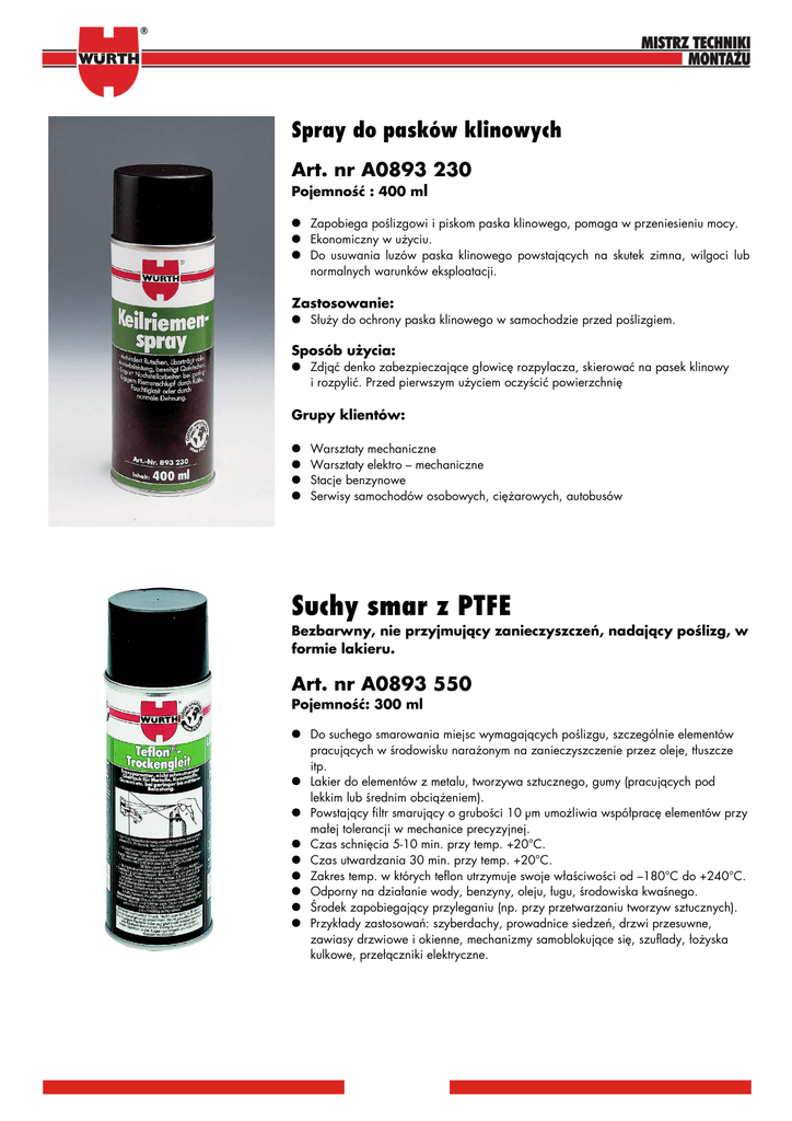 Spray do pasków klinowych Art. nr A0893 230 Pojemność : 400 ml ● Zapobiega poślizgowi i piskom paska klinowego, pomaga w przeniesieniu mocy. ● Ekonomiczny w użyciu. ● Do usuwania luzów paska klinowego powstających na skutek zimna, wilgoci lub normalnych warunków eksploatacji. Zastosowanie: ● Służy do ochrony paska klinowego w samochodzie przed poślizgiem. Sposób użycia: ● Zdjąć denko zabezpieczające głowicę rozpylacza, skierować na pasek klinowy i rozpylić. Przed pierwszym użyciem oczyścić powierzchnię Grupy klientów: ● ● ● ● Warsztaty mechaniczne Warsztaty elektro – mechaniczne Stacje benzynowe Serwisy samochodów osobowych, ciężarowych, autobusów Suchy smar z PTFE Bezbarwny, nie przyjmujący zanieczyszczeń, nadający poślizg, w formie lakieru. Art. nr A0893 550 Pojemność: 300 ml ● Do suchego smarowania miejsc wymagających poślizgu, szczególnie elementów pracujących w środowisku narażonym na zanieczyszczenie przez oleje, tłuszcze itp. ● Lakier do elementów z metalu, tworzywa sztucznego, gumy (pracujących pod lekkim lub średnim obciążeniem). ● Powstający filtr smarujący o grubości 10 μm umożliwia współpracę elementów przy małej tolerancji w mechanice precyzyjnej. ● Czas schnięcia 5-10 min. przy temp. +20°C. ● Czas utwardzania 30 min. przy temp. +20°C. ● Zakres temp. w których teflon utrzymuje swoje właściwości od –180°C do +240°C. ● Odporny na działanie wody, benzyny, oleju, ługu, środowiska kwaśnego. ● Środek zapobiegający przyleganiu (np. przy przetwarzaniu tworzyw sztucznych). ● Przykłady zastosowań: szyberdachy, prowadnice siedzeń, drzwi przesuwne, zawiasy drzwiowe i okienne, mechanizmy samoblokujące się, szuflady, łożyska kulkowe, przełączniki elektryczne.