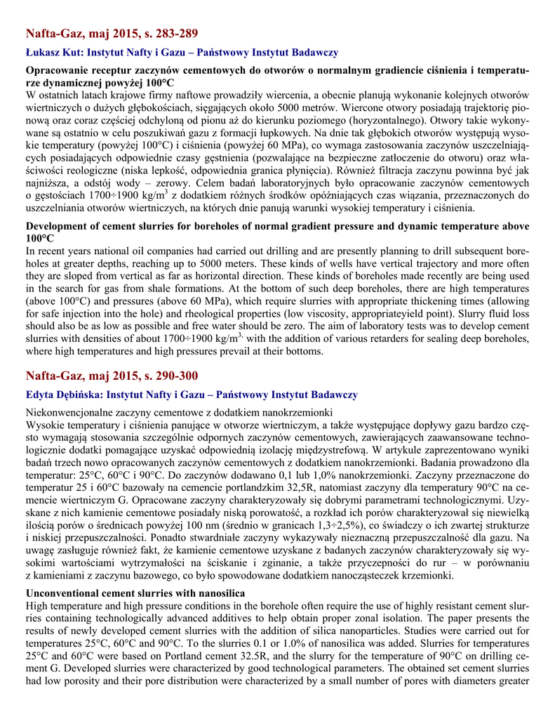 Nafta-Gaz, maj 2015, s. 283-289 Łukasz Kut: Instytut Nafty i Gazu – Państwowy Instytut Badawczy Opracowanie receptur zaczynów cementowych do otworów o normalnym gradiencie ciśnienia i temperaturze dynamicznej powyżej 100°C W ostatnich latach krajowe firmy naftowe prowadziły wiercenia, a obecnie planują wykonanie kolejnych otworów wiertniczych o dużych głębokościach, sięgających około 5000 metrów. Wiercone otwory posiadają trajektorię pionową oraz coraz częściej odchyloną od pionu aż do kierunku poziomego (horyzontalnego). Otwory takie wykonywane są ostatnio w celu poszukiwań gazu z formacji łupkowych. Na dnie tak głębokich otworów występują wysokie temperatury (powyżej 100°C) i ciśnienia (powyżej 60 MPa), co wymaga zastosowania zaczynów uszczelniających posiadających odpowiednie czasy gęstnienia (pozwalające na bezpieczne zatłoczenie do otworu) oraz właściwości reologiczne (niska lepkość, odpowiednia granica płynięcia). Również filtracja zaczynu powinna być jak najniższa, a odstój wody – zerowy. Celem badań laboratoryjnych było opracowanie zaczynów cementowych o gęstościach 1700÷1900 kg/m3 z dodatkiem różnych środków opóźniających czas wiązania, przeznaczonych do uszczelniania otworów wiertniczych, na których dnie panują warunki wysokiej temperatury i ciśnienia. Development of cement slurries for boreholes of normal gradient pressure and dynamic temperature above 100°C In recent years national oil companies had carried out drilling and are presently planning to drill subsequent boreholes at greater depths, reaching up to 5000 meters. These kinds of wells have vertical trajectory and more often they are sloped from vertical as far as horizontal direction. These kinds of boreholes made recently are being used in the search for gas from shale formations. At the bottom of such deep boreholes, there are high temperatures (above 100°C) and pressures (above 60 MPa), which require slurries with appropriate thickening times (allowing for safe injection into the hole) and rheological properties (low viscosity, appropriateyield point). Slurry fluid loss should also be as low as possible and free water should be zero. The aim of laboratory tests was to develop cement slurries with densities of about 1700÷1900 kg/m3, with the addition of various retarders for sealing deep boreholes, where high temperatures and high pressures prevail at their bottoms. Nafta-Gaz, maj 2015, s. 290-300 Edyta Dębińska: Instytut Nafty i Gazu – Państwowy Instytut Badawczy Niekonwencjonalne zaczyny cementowe z dodatkiem nanokrzemionki Wysokie temperatury i ciśnienia panujące w otworze wiertniczym, a także występujące dopływy gazu bardzo często wymagają stosowania szczególnie odpornych zaczynów cementowych, zawierających zaawansowane technologicznie dodatki pomagające uzyskać odpowiednią izolację międzystrefową. W artykule zaprezentowano wyniki badań trzech nowo opracowanych zaczynów cementowych z dodatkiem nanokrzemionki. Badania prowadzono dla temperatur: 25°C, 60°C i 90°C. Do zaczynów dodawano 0,1 lub 1,0% nanokrzemionki. Zaczyny przeznaczone do temperatur 25 i 60°C bazowały na cemencie portlandzkim 32,5R, natomiast zaczyny dla temperatury 90°C na cemencie wiertniczym G. Opracowane zaczyny charakteryzowały się dobrymi parametrami technologicznymi. Uzyskane z nich kamienie cementowe posiadały niską porowatość, a rozkład ich porów charakteryzował się niewielką ilością porów o średnicach powyżej 100 nm (średnio w granicach 1,3÷2,5%), co świadczy o ich zwartej strukturze i niskiej przepuszczalności. Ponadto stwardniałe zaczyny wykazywały nieznaczną przepuszczalność dla gazu. Na uwagę zasługuje również fakt, że kamienie cementowe uzyskane z badanych zaczynów charakteryzowały się wysokimi wartościami wytrzymałości na ściskanie i zginanie, a także przyczepności do rur – w porównaniu z kamieniami z zaczynu bazowego, co było spowodowane dodatkiem nanocząsteczek krzemionki. Unconventional cement slurries with nanosilica High temperature and high pressure conditions in the borehole often require the use of highly resistant cement slurries containing technologically advanced additives to help obtain proper zonal isolation. The paper presents the results of newly developed cement slurries with the addition of silica nanoparticles. Studies were carried out for temperatures 25°C, 60°C and 90°C. To the slurries 0.1 or 1.0% of nanosilica was added. Slurries for temperatures 25°C and 60°C were based on Portland cement 32.5R, and the slurry for the temperature of 90°C on drilling cement G. Developed slurries were characterized by good technological parameters. The obtained set cement slurries had low porosity and their pore distribution were characterized by a small number of pores with diameters greater than 100 nm, in the range 1.3÷2.5%, which prove their compact structure and low permeability. Moreover they exhibited low gas permeability. Noteworthy is the fact that the set cements were characterized by high values of compressive strength and flexural strength as well as adhesion to pipes – compared with basic cement stone, which was caused by the addition of silica nanoparticles. Nafta-Gaz, maj 2015, s. 301-307 Agata Lorek: Przedsiębiorstwo Handlowo-Usługowe GEOPOL Procesy zachodzące w cementach wiertniczych pod wpływem sekwestracji CO2 – przegląd literatury W artykule przedstawiono problem korozji kamieni cementowych w procesie sekwestracji CO2, mający istotne znaczenie ze względu na prowadzone na świecie próby zatłaczania tego gazu do górotworu poprzez istniejące otwory wiertnicze. Omówiono podstawowe składniki typowego cementu wiertniczego oraz przybliżono mechanizmy najważniejszych rodzajów korozji zachodzących w cemencie, ze szczególnym uwzględnieniem korozji pod wpływem CO2. Scharakteryzowano aktualny stan badań nad korozją cementów wiertniczych