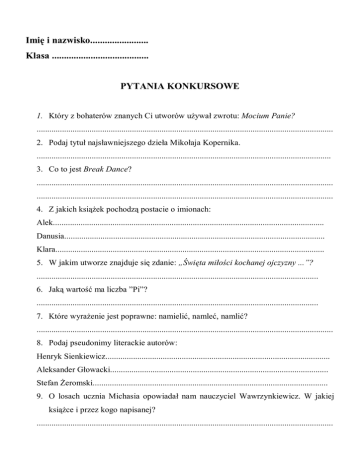 Imię i nazwisko........................ Klasa ........................................ PYTANIA KONKURSOWE 1. Który z bohaterów znanych Ci utworów używał zwrotu: Mocium Panie? ............................................................................................................................................ 2. Podaj tytuł najsławniejszego dzieła Mikołaja Kopernika. ........................................................................................................................................... 3. Co to jest Break Dance? ............................................................................................................................................ ............................................................................................................................................ 4. Z jakich książek pochodzą postacie o imionach: Alek................................................................................................................................ Danusia........................................................................................................................... Klara............................................................................................................................... 5. W jakim utworze znajduje się zdanie: „Święta miłości kochanej ojczyzny ...”? ..................................................................................................................................... 6. Jaką wartość ma liczba ”Pi”? ..................................................................................................................................... 7. Które wyrażenie jest poprawne: namielić, namleć, namlić? ............................................................................................................................................ 8. Podaj pseudonimy literackie autorów: Henryk Sienkiewicz.......................................................................................................... Aleksander Głowacki....................................................................................................... Stefan Żeromski............................................................................................................... 9. O losach ucznia Michasia opowiadał nam nauczyciel Wawrzynkiewicz. W jakiej książce i przez kogo napisanej? ............................................................................................................................................ 10. Kto na kartach książki utrwalił bohaterstwo Polaków na szlaku bitwy pod Monte Cassino? Podaj autora i tytuł. ............................................................................................................................................ 11. Co oznacza skrót GOPR? ........................................................................................................................................... 12. Co oznacza skrót PSL? ............................................................................................................................................ 13. Podaj nazwisko reżysera filmu Szczęki? ........................................................................................................................................... 14. Podkreśl w tekście fragmenty, których nie mógł napisać Henryk Sienkiewicz ukazując zdarzenia z początku XV wieku: „Tak rozmawiając doszli do namiotu, przed którym płonął duży podsycany benzyną ogień, a w nim kopciły się przygotowane przez czeladź mięsiwa. W namiocie chłodno było i wilgotno, więc rycerze, a w nim i Hlawa, pokładli się na tapczanach przy kaloryferach. Za czym posiliwszy się kurczakiem z rożna próbowali zasnąć.” 15. Kto stworzył ciekawą postać muzealnika detektywa? Wymień przynajmniej jeden tytuł, w którym poznajemy jego przygody. ............................................................................................................................................ ...........................................................................................................................................