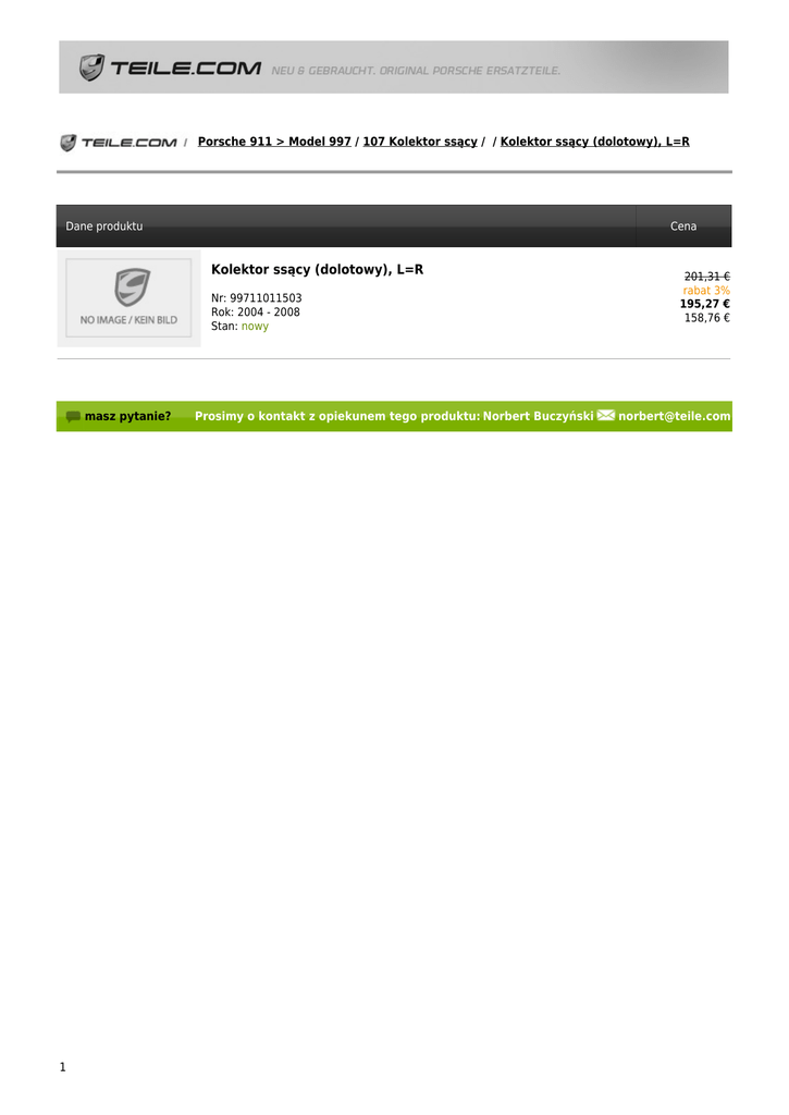 Porsche 911 > Model 997 / 107 Kolektor ssący / / Kolektor ssący (dolotowy), L=R Dane produktu Cena Kolektor ssący (dolotowy), L=R Nr: 99711011503 Rok: 2004 - 2008 Stan: nowy masz pytanie? 1 Prosimy o kontakt z opiekunem tego produktu: Norbert Buczyński 201,31 € rabat 3% 195,27 € 158,76 € [email protected]