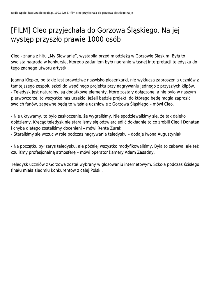 Radio Opole: http://radio.opole.pl/100,122587,film-cleo-przyjechala-do-gorzowa-slaskiego-na-je [FILM] Cleo przyjechała do Gorzowa Śląskiego. Na jej występ przyszło prawie 1000 osób Cleo - znana z hitu „My Słowianie”, wystąpiła przed młodzieżą w Gorzowie Śląskim. Była to swoista nagroda w konkursie, którego zadaniem było nagranie własnej interpretacji teledysku do tego znanego utworu artystki. Joanna Klepko, bo takie jest prawdziwe nazwisko piosenkarki, nie wyklucza zaproszenia uczniów z tamtejszego zespołu szkół do wspólnego projektu przy nagrywaniu jednego z przyszłych klipów. - Teledysk jest naturalny, są dodatkowe elementy, które zostały dołączone, a nie było w naszym pierwowzorze, to wszystko nas urzekło. Jeżeli będzie projekt, do którego będę mogła zaprosić swoich fanów, zapewne będą to właśnie uczniowie z Gorzowa Śląskiego – mówi Cleo. - Nie ukrywamy, to było zaskoczenie, że wygraliśmy. Nie spodziewaliśmy się, że tak daleko dojdziemy. Kręcąc teledysk nie staraliśmy się odzwierciedlić dokładnie to co zrobili Cleo i Donatan i chyba dlatego zostaliśmy docenieni – mówi Renta Żurek. - Staraliśmy się wczuć w role podczas nagrywania teledysku – dodaje Iwona Augustyniak. - Na początku był zarys teledysku, ale później wszystko modyfikowaliśmy. Była to zabawa, ale też czuliśmy profesjonalną atmosferę – mówi operator kamery Adam Zasadny. Teledysk uczniów z Gorzowa został wybrany w głosowaniu internetowym. Szkoła podczas ścisłego finału miała siedmiu konkurentów z całej Polski.
