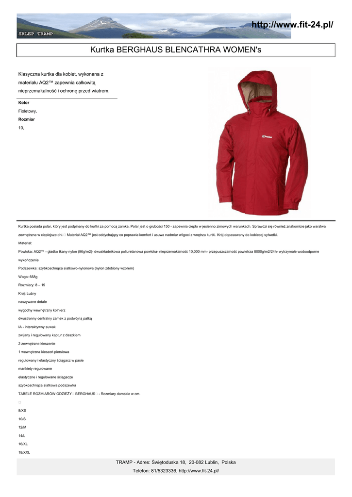 http://www.fit-24.pl/ Kurtka BERGHAUS BLENCATHRA WOMEN's Klasyczna kurtka dla kobiet, wykonana z materiału AQ2™ zapewnia całkowitą nieprzemakalność i ochronę przed wiatrem. Kolor Fioletowy, Rozmiar 10, Kurtka posiada polar, który jest podpinany do kurtki za pomocą zamka. Polar jest o grubości 150 - zapewnia ciepło w jesienno zimowych warunkach. Sprawdzi się również znakomicie jako warstwa zewnętrzna w cieplejsze dni. Materiał AQ2™ jest oddychający co poprawia komfort i usuwa nadmiar wilgoci z wnętrza kurtki. Krój dopasowany do kobiecej sylwetki. Materiał: Powłoka: AQ2™ - gładko tkany nylon (96g/m2)- dwuskładnikowa poliuretanowa powłoka- nieprzemakalność 10,000 mm- przepuszczalność powietrza 8000g/m2/24h- wytrzymałe wodoodporne wykończenie Podszewka: szybkoschnąca siatkowo-nylonowa (nylon zdobiony wzorem) Waga: 668g Rozmiary: 8 – 19 Krój: Luźny naszywane detale wygodny wewnętrzny kołnierz dwustronny centralny zamek z podwójną patką IA - interaktywny suwak zwijany i regulowany kaptur z daszkiem 2 zewnętrzne kieszenie 1 wewnętrzna kieszeń piersiowa regulowany i elastyczny ściągacz w pasie mankiety regulowane elastyczne i regulowane ściągacze szybkoschnąca siatkowa podszewka TABELE ROZMIARÓW ODZIEŻY BERGHAUS - Rozmiary damskie w cm. 8/XS 10/S 12/M 14/L 16/XL 18/XXL TRAMP - Adres: Świętoduska 18, 20-082 Lublin, Polska Telefon: 81/5323336, http://www.fit-24.pl/ KLATKA PIERSIOWA http://www.fit-24.pl/ 81 86 92 97 102 107 TALIA 61 66 70 74 79 81 BIODRA 89 94 99 104 109 114 DŁUGOŚĆ NOGI WEW. 75 77 79 80 81 82 DŁUGOŚĆ RĘKI WEW. 72 74 77 78 80 81 TRAMP - Adres: Świętoduska 18, 20-082 Lublin, Polska Telefon: 81/5323336, http://www.fit-24.pl/ http://www.fit-24.pl/ TRAMP - Adres: Świętoduska 18, 20-082 Lublin, Polska Telefon: 81/5323336, http://www.fit-24.pl/