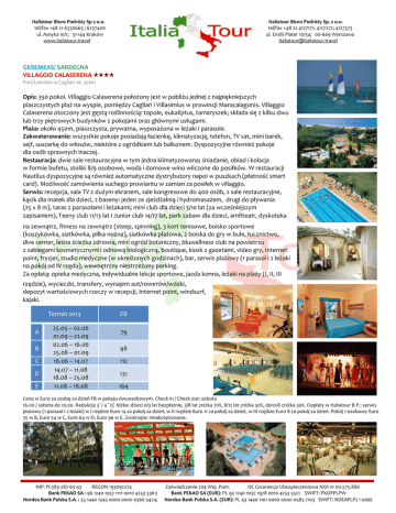 Italiatour Biuro Podróży Sp z o.o. tel/fax +48 12 6330663 ; 6237400 ul. Asnyka 10/1; 31-144 Kraków www.italiatour.travel Italiatour Biuro Podróży Sp. z o.o. tel/fax +48 22 4127171; 4127272; 4127373 ul. Emilii Plater 10/54; 00-669 Warszawa [email protected] GEREMEAS/ SARDEGNA VILLAGGIO CALASERENA Port/Lotnisko w Cagliari ok. 35km Opis: 350 pokoi. Villaggio Calaserena położony jest w pobliżu jednej z najpiękniejszych piaszczystych plaż na wyspie, pomiędzy Cagliari i Villasimius w prowincji Maracalagonis. Villaggio Calaserena otoczony jest gęstą roślinnością: topole, eukaliptus, tamaryszek; składa się z kilku dwu lub trzy piętrowych budynków z pokojami oraz głównymi usługami. Plaża: około 450m, piaszczysta, prywatna, wyposażona w leżaki i parasole. Zakwaterowanie: wszystkie pokoje posiadają łazienkę, klimatyzację, telefon, TV sat, mini barek, sejf, suszarkę do włosów, niektóre z ogródkiem lub balkonem. Dyspozycyjne również pokoje dla osób sprawnych inaczej. Restauracja: dwie sale restauracyjna w tym jedna klimatyzowana; śniadanie, obiad i kolacja w formie bufetu, stoliki 8/9 osobowe, woda i domowe wino wliczone do posiłków. W restauracji Nautilus dyspozycyjne są również automatyczne dystrybutory napoi w puszkach (płatność smart card). Możliwość zamówienia suchego prowiantu w zamian za posiłek w villaggio. Serwis: recepcja, sala TV z dużym ekranem, sale kongresowe do 400 osób, 2 sale restauracyjne, kącik dla matek dla dzieci, 2 baseny: jeden ze zjeżdżalnią i hydromasażem, drugi do pływania (25 x 8 m), taras z parasolami i leżakami; mini club dla dzieci 3/10 lat (za wcześniejszym zapisaniem), Teeny club 11/13 lat i Junior club 14/17 lat, park zabaw dla dzieci, amfiteatr, dyskoteka na zewnątrz, fitness na zewnątrz (steep, spinning), 3 kort tenisowe, boisko sportowe (koszykówka, siatkówka, piłka nożna), siatkówka plażowa, 2 boiska do gry w bule, łucznictwo, dive center, leśna ścieżka zdrowia, mini ogród botaniczny, bluwellness club na powietrzu z zabiegami kosmetycznymi i odnową biologiczną, boutique, kiosk z gazetami, video gry, Internet point, fryzjer, studio medyczne (w określonych godzinach), bar, serwis plażowy (1 parasol i 2 leżaki na pokój od IV rzędu), wewnętrzny niestrzeżony parking. Za opłatą: opieka medyczna, indywidualne lekcje sportowe, jazda konna, leżaki na plaży (I, II, III rzędzie), wycieczki, transfery, wynajem aut/rowerów/wózki, depozyt wartościowych rzeczy w recepcji, Internet point, windsurf, kajaki. Termin 2013 A B C D E 25.05 – 02.06 01.09 – 22.09 02.06 – 16.06 25.08 – 01.09 16.06 – 14.07 14.07 – 11.08 18.08 – 25.08 11.08 – 18.08 FB 79 98 112 131 164 Cena w Euro za osobę za dzień FB w pokoju dwuosobowym. Check in / Check out: sobota 16.00 / sobota do 10.00. edukcje 3 / 4 /5 łóżka: dzieci 0/3 lat bezpłatnie, 3/8 lat zniżka 70%, 8/12 lat zniżka 50%, dorośli zniżka 30%. Dopłaty w Italiatour B.P.: serwis plażowy (1 parasol i 2 leżaki) w I rzędzie Euro 14 za pokój za dzień, w II rzędzie Euro 11 za pokój za dzień, w III rzędzie Euro 8 za pokój za dzień. Pokój 1-osobowy Euro 35 w B, Euro 54 w C, Euro 64 w D, Euro 96 w E. Zwierzęta: nieakceptowane. NIP: PL583-287-63-43 REGON 193092274 Bank PEKAO SA : 96 1240 1037 1111 0010 4253 5361; Nordea Bank Polska S.A. : 33 1440 1345 0000 0000 0360 3474; Zaświadczenie 204 Woj. Pom. OC Gwarancja Ubezpieczeniowa AXA nr 00.575.886 Bank PEKAO SA (EUR): PL 93 1240 1037 1978 0010 4253 5521 SWIFT: PKOPPLPW Nordea Bank Polska S.A. (EUR): PL 43 1440 1101 0000 0000 0583 7103 SWIFT: NDEAPLP2 I oddz