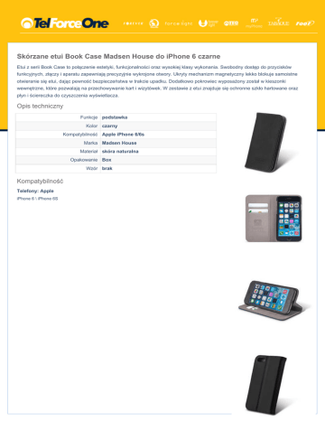 Skórzane etui Book Case Madsen House do iPhone 6 czarne Etui z serii Book Case to połączenie estetyki, funkcjonalności oraz wysokiej klasy wykonania. Swobodny dostęp do przycisków funkcyjnych, złączy i aparatu zapewniają precyzyjnie wykrojone otwory. Ukryty mechanizm magnetyczny lekko blokuje samoistne otwieranie się etui, dając pewność bezpieczeństwa w trakcie upadku. Dodatkowo pokrowiec wyposażony został w kieszonki wewnętrzne, które pozwalają na przechowywanie kart i wizytówek. W zestawie z etui znajduje się ochronne szkło hartowane oraz płyn i ściereczka do czyszczenia wyświetlacza. Opis techniczny Funkcje podstawka Kolor czarny Kompatybilność Apple iPhone 6/6s Marka Madsen House Materiał skóra naturalna Opakowanie Box Wzór brak Kompatybilność Telefony: Apple iPhone 6 \ iPhone 6S