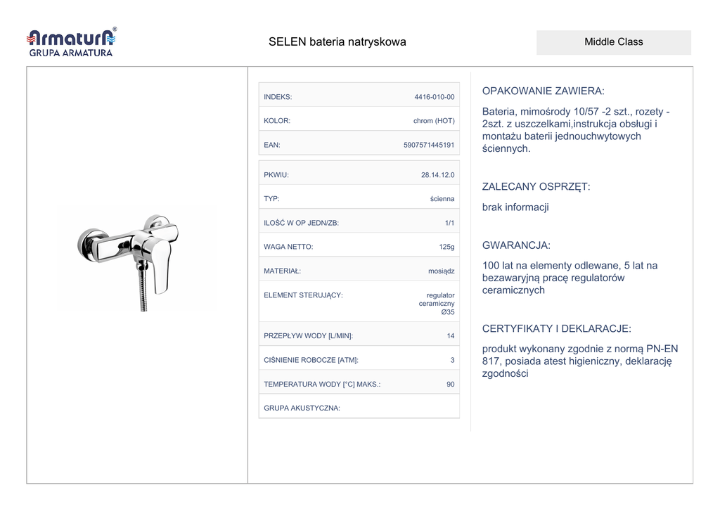 SELEN bateria natryskowa Middle Class INDEKS: 4416-010-00 KOLOR: chrom (HOT) EAN: PKWIU: 5907571445191 OPAKOWANIE ZAWIERA: Bateria, mimośrody 10/57 -2 szt., rozety 2szt. z uszczelkami,instrukcja obsługi i montażu baterii jednouchwytowych ściennych. 28.14.12.0 ZALECANY OSPRZĘT: TYP: ścienna brak informacji ILOŚĆ W OP JEDN/ZB: WAGA NETTO: MATERIAŁ: ELEMENT STERUJĄCY: PRZEPŁYW WODY [L/MIN]: CIŚNIENIE ROBOCZE [ATM]: TEMPERATURA WODY [°C] MAKS.: GRUPA AKUSTYCZNA: 1/1 125g mosiądz regulator ceramiczny Ø35 14 3 90 GWARANCJA: 100 lat na elementy odlewane, 5 lat na bezawaryjną pracę regulatorów ceramicznych CERTYFIKATY I DEKLARACJE: produkt wykonany zgodnie z normą PN-EN 817, posiada atest higieniczny, deklarację zgodności SELEN bateria natryskowa Middle Class