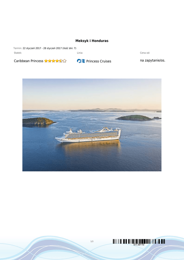 Meksyk i Honduras Termin: 22 styczeń 2017 - 28 styczeń 2017 (ilość dni: 7) Statek: Caribbean Princess Linia: Cena od: Princess Cruises na zapytanie/os. 1/3 EV:39110 TRASA REJSU Data Port Wpłynięcie Wypłynięcie niedziela 22.01.2017 Fort Lauderdale, Floryda --:-- 16:00 dzień 2 poniedziałek 23.01.2017 Dzień na morzu --:-- --:-- dzień 3 wtorek 24.01.2017 Cozumel 08:00 17:00 08:00 17:00 07:00 17:00 dzień 1 dzień 4 Stany Zjednoczone Meksyk Roatan środa 25.01.2017 Honduras czwartek 26.01.2017 Costa Maya dzień 6 piątek 27.01.2017 Dzień na morzu --:-- --:-- dzień 7 sobota 28.01.2017 Fort Lauderdale, Floryda 07:00 --:-- dzień 5 Legenda Meksyk Stany Zjednoczone CENNIK Cena katalogowa Kabina wewnętrzna od 3 008.87zł Kabina zewnętrzna z oknem od 3 704.19zł Kabina zewnętrzna z balkonem od 4 167.74zł Suite (apartament) od 5 094.85zł Kabina jednoosobowa na zapytanie 3 i 4 osoba dorosła w kabinie dziecko od 2 do 17 lat jako 3 i 4 osoba w kabinie Opłaty portowe Cena promocyjna 1 512.86zł - 3 999.18zł na zapytanie 463.55zł Uwaga! Ceny za osobę w kabinie dwuosobowej. Uwaga! 2/3 EV:39110 Podane ceny są cenami orientacyjnymi i ulegają zmianom. Dokładne informacje na zapytanie. Cena zawiera: zakwaterowanie w kabinie wybranej kategorii; wyżywienie - 3 główne posiłki, przekąski między posiłkami, bufet lub przekąski o północy; napoje serwowane do śniadania i w bufetach samoobsługowych; serwis bagażowy podczas wejścia i zejścia ze statku; serwis kabinowy; korzystanie ze wszystkich urządzeń sportowo - rekreacyjnych znajdujących się na pokładzie statku (basen, jacuzzi, sala fitness, itp.); udział we wszystkich imprezach organizowanych na statku (przedstawienia w teatrze, koncerty, programy animacyjne itp.). Cena nie zawiera: kosztów dojazdu do portu; ewentualnych noclegów w hotelu przed/po rejsie i transferów; wycieczek fakultatywnych w trakcie rejsu; korzystania z barów, mini baru w kabinie oraz napojów zamawianych w restauracji; korzystania z punktów usługowych (fryzjer, pralnia, fotograf, salon piękności i odnowy biologicznej, internet) i wydatków osobistych; napiwków dla obsługi na statku (kwota uzależniona od długości rejsu); ubezpieczenia KL, NNW i bagaż, kosztów wiz (tam gdzie wymagane). 3/3 EV:39110