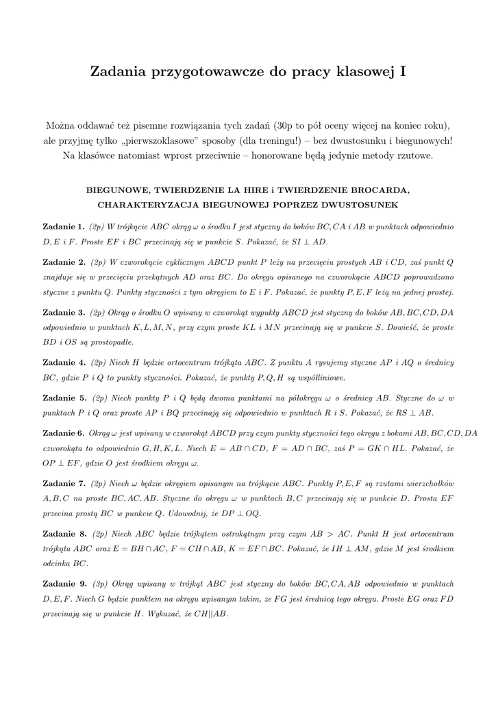 Zadania przygotowawcze do pracy klasowej I Można oddawać też pisemne rozwiązania tych zadań (30p to pół oceny więcej na koniec roku), ale przyjmę tylko „pierwszoklasowe” sposoby (dla treningu!) – bez dwustosunku i biegunowych! Na klasówce natomiast wprost przeciwnie – honorowane będą jedynie metody rzutowe. BIEGUNOWE, TWIERDZENIE LA HIRE i TWIERDZENIE BROCARDA, CHARAKTERYZACJA BIEGUNOWEJ POPRZEZ DWUSTOSUNEK Zadanie 1. (2p) W trójkącie ABC okrąg ω o środku I jest styczny do boków BC, CA i AB w punktach odpowiednio D, E i F . Proste EF i BC przecinają się w punkcie S. Pokazać, że SI ⊥ AD. Zadanie 2. (2p) W czworokącie cyklicznym ABCD punkt P leży na przecięciu prostych AB i CD, zaś punkt Q znajduje się w przecięciu przekątnych AD oraz BC. Do okręgu opisanego na czworokącie ABCD poprowadzono styczne z punktu Q. Punkty styczności z tym okręgiem to E i F . Pokazać, że punkty P, E, F leżą na jednej prostej. Zadanie 3. (2p) Okrąg o środku O wpisany w czworokąt wypukły ABCD jest styczny do boków AB, BC, CD, DA odpowiednio w punktach K, L, M, N , przy czym proste KL i M N przecinają się w punkcie S. Dowieść, że proste BD i OS są prostopadłe. Zadanie 4. (2p) Niech H będzie ortocentrum trójkąta ABC. Z punktu A rysujemy styczne AP i AQ o średnicy BC, gdzie P i Q to punkty styczności. Pokazać, że punkty P, Q, H są współliniowe. Zadanie 5. (2p) Niech punkty P i Q będą dwoma punktami na półokręgu ω o średnicy AB. Styczne do ω w punktach P i Q oraz proste AP i BQ przecinają się odpowiednio w punktach R i S. Pokazać, że RS ⊥ AB. Zadanie 6. Okrąg ω jest wpisany w czworokąt ABCD przy czym punkty styczności tego okręgu z bokami AB, BC, CD, DA czworokąta to odpowiednio G, H, K, L. Niech E = AB ∩ CD, F = AD ∩ BC, zaś P = GK ∩ HL. Pokazać, że OP ⊥ EF , gdzie O jest środkiem okręgu ω. Zadanie 7. (2p) Niech ω będzie okręgiem opisanym na trójkącie ABC. Punkty P, E, F są rzutami wierzchołków A, B, C na proste BC, AC, AB. Styczne do okręgu ω w punktach B, C przecinają się w punkcie D. Prosta EF przecina prostą BC w punkcie Q. Udowodnij, że DP ⊥ OQ. Zadanie 8. (2p) Niech ABC będzie trójkątem ostrokątnym przy czym AB > AC. Punkt H jest ortocentrum trójkąta ABC oraz E = BH ∩ AC, F = CH ∩ AB, K = EF ∩ BC. Pokazać, że IH ⊥ AM , gdzie M jest środkiem odcinka BC. Zadanie 9. (3p) Okrąg wpisany w trójkąt ABC jest styczny do boków BC, CA, AB odpowiednio w punktach D, E, F . Niech G będzie punktem na okręgu wpisanym takim, ze F G jest średnicą tego okręgu. Proste EG oraz F D przecinają się w punkcie H. Wykazać, że CH||AB. Zadanie 10. (3p) W trójkąt ABC wpisano okrąg o środku I, styczny do boków AC, AB odpowiednio w punktach E, F . Prosta przechodząca przez punkt C przecina AB oraz EF odpowiednio w punktach M, N . Proste M E oraz CF przecinają się w punkcie J. Udowodnij, że AJ ⊥ IN . Zadanie 11. (3p) Czworokąt ABCD jest wpisany w okrąg o środku O. Okręgi opisane na trójkątach AOD oraz BOC przecinają się ponownie w K (różnym od O). Niech E będzie punktem przecięcia prostych AB i CD. Prosta EK przecina okrąg (BOC) po raz drugi w P (różnym od K). Pokazać, że prosta P C jest styczna do okręgu opisanego na czworokącie ABCD. Zadanie 12. (3p) Dany jest okrąg ω o średnicy AB i środku O. Punkt C leży na zewnątrz okręgu ω na prostej AB. Przez C prowadzimy prostą przecinającą okrąg ω w punktach D oraz E (CD < CE). Niech ω1 będzie okręgiem opisanym na trójkącie OBD o środku O1 . Punkt F jest odbiciem symetrycznym O względem O1 . Prosta CF przecina okrąg ω1 ponownie w punkcie G (różnym od F ). Pokazać, że jeśli K = AE ∩ BD, to punkty K, G, O leżą na jednej prostej. Zadanie 13. (3p) Dany jest trójkąt ostrokątny ABC, którego ortocentrum to punkt H. Niech K będzie pewnym punktem na odcinku CD. Punkt S leży na prostej HK i ma tę własność, że AS ⊥ HK. Proste EF i AH przecinają się w punkcie I. Prosta prostopadła do AK przechodząca przez punkt H przecina AK w punkcie L. Pokazać, że punkty S, I, L leżą na jednej prostej. Zadanie 14. (*) Niech ABC będzie trójkątem, w którym AB 6= AC. Punkty K, L, M są środkami boków BC, CA i AB. Okrąg wpisany w trójkąt ABC o środku I jest styczny do prostej BC w punkcie D. Prosta przechodząca przez środek odcinka ID, prostopadła do IK, przecina prostą LM w punkcie P . Pokazać, że ∡P IA = 90◦ . To zadanie z MEMO 2016. Można je zrobić używając naszego lematu o biegunie linii środkowej (wciąż nikt tego nie zrobił!). Wsk.: znaleźć biegunową punktu P Zadanie 15. (*) Czworokąt wypukły ABCD, w którym AC 6= BD jest wpisany w okrąg o środku O. Niech E będzie punktem przecięcia przekątnych AC i BD. Punkt P wewnątrz czworokąta ABCD ma tę własność, że ∡P AB + ∡P CB = ∡P BC + ∡P DC = 90◦ . Udowodnić, że proste O, P, E są współliniowe. DWUSTOSUNEK, CZWÓRKA HARMONICZNA I KONFIGURACJE Z NIĄ ZWIĄZANE Zadanie 16. (2p) W trójkącie ABC punkt D jest przecięciem dwusiecznej kąta BAC z prostą BC. Rzuty punktów B oraz C na prostą AD oznaczamy jako H oraz G. Pokazać, że (A, D; H, G) = −1. Zadanie 17. (2p) Okrąg wpisany w trójkąt ABC jest styczny do boków BC, CA, AB w punktach D, E, F . Punkty A′ , B ′ są środkami boków BC, CA tego trójkąta. Punkt Y leży na przecięciu prostych A′ B ′ oraz EF . Pokazać, że Y (D, F ; B, C) = −1. Zadanie 18. (2p) W trójkącie ABC (AB 6= AC) punkt D jest spodkiem wysokości opuszczonej z wierzchołka A na podstawę BC. Punkty E, F leżą odpowiednio na bokach AC i AB tak, że proste AD, BE, CF przecinają się w jednym punkcie. Pokazać, że ∡ADF = ∡EDA. Zadanie 19. (2p) W trójkąt ABC wpisano okrąg o środku I, styczny do boków BC, AC, AB tego trójkąta w punktach D, E, F . Prosta BI przecina się z prostą EF w punkcie S. Pokazać, że BS ⊥ CS. Zadanie 20. (2p) Niech L, M, 