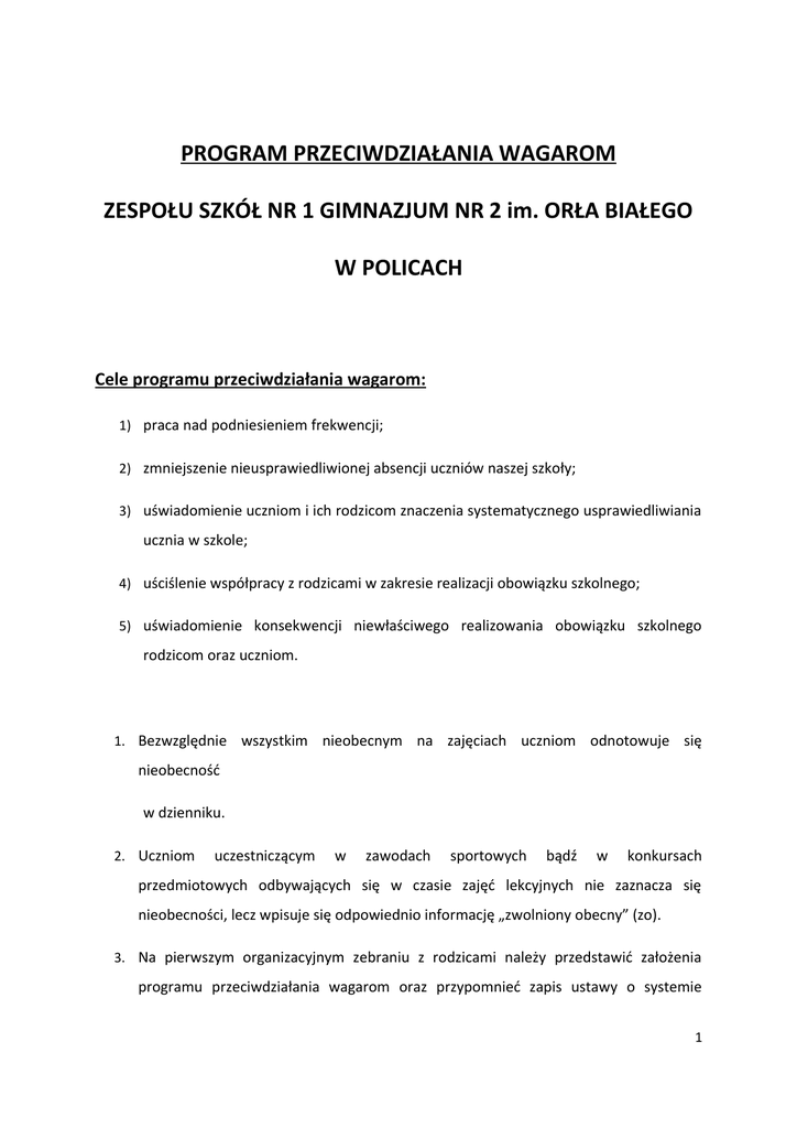 PROGRAM PRZECIWDZIAŁANIA WAGAROM ZESPOŁU SZKÓŁ NR 1 GIMNAZJUM NR 2 im. ORŁA BIAŁEGO W POLICACH Cele programu przeciwdziałania wagarom: 1) praca nad podniesieniem frekwencji; 2) zmniejszenie nieusprawiedliwionej absencji uczniów naszej szkoły; 3) uświadomienie uczniom i ich rodzicom znaczenia systematycznego usprawiedliwiania ucznia w szkole; 4) uściślenie współpracy z rodzicami w zakresie realizacji obowiązku szkolnego; 5) uświadomienie konsekwencji niewłaściwego realizowania obowiązku szkolnego rodzicom oraz uczniom. 1. Bezwzględnie wszystkim nieobecnym na zajęciach uczniom odnotowuje się nieobecność w dzienniku. 2. Uczniom uczestniczącym w zawodach sportowych bądź w konkursach przedmiotowych odbywających się w czasie zajęć lekcyjnych nie zaznacza się nieobecności, lecz wpisuje się odpowiednio informację „zwolniony obecny” (zo). 3. Na pierwszym organizacyjnym zebraniu z rodzicami należy przedstawić założenia programu przeciwdziałania wagarom oraz przypomnieć zapis ustawy o systemie 1 oświaty w sprawie realizowania obowiązku szkolnego. Po zapoznaniu sporządzić listę obecności rodziców uczestniczących w zebraniu wraz z ich podpisami. 4. Wychowawca ustala z rodzicami sposoby kontaktowania się: telefoniczne, pisemne, w kontakcie bezpośrednim. 5. Usprawiedliwianie nieobecności ucznia na zajęciach dokonywane jest pisemnie przez rodziców najpóźniej do tygodnia od powrotu ucznia do szkoły. Usprawiedliwienia dostarczone w późniejszym terminie nie są uznawane. 6. Rodzic jest zobowiązany w usprawiedliwieniu podać przyczynę nieobecności dziecka (spowodowaną chorobą lub ważną przyczyną losową). 7. Dowodem usprawiedliwiającym nieobecność ucznia na zajęciach może być zaświadczenie lekarskie lub inny dokument wystawiony przez upoważnioną osobę, zatrudnioną w instytucji, w której stawiennictwo ucznia w czasie trwania zajęć było niezbędne. 8. Uczeń we wsparciu rodzica, którego nieobecność w szkole przekracza miesiąc, po ustaniu przyczyny nieobecności, uzgadnia z nauczycielami poszczególnych przedmiotów zakres i sposób uzupełnienia wiedzy oraz terminy i formy jej zaprezentowania. 9. Rodzic jest zobowiązany ściśle współpracować z wychowawcą lub pedagogiem w celu kontroli frekwencji ucznia. 10. Uczeń może być zwolniony z zajęć lekcyjnych przez wychowawcę, z jego inicjatywy lub inicjatywy innego nauczyciela posiadającego zgodę rodziców, w przypadku udziału ucznia w: a) imprezach sportowych; b) konkursach przedmiotowych; c) wycieczkach szkolnych; d) imprezach, gdzie reprezentuje Gimnazjum nr 2 im. Orła Białego w Policach. 2 11. Wniosek nauczyciela o zwolnienie ucznia z zajęć lekcyjnych w okolicznościach, o których mowa w ust. 10., dokonywane jest na piśmie i przekazywane wychowawcy. Wychowawca odnotowuje ten fakt w dzienniku elektronicznym ( zwolniony obecny), co stanowi podstawę do nieodnotowywania nieobecności ucznia na zajęciach lekcyjnych przez innych nauczycieli. 12. Jeśli uczeń chce się zwolnić z ostatnich lekcji w danym dniu, jest zobowiązany do przedłożenia pisemnej informacji ( na kartce lub w dzienniku elektronicznym) od rodzica lub prawnego opiekuna potwierdzającej fakt zwolnienia z podaniem jego przyczyny, daty oraz dokładnej godziny jego zwolnienia. 13. Uczeń może być zwolniony przez wychowawcę z części zajęć szkolnych w danym dniu na podstawie pisemnego wniosku jego rodziców lub opiekunów prawnych. Rodzic/prawny opiekun jest zobowiązany do osobistego odbioru dziecka lub zapisanie we wniosku zgody na samodzielne opuszczenie szkoły i wzięcia odpowiedzialności za dziecko w tym czasie. (Załącznik nr 1) 14. W przypadku nieobecności wychowawcy w szkole zwolnienia ucznia następują zgodnie z procedurami obowią części zajęć, o których mowa w ust. 11-13, dokonuje inny nauczyciel lub pedagog czy wicedyrektor, powiadamiając wychowawcę i sekretariat. 15. Wychowawca systematycznie analizuje frekwencję uczniów. Wraz z pedagogiem podejmuje działania zapobiegające absencji w klasie. 16. Wyznaczony uczeń z każdej klasy po pierwszej godzinie lekcyjnej ma obowiązek dostarczenia do sekretariatu informacji o uczniach nieobecnych w danym dniu. 17. Wychowawca wzywa na spotkanie indywidualne rodzica/prawnego opiekuna, którego dziecko wybiórczo opuszcza zajęcia lub jego nieobecność jest dłuższa niż 10 dni nauki. 3 W przypadku ponownego powtórzenia się wyżej opisanej sytuacji wychowawca sporządza pisemną informację o uczniu i przekazuje ją pedagogowi szkolnemu. 18. Rodzic jest ponownie wzywany na spotkanie przez pedagoga szkolnego, które odbywa się w obecności wychowawcy. Na spotkaniu rodzic zostaje poinformowany o zagrożeniach i konsekwencjach niewywiązywania się z obowiązku szkolnego przez jego dziecko. 19. W przypadku braku kontaktu z rodzicem/ prawnym opiekunem lub nieskuteczności wcześniejszych działań wychowawca wysyła przez sekretariat /za potwierdzeniem odbioru/ do rodzica/prawnego opiekuna /podpisane przez dyrektora szkoły/ upomnienie do realizacji obowiązku szkolnego przez dziecko i powiadamia o tym fakcie pedagoga szkolnego. 20. Jeśli nieobecność nieusprawiedliwiona trwa kolejny tydzień, wychowawca powiadamia o tym fakcie dyrektora szkoły, który wszczyna postępowanie egzekucyjne w zakresie dopełnienia obowiązku szkolnego. 21. Na podstawie pisemnej opinii wychowawcy, w porozumieniu z komisją wychowawczą, szkoła może skierować wniosek do sądu o wgląd w sytuację rodzinną ucznia oraz przystąpić do wszczęcia postępowania administracyjnego. Załącznik nr 1 Proszę o zwolnienie mojej córki /syna ………………………………………………………………………….. w dniu …………………………. o godzinie ………………………………. z zajęć lekcyjnych z powodu…………………………………………………………... Wyrażam zgodę, aby córka/syn sam