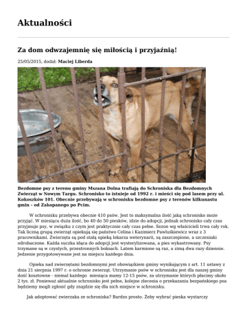 Aktualności Za dom odwzajemnię się miłością i przyjaźnią! 25/05/2015, dodał: Maciej Liberda Bezdomne psy z terenu gminy Mszana Dolna trafiają do Schroniska dla Bezdomnych Zwierząt w Nowym Targu. Schronisko to istnieje od 1992 r. i mieści się pod lasem przy ul. Kokoszków 101. Obecnie przebywają w schronisku bezdomne psy z terenów kilkunastu gmin - od Zakopanego po Pcim. W schronisku przebywa obecnie 410 psów. Jest to maksymalna ilość jaką schronisko może przyjąć. W miesiącu duża ilość, bo 40 do 50 piesków, idzie do adopcji, jednak schronisko cały czas przyjmuje psy, w związku z czym jest praktycznie cały czas pełne. Sezon wg właścicieli trwa cały rok. Tak liczną grupą zwierząt opiekują się państwo Celina i Kazimierz Pawluśkiewicz wraz z 3 pracownikami. Zwierzęta są pod stałą opieką lekarza weterynarii, są zaszczepione, a szczeniaki odrobaczone. Każda suczka idąca do adopcji jest wysterylizowana, a pies wykastrowany. Psy trzymane są w czystych, przestronnych boksach. Latem karmione są raz, a zimą dwa razy dziennie. Jedzenie przygotowywane jest na miejscu każdego dnia. Opieka nad zwierzętami bezdomnymi jest obowiązkiem gminy wynikającym z art. 11 ustawy z dnia 21 sierpnia 1997 r. o ochronie zwierząt. Utrzymanie psów w schronisku jest dla naszej gminy dość kosztowne - niemal każdego miesiąca mamy 12-15 psów, za utrzymanie których płacimy około 2 tys. zł. Ponieważ aktualnie schronisko jest pełne, kolejne zlecenia o przekazaniu bezpańskiego psa będziemy mogli zgłosić gdy znajdzie się dla nich miejsce w schronisku. Jak adoptować zwierzaka ze schroniska? Bardzo prosto. Żeby wybrać pieska wystarczy przyjechać do schroniska od poniedziałku do soboty w godz. 8.30-15.00. Adoptować może osoba pełnoletnia – w schronisku musi przedstawić swój dowód osobisty. Można zabrać ze sobą obrożę i smycz, ale jeśli ktoś nie posiada schronisko wyda psa z własną smyczą. Oczywiście za psa nie trzeba nic płacić, podpisuje się tylko zobowiązanie do opieki nad zwierzakiem. Gdyby okazało się, że piesek nie spełnia oczekiwań do miesiąca można zwrócić go i poszukać innego. Zachęcamy do adopcji psów ze schroniska, zwłaszcza tych z terenu naszej gminy. Na naszej stronie www.mszana.pl/ w zakładce „Zwierzaki do adopcji” zamieszczane są zdjęcia bezdomnych psów znalezionych na terenie naszej gminy. Utworzyliśmy także na Facebooku grupę: Zaginione/Znalezione zwierzęta - Mszana Dolna i okolice. Można też zajrzeć na stronę schroniska www.pieski.nowytarg.pl albo na fejsbukowy profil schroniska www.facebook.com/schronisko.nowytarg. Prosimy o udostępnianie i „lajkowanie” powyższych stron, bo dzięki temu może uda się znaleźć właściciela dla kolejnego czworonoga. W schronisku nie brakuje wspaniałych psiaków, naprawdę jest w czym wybierać i na pewno każdy chętny znajdzie dla siebie wiernego przyjaciela. W trakcie naszej wizyty w schronisku jeden z naszych piesków przypadł do gustu nowym właścicielom. Cieszymy się, że znalazł dom i wierzymy, że szybko odwzajemni się za wybór spośród 400 innych psiaków. Niestety, nie każdy może i nie każdy powinien mieć psa. Do adopcji należy być mocno przekonanym, bo jest to też wyzwanie i obowiązek, o czym należy pamiętać decydując się na przygarnięcie nowego przyjaciela. Warto tez pamiętać, że "adoptując jednego psa nie zmienisz całego świata, ale zmienisz świat tego psa", bo z perspektywy czterech łap, schroniska to nie przytulne hoteliki ale psie więzienia i tam każdy czworonóg szczekając zwraca na siebie uwagę i prosi, aby go stamtąd zabrać i przygarnąć.
