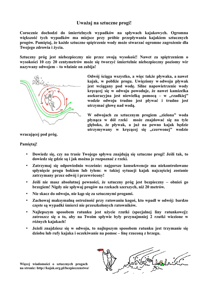 Uważaj na sztuczne progi! Corocznie dochodzi do śmiertelnych wypadków na spływach kajakowych. Ogromna większość tych wypadków ma miejsce przy próbie przepływania kajakiem sztucznych progów. Pamiętaj, że każde sztuczne spiętrzenie wody może stwarzać ogromne zagrożenie dla Twojego zdrowia i życia. Sztuczny próg jest niebezpieczny nie przez swoją wysokość! Nawet za spiętrzeniem o wysokości 10 czy 20 centymetrów może się tworzyć śmiertelnie niebezpieczny poziomy wir nazywany odwojem – to właśnie on zabija! Odwój ściąga wszystko, a więc także pływaka, a nawet kajak, w pobliże progu. Uwięziony w odwoju pływak jest wciągany pod wodę. Silne napowietrzenie wody kręcącej się w odwoju powoduje, że nawet kamizelka asekuracyjna jest niewielką pomocą – w „rzadkiej” wodzie odwoju trudno jest pływać i trudno jest utrzymać głowę nad wodą. W odwojach za sztucznym progiem ,,zielona” woda płynąca w dół rzeki może znajdować się na tyle głęboko, że pływak, a już na pewno kajak będzie utrzymywany w kręcącej się ,,czerwonej” wodzie wracającej pod próg. Pamiętaj! • Dowiedz się, czy na trasie Twojego spływu znajdują się sztuczne progi! Jeśli tak, to dowiedz się gdzie są i jak można je rozpoznać z rzeki. • Zatrzymaj się odpowiednio wcześnie: najgorsze konsekwencje ma niekontrolowane spłynięcie progu bokiem lub tyłem: w takiej sytuacji kajak najczęściej zostanie zatrzymany przez odwój i przewrócony! • Jeśli nie masz absolutnej pewności, że sztuczny próg jest bezpieczny – obnieś go brzegiem! Nigdy nie spływaj progów na rzekach szerszych, niż 20 metrów. • Nie skacz do odwoju, nie kąp się za sztucznymi progami. • Zachowaj maksymalną ostrożność przy ratowaniu kogoś, kto wpadł w odwój: bardzo częste są wypadki śmierci nie przeszkolonych ratowników. • Najlepszym sposobem ratunku jest użycie rzutki (specjalnej liny ratunkowej): zatroszcz się o to, aby na Twoim spływie były przynajmniej 2 rzutki wiezione w różnych kajakach! • Jeżeli znajdziesz się w odwoju, to najlepszym sposobem ratunku jest trzymanie się dziobu lub rufy kajaka i oczekiwanie na pomoc – linę rzuconą z brzegu. Więcej wiadomości o sztucznych progach na stronie: http://kajak.org.pl/bezpieczenstwo/