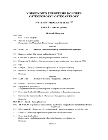 V ŚRODKOWO EUROPEJSKI KONGRES OSTEOPOROZY I OSTEOARTROZY WSTĘPNY PROGRAM SESJI (*) I DZIEŃ – 20.09.13 (piątek) Otwarcie Kongresu sesja godz. 9.00 - Część oficjalna L01 Wykład inauguracyjny: Papapoulos S. (Holandia): Novel therapy in osteoporosis Przerwa S01 10.20-11.55 Strategia zmniejszenia liczby złamań osteoporotycznych L02 Kanis J. (Anglia): The present and the future of FRAX L03 Czerwiński E. (Kraków): Zapobieganie powtórnemu złamaniu L04 Pluskiewicz W. (Zabrze): Rozpoznawanie pierwszego złamania – morfometria DXA L05 TBA L06 Lesnyuk O. (Rosja): Złamania osteoporotyczne w Europie Środkowej L07 Borowy P. (Kraków): Nowe trendy w epidemiologii złamań osteoporotycznych Dyskusja Przerwa S02 12.10-13.30 Postępy w leczeniu osteoporozy - AMGEN L08 Franek E. (Warszawa): Osteocyt a osteoporoza L09 Papapoulos S. (Holandia): Long-term treatment of postmenopausal osteoporosis with denosumab L10 Czerwiński E. (Kraków):Denosumab a bisfosfoniany w leczeniu osteoporozy L11 Marcinowska-Suchowierska E. (Warszawa): Osteoporoza u mężczyzn Dyskusja 13.30-14.30 Lunch - Sesja plakatowa S02 14.30-15.40 Współczesne spojrzenie na możliwości terapeutyczne ranelinianu strontu - SERVIER L12 Misiorowski W. (Warszawa): Ocena skuteczności terapii osteoporozy w ambulatorium L13 Lorenc R. (Warszawa):Spektrum terapeutyczne ranelinianu strontu L14 Czerwiński E. (Kraków): Zastosowanie ranelinianu strontu w leczeniu choroby zwyrodnieniowej Dyskusja Przerwa S04 15.55-17.25 Bisfosfoniany – blaski, cienie L15 Marcinowska – Suchowierska E. (Warszawa):Terapia szyta na miarę L16 Badurski J. (Białystok): Jak długo leczyć osteoporozę? L17 Sewerynek E. (Łódź): Powikłania po bisfosfonianach L18 Tłustochowicz W. (Warszawa): Terapia wielolekowa, a leczenie osteoporozy L19 Misiorowski W. (Warszawa): Bisfosfoniany w zmianach kostnych indukowanych chorobą nowotworową Dyskusja Przerwa S05 17.40-18.55 L20 Tałałaj M. (Warszawa): Suplementacja solami wapnia – bezpieczna czy nie? L21 Resch H. (Austria): Leczenie chorych ze złamaniami z prawidłowym BMD L22 Więcek A. (Katowice): Osteodystrofia nerkowa, postępowanie lecznicze L23 Jezierska-Kazberuk M. (Kraków): Finansowanie leczenia osteoporozy przez NFZ Dylematy w leczeniu osteoporozy Dyskusja 20.15 Bankiet– Radisson Park Inn II DZIEŃ – 21.09.13 (sobota) sesja S06 09.00-10.10 Zespół kruchości i upadki L24 Skalska A. (Kraków): Zespół kruchości, a złamania L25 Grodzicki T. (Kraków): Leki zwiększające ryzyko upadku L26 Kumorek A. (Kraków): Upadki – problem wciąż niedoceniany L27 TBA Dyskusja Przerwa S07 10.25-11.50 Choroba zwyrodnieniowa w praktyce codziennej L28 Badurski J. (Białystok): Cele leczenia osteoartrozy w świetle nowej wiedzy o patogenezie L29 Jabłoński M. (Lublin): Leki dostawowe w osteoartrozie L30 Górecki A. (Warszawa): Endoprotezy u chorych z zaawansowaną osteoporozą L31 Księżopolska-Orłowska K. (Warszawa): Miejsce rehabilitacji w osteoartrozie w świetle EBM Przerwa S08 12.05-13.30 Osteoporoza w praktyce L32 Płudowski P. (Warszawa): Wytyczne w suplementacji i leczeniu wit. D w Europie Środkowej L33 Głuszko P. (Warszawa): Aktualne zalecenia w postępowaniu w osteoporozie posterydowej L34 Leszczyński P. (Poznań): Terapia RZS a leczenie osteoporozy L35 Rell-Bakalarska M. (Warszawa): Najczęstsze błędy w diagnostyce i leczeniu osteoporozy L36 TBA Dyskusja 13.30-14.30 Lunch - Sesja plakatowa S09 14.35-15.35 Dyskusja okrągłego stołu – Jak leczyć osteoporozę w Polsce w aktualnej sytuacji ? Przewodniczący: Badurski J. (Białystok), Czerwiński E. (Kraków), Tłustochowicz W.(Warszawa), Marcinowska Suchowierska E. (Warszawa) Sewerynek E. (Łódź), Pluskiewicz W. (Zabrze), Przedlacki J. (Warszawa) Przerwa – Break S10 15.50-16.35 Spotkanie z ekspertem Badurski J. (Białystok): Warsztat przeciwbólowy w osteoartrozie i osteoporozie Marcinowska-Suchowierska E. (Warszawa): Suplementacja Ca i wit. D w osteoporozie Sawicki A. (Warszawa): Osteomalacja vs osteoporoza w praktyce S11 16.50-18.00 L37-L44 18.00 Tematy wolne Zamknięcie Kongresu SESJA SATELITARNA II DZIEŃ – 21.09.13 (sobota) 9.00-11.50 - Sesja Pediatryczna pod auspicjami Sekcji Chorób Metabolicznych Kości Dzieci i Młodzieży PFO 9.00-9.30 - Spotkanie Koordynatorów i Wykonawców wieloośrodkowego projektu badawczego realizowanego przez członków Sekcji L45 Chlebna Sokół D. (Łódź): Podsumowanie, spostrzeżenia, wnioski z wieloośrodkowego projektu badawczego dotyczącego zaopatrzenia populacji polskich dzieci w witaminę D L46 Kaczmarewicz E. (Warszawa): Wpływ stężenia 25-hydroxywitaminy D (25OH)D w surowicy na metabolizm kostny zdrowych dzieci polskich L47 Rusińska A. (Łódź): Najnowsze osiągnięcia w diagnostyce molekularnej i leczeniu wrodzonej łamliwości kości L48 Michałus I. (Łódź): Problemy diagnostyczne w ocenie jakości tkanki kostnej w okresie noworodkowym (w tym u dzieci urodzonych przedwcześnie L49 Konstantynowicz J. (Białystok): Praktyczne aspekty niskiej masy szkieletowej i złamań kości w okresie rozwojowym L50 Muszyńska-Rosłan K. (Białystok): Powikłania kostne w trakcie i po leczeniu w dzieciństwie choroby nowotworowej – czy można im przeciwdziałać L51 Jaworski M. (Warszawa): Skład tkanek miękkich i zależność mięsień-kość u dzieci z chorobami cywilizacyjnymi Dyskusja (*Komitet Naukowy zastrzega sobie możliwość wprowadzania zmian)