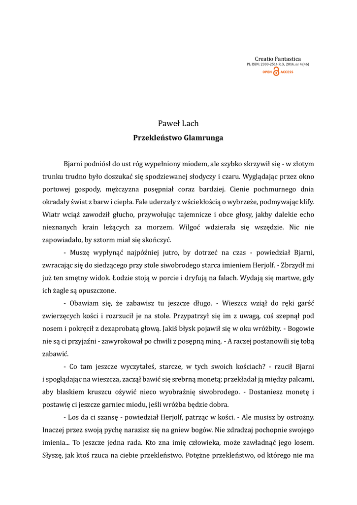 Creatio Fantastica PL ISSN: 2300-2514 R. X, 2014, nr 4 (46) Paweł Lach Przekleństwo Glamrunga Bjarni podniosł do ust rog wypełniony miodem, ale szybko skrzywił się - w złotym trunku trudno było doszukac się spodziewanej słodyczy i czaru. Wyglądając przez okno portowej gospody, męzczyzna posępniał coraz bardziej. Cienie pochmurnego dnia okradały swiat z barw i ciepła. Fale uderzały z wsciekłoscią o wybrzeze, podmywając klify. Wiatr wciąz zawodził głucho, przywołując tajemnicze i obce głosy, jakby dalekie echo nieznanych krain lezących za morzem. Wilgoc wdzierała się wszędzie. Nic nie zapowiadało, by sztorm miał się skonczyc. - Muszę wypłynąc najpozniej jutro, by dotrzec na czas - powiedział Bjarni, zwracając się do siedzącego przy stole siwobrodego starca imieniem Herjolf. - Zbrzydł mi juz ten smętny widok. Łodzie stoją w porcie i dryfują na falach. Wydają się martwe, gdy ich zagle są opuszczone. - Obawiam się, ze zabawisz tu jeszcze długo. - Wieszcz wziął do ręki garsc zwierzęcych kosci i rozrzucił je na stole. Przypatrzył się im z uwagą, cos szepnął pod nosem i pokręcił z dezaprobatą głową. Jakis błysk pojawił się w oku wrozbity. - Bogowie nie są ci przyjazni - zawyrokował po chwili z posępną miną. - A raczej postanowili się tobą zabawic. - Co tam jeszcze wyczytałes, starcze, w tych swoich kosciach? - rzucił Bjarni i spoglądając na wieszcza, zaczął bawic się srebrną monetą; przekładał ją między palcami, aby blaskiem kruszcu ozywic nieco wyobraznię siwobrodego. - Dostaniesz monetę i postawię ci jeszcze garniec miodu, jesli wrozba będzie dobra. - Los da ci szansę - powiedział Herjolf, patrząc w kosci. - Ale musisz by ostrozny. Inaczej przez swoją pychę narazisz się na gniew bogow. Nie zdradzaj pochopnie swojego imienia... To jeszcze jedna rada. Kto zna imię człowieka, moze zawładnąc jego losem. Słyszę, jak ktos rzuca na ciebie przeklenstwo. Potęzne przeklenstwo, od ktorego nie ma ucieczki, bo nie zrodziło się w ludzkim gardle. - Powiem tylko jedno - mruknął Bjarni, odwracając ze wstrętem wzrok od morza i podnosząc ponownie do ust rog z resztką niedopitego miodu. - Zasłuzyłes na srebrną monetę i garniec napitku. Inni, widząc sowitą zapłatę w garsci oczekującego na pomyslną przepowiednię, zaczęliby z chciwosci mowic o wielkich bogactwach, podbitych krolestwach i niekonczącym się pochodzie łaskawych kobiet. Przynajmniej masz dosc odwagi, by wyjawic prawdę... Albo niepochlebne kłamstwa! - Bjarni zasmiał się głosno. Mnie tam wszystko jedno. Nie bardzo przejmuję się wrozbami, choc lubię dla zartu słuchac krętactw wieszczących. Powiedz zatem, czy widzisz moze w swoich kosciach jakąs szansę na poprawę pogody? - Zaden okręt nie wypłynie przez trzy najblizsze dni, to pewne. Nie potrzebuję do tego wrozb. Ty takze. Nie w kosciach to zobaczyłem, ale w szarzejącym horyzoncie. Bjarni, spoglądając na ponure oblicza przechadzających się po porcie kupcow, jak i tych, ktorzy od dwoch dni nie ruszali się z karczmy, doskonale wiedział, ze to prawda. Nawet tutaj, gdzie blask migoczącego paleniska wypełniał blaskiem izbę, czuc było chłod i niepokoj. - Sprawa zatem stracona - powiedział Bjarni ze złoscią. - Trudno. Powiedz mi za to, czy jest w okolicy mozny pan, ktoremu mogłbym się przesłuzyc swym mieczem? Skoro nie zdązę tam, dokąd zmierzam, to moze chociaz znajdę sobie tutaj jakies zajęcie, ktore zabije nudę deszczowych dni? - Jarl Hagard, ktory włada okolicą, ma swoj dwor nad zatoką. To jakies trzy dni marszu wybrzezem, bo łodzią nie da rady się przeprawic, jak widzisz. Mogłbys tez... Starzec zawahał się. - Jest krotszy szlak, ktory prowadzi przez gory. To tylko dzien drogi. Nie radziłbym ci jednak obierac tej drogi. - A to czemu? - Nie słyszałes o Glamrungu? - Herjolf pochylił się nieco i zebrał swoje kosci do skorzanego woreczka. Imię wypowiedziane przed chwilą wywołało pewne poruszenie w gospodzie. Niektore twarze zbladły. Czesc z biesiadnikow zaczęła przypatrywac się Bjarnemu i wrozbicie z pewnym niepokojem. Bjarni, ktorego zwano Krukiem (z powodu czarnych włosow i brody), budził ich obawy, nie wyglądał bowiem, jak człowiek Połnocy. - Glamrung, mowisz? - Męzczyzna zaczął szukac w pamięci. Imię, ktore przywołał starzec, nie było mu całkowicie obce. - Mowiło się tu i owdzie o olbrzymie, noszącym takie imię. Chcesz powiedziec, ze wysłaniec Jutenheimu zamieszkał w tutejszych gorach? - zapytał Bjarni z niedowierzaniem. - Nie inaczej - przytaknął Herjolf. - Czas jest niespokojny. Bogowie mieszają się w sprawy ludzi, a nasze trakty nie są zbyt wąskie dla olbrzymow. Glamrung rozsmakował się teraz w ludzkim mięsie, przynajmniej odkąd pasterze przestali przepędzac swoje stada przez gory i zabrakło owiec. Raz na jaki czas znajdzie się jakis odwazny, albo głupi, ktory probuje przemknąc gorskim szlakiem. Zaden juz nie powrocił. Teraz to martwe pustkowie. Bjarni zaczął rozmyslac. - Mowiłes, ze czeka mnie chwała - odezwał się po chwili. - Moze to znak, ze warto sprobowac swych sił? Wyzwanie, jakiemu nie sprostał jeszcze nikt? To moze byc cos, co poprawi mi humor. - Chciałbys się zmierzyc z Glamrungiem? - Dlaczego nie? - odparł Bjarni. - Pora przypomniec o sobie skaldom. A jesli przyniosę na dwor jarla Hagarda głowę olbrzyma, ktory gnębi jego poddanych, nie ominie mnie pewnie nagroda. - Nie słuchałes widac moich przepowiedni z uwagą - powiedział starzec chytrze, chowając do woreczka kosci. - Los sprobuje z ciebie zadrwic. Lepiej nie szukac teraz wyzwan i zaszyc się w cichym kącie, gdzie wzrok bogow nie sięga. Poczekaj, az zapomną o tobie. A pewnie nastąpi to niebawem, bo panowie Asgaardu szybko się nudzą. Posiedz jeszcze w porcie tydzien lub dwa, a los moze się ponownie do ciebie usmiechnie. - Słuchałem twoich przepowiedni jedynie dla zartu - rzucił Bjarni. - Ja