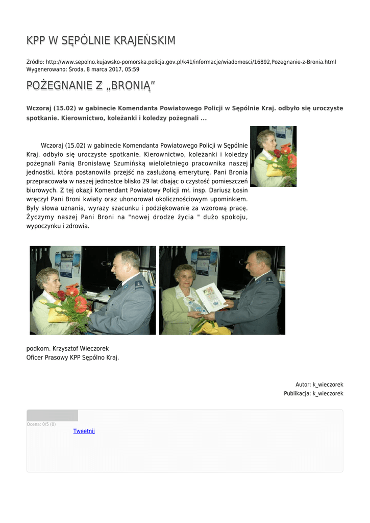 KPP W SĘPÓLNIE KRAJEŃSKIM Źródło: http://www.sepolno.kujawsko-pomorska.policja.gov.pl/k41/informacje/wiadomosci/16892,Pozegnanie-z-Bronia.html Wygenerowano: Środa, 8 marca 2017, 05:59 POŻEGNANIE Z „BRONIĄ” Wczoraj (15.02) w gabinecie Komendanta Powiatowego Policji w Sępólnie Kraj. odbyło się uroczyste spotkanie. Kierownictwo, koleżanki i koledzy pożegnali ... Wczoraj (15.02) w gabinecie Komendanta Powiatowego Policji w Sępólnie Kraj. odbyło się uroczyste spotkanie. Kierownictwo, koleżanki i koledzy pożegnali Panią Bronisławę Szumińską wieloletniego pracownika naszej jednostki, która postanowiła przejść na zasłużoną emeryturę. Pani Bronia przepracowała w naszej jednostce blisko 29 lat dbając o czystość pomieszczeń biurowych. Z tej okazji Komendant Powiatowy Policji mł. insp. Dariusz Łosin wręczył Pani Broni kwiaty oraz uhonorował okolicznościowym upominkiem. Były słowa uznania, wyrazy szacunku i podziękowanie za wzorową pracę. Życzymy naszej Pani Broni na "nowej drodze życia " dużo spokoju, wypoczynku i zdrowia. podkom. Krzysztof Wieczorek Oficer Prasowy KPP Sępólno Kraj. Autor: k_wieczorek Publikacja: k_wieczorek Ocena: 0/5 (0) Tweetnij