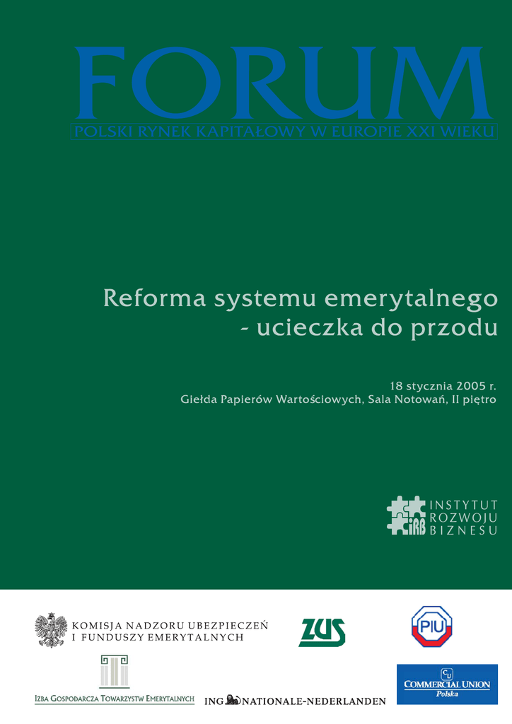 9.30 - 9.35 Otwarcie konferencji Izabela Jaruga-Nowacka - Wiceprezes Rady Ministrów, Minister Polityki Spo³ecznej 9.35 -10.00 WPROWADZENIE DO KONFERENCJI Stan reformy emerytalnej w Polsce na tle reform w œwiecie - wyzwania przysz³oœci Micha³ Rutkowski - Dyrektor ds. Polityki Spo³ecznej w Regionie Europy i Azji Œrodkowej w Banku Œwiatowym - wspó³twórca nowego systemu emerytalnego 10.00-10.20 O co chodzi w systemie emerytalnym: szanse jakie otworzy³a przed Polsk¹ reforma emerytalna - jak ich nie zaprzepaœciæ? Prof. Marek Góra - Szko³a G³ówna Handlowa - wspó³twórca nowego systemu emerytalnego 10.20-10.40 Przerwa na kawê 10.40-11.00 POWSZECHNY I OBOWI¥ZKOWY SYSTEM EMERYTALNY W POLSCE Co uda³o siê zrobiæ i co jest jeszcze do zrobienia w systemie emerytalnym Agnieszka Ch³oñ-Domiñczak - Podsekretarz Stanu w Ministerstwie Polityki Spo³ecznej 11.00-11.20 Jak fundusze emerytalne wykorzystuj¹ szanse pomno¿enia œrodków na przysz³e emerytury? Ewa Lewicka - Prezes Izby Gospodarczej Towarzystw Emerytalnych - by³a Pe³nomocnik Rz¹du ds. Reformy Zabezpieczenia Spo³ecznego 11.20-12. 10 Wyp³aty emerytur z II filara - porównanie mo¿liwych rozwi¹zañ Ryszard Petru - G³ówny Ekonomista Banku BPH SA Prof. Marek Góra - Szko³a G³ówna Handlowa - wspó³twórca nowego systemu emerytalnego Krzysztof Lutostañski - Prezes PTE BANKOWY SA Zygmunt Kostkiewicz - Pierwszy Wiceprezes Zarz¹du Commercial Union - Towarzystwo Ubezpieczeñ na ¯ycie SA 12.10 -12. 40 Dyskusja na temat powszechnego i obowi¹zkowego systemu emerytalnego 12.40 -13. 30 Przerwa na lunch 13.30 -13. 50 DOBROWOLNY I UZUPE£NIAJ¥CY SYSTEM EMERYTALNY W POLSCE III filar Prof. Jan Monkiewicz - Przewodnicz¹cy Komisji Nadzoru Ubezpieczeñ i Funduszy Emerytalnych 13.50 -14. 00 Przerwa na kawê 14.00 -14. 50 PANEL NA TEMAT IKE (INDYWIDUALNYCH KONT EMERYTALNYCH) Zbigniew Andrzejewski - Prezes Zarz¹du Grupy CU Polska Anita Bogusz - Cz³onek Zarz¹du, Dyrektor Departamentu Ubezpieczeñ Indywidualnych w Commercial Union Polska - Towarzystwo Ubezpieczeñ na ¯ycie SA Pawe³ Kalbarczyk - ING Nationale-Nederlanden Polska SA Prof. Tadeusz Szumlicz - Kierownik Katedry Ubezpieczenia Spo³ecznego w Szkole G³ównej Handlowej 14.50 -15. 00 Podsumowanie i zakoñczenie konferencji Prof. Jerzy Hausner - Wiceprezes Rady Ministrów, Minister Gospodarki i Pracy, by³y Pe³nomocnik Rz¹du ds. Reformy Zabezpieczenia Spo³ecznego