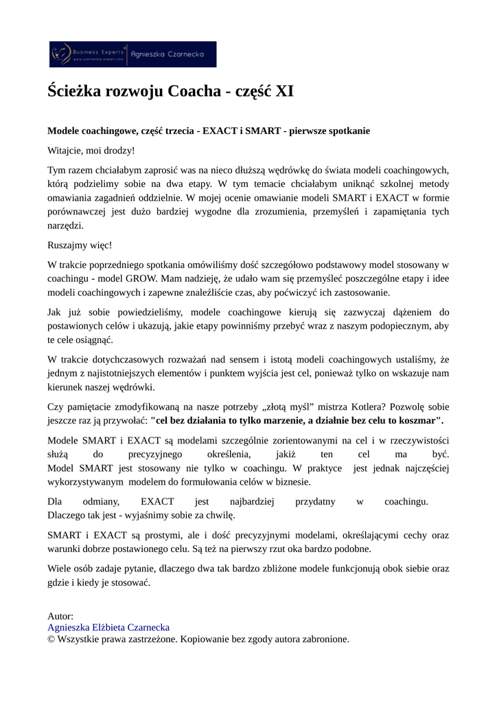 Ścieżka rozwoju Coacha - część XI Modele coachingowe, część trzecia - EXACT i SMART - pierwsze spotkanie Witajcie, moi drodzy! Tym razem chciałabym zaprosić was na nieco dłuższą wędrówkę do świata modeli coachingowych, którą podzielimy sobie na dwa etapy. W tym temacie chciałabym uniknąć szkolnej metody omawiania zagadnień oddzielnie. W mojej ocenie omawianie modeli SMART i EXACT w formie porównawczej jest dużo bardziej wygodne dla zrozumienia, przemyśleń i zapamiętania tych narzędzi. Ruszajmy więc! W trakcie poprzedniego spotkania omówiliśmy dość szczegółowo podstawowy model stosowany w coachingu - model GROW. Mam nadzieję, że udało wam się przemyśleć poszczególne etapy i idee modeli coachingowych i zapewne znaleźliście czas, aby poćwiczyć ich zastosowanie. Jak już sobie powiedzieliśmy, modele coachingowe kierują się zazwyczaj dążeniem do postawionych celów i ukazują, jakie etapy powinniśmy przebyć wraz z naszym podopiecznym, aby te cele osiągnąć. W trakcie dotychczasowych rozważań nad sensem i istotą modeli coachingowych ustaliśmy, że jednym z najistotniejszych elementów i punktem wyjścia jest cel, ponieważ tylko on wskazuje nam kierunek naszej wędrówki. Czy pamiętacie zmodyfikowaną na nasze potrzeby „złotą myśl” mistrza Kotlera? Pozwolę sobie jeszcze raz ją przywołać: "cel bez działania to tylko marzenie, a działnie bez celu to koszmar". Modele SMART i EXACT są modelami szczególnie zorientowanymi na cel i w rzeczywistości służą do precyzyjnego określenia, jakiż ten cel ma być. Model SMART jest stosowany nie tylko w coachingu. W praktyce jest jednak najczęściej wykorzystywanym modelem do formułowania celów w biznesie. Dla odmiany, EXACT jest najbardziej Dlaczego tak jest - wyjaśnimy sobie za chwilę. przydatny w coachingu. SMART i EXACT są prostymi, ale i dość precyzyjnymi modelami, określającymi cechy oraz warunki dobrze postawionego celu. Są też na pierwszy rzut oka bardzo podobne. Wiele osób zadaje pytanie, dlaczego dwa tak bardzo zbliżone modele funkcjonują obok siebie oraz gdzie i kiedy je stosować. Autor: Agnieszka Elżbieta Czarnecka © Wszystkie prawa zastrzeżone. Kopiowanie bez zgody autora zabronione. Otóż model EXACT jest zmodyfikowaną wersją modelu SMART. A stało się to na drodze ewolucji i pojawiających się potrzeb ze strony coachingu. Ewolucja ta dokonała się głównie w dwu obszarach: 1. dominującego podmiotu, który formułuje cel. SMART, który powstał na potrzeby biznesowe, zaistniał jako narzędzie znacznie wcześniej niż EXACT. W modelu SMART cel może być budowany przez osobę stawiającą sobie indywidualnie wyzwanie, lub, jak to się dzieje najczęściej, cel budowany jest pod presją uwarunkowań i oczekiwań zewnętrznych, i zwykle formułowany jest przez osoby trzecie (np. menedżerów w organizacjach biznesowych). Dla odróżnienia - w EXACT chodzi wyłącznie o wydobycie celu indywidualnego, zgodnego z systemem wartości osoby podejmującej / przyjmującej wyzwanie. 2. charakteru i wydźwięku celu lub jego efektów. O ile w modelu SMART cel może nabierać charakteru negatywnego i dawać poczucie, że coś tracimy, a realizacja celu jest obowiązkiem, a nie wyzwaniem (np. zmniejszenie budżetu o 10%, rzucenie palenia, zrzucenie 10 kg, o tyle w modelu EXACT jest to praktycznie niemożliwe. Już z samego założenia w modelu EXACT cel ma być ekscytujący - pozytywnie sformułowany. To, co nas ekscytuje, jest z reguły pozytywne i kiedy to osiągamy, mamy poczucie, że coś zyskaliśmy. Coaching jest procesem nastawionym na poprawę skuteczności i dlatego elementy ekscytacji i inspiracji są tak ważne. I jest to właściwa przyczyna wykreowania modelu EXACT. Zanim przejdziemy do szczegółowych porównań, poznajmy podmioty naszych rozważań. Dla łatwiejszej analizy i szybkiego zapamiętania, poniżej przedstawiam SMART i EXACT oraz wymogi charakterystyczne dla celów według metodologii każdego z modeli w formie graficznej. Model SMART: Autor: Agnieszka Elżbieta Czarnecka © Wszystkie prawa zastrzeżone. Kopiowanie bez zgody autora zabronione. Cel i Model SMART- opracowanie własne, Agnieszka Czarnecka Model EXACT: Cel i Model EXACT- opracowanie własne, Agnieszka Czarnecka Zapewne zauważyliście, że tak jak w przypadku modelu GROW, nazwy SMART i EXACT pochodzą od pierwszych liter słów tworzących sens i istotę modelu, jak też określających cechy idealnego celu. Autor: Agnieszka Elżbieta Czarnecka © Wszystkie prawa zastrzeżone. Kopiowanie bez zgody autora zabronione. Realny czy ekscytujący? Stosowanie modelu i wyznaczanie celów „w duchu” SMART - jak już wspomniałam - sprawdza się dość dobrze w organizacjach biznesowych (korporacjach i przedsiębiorstwach produkcyjnych, handlowych oraz usługowych). Jest tak najczęściej, dlatego że w świecie biznesu najważniejsze jest osiąganie konkretnych wyników - czyli stawia się nacisk na cele organizacji. W biznesie obie strony, czyli osoba określająca cel i osoba / zespół przyjmujący do realizacji, dokonują swoistego uzgodnienia i akceptacji wyznaczonego celu. Dlatego też charakter tych celów musi dawać poczucie ich realności, mierzalności i możliwości zamknięcia w określonych ramach czasowych. W biznesie każdy cel określony w metodologii SMART daje się praktycznie zawsze sformułować w charakterze pozytywnym, gdyż z reguły chodzi o wzrosty i polepszanie wskaźników ekonomicznych. Natomiast przy stosowaniu SMART w opcjach coachingowych, istnieje znacznie większa możliwość negatywnego sformułowania i wydźwięku postawionego celu oraz efektu po jego osiągnięciu. Musimy pamiętać, że w procesie coachingu chodzi nam o to, aby to coachowany, a nie jego menedżer, wiedział, dokąd chce dojść i aby postawiony cel był zgodny z systemem wartości i potrzeb coachowanego. Jeśli zechcecie chwilę zastanowić się nad sensem ostatniego 