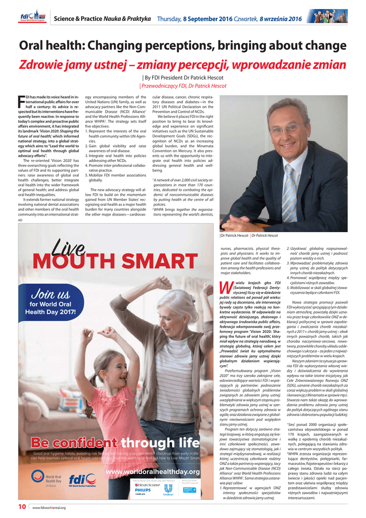 Science & Practice Nauka & Praktyka Thursday, 8 September 2016 Czwartek, 8 września 2016 Oral health: Changing perceptions, bringing about change Zdrowie jamy ustnej – zmiany percepcji, wprowadzanie zmian | By FDI President Dr Patrick Hescot | Przewodniczący FDI, Dr Patrick Hescot F DI has made its voice heard in international public afairs for over half a century: its advice is respected but its interventions have frequently been reactive. In response to today’s complex and proactive public afairs environment, it has integrated its landmark ‘Vision 2020: Shaping the future of oral health’, which informed national strategy, into a global strategy which aims to “Lead the world to optimal oral health through global advocacy eforts”. The re-oriented ‘Vision 2020’ has three overarching goals relecting the values of FDI and its supporting partners: raise awareness of global oral health challenges; better integrate oral health into the wider framework of general health; and address global oral health inequalities. It extends former national strategy involving national dental associations and other members of the oral health community into an international strat- egy encompassing members of the United Nations (UN) family, as well as advocacy partners like the Non-Communicable Disease (NCD) Alliance1 and the World Health Professions Alliance WHPA2. The strategy sets itself ive objectives: 1. Represent the interests of the oral health community within UN Agencies. 2. Gain global visibility and raise awareness of oral disease. 3. Integrate oral health into policies addressing other NCDs. 4. Promote inter-professional collaborative practice. 5. Mobilize FDI member associations globally. The new advocacy strategy will allow FDI to build on the momentum gained from UN Member States’ recognizing oral health as a major health burden for many countries alongside the other major diseases—cardiovas- cular disease, cancer, chronic respiratory diseases and diabetes—in the 2011 UN Political Declaration on the Prevention and Control of NCDs. We believe it places FDI in the right position to bring to bear its knowledge and experience on signiicant initiatives such as the UN Sustainable Development Goals (SDGs), the recognition of NCDs as an increasing global burden, and the Minamata Convention on Mercury. It also presents us with the opportunity to integrate oral health into policies addressing general health and wellbeing. 1 A network of over 2,000 civil society organizations in more than 170 countries, dedicated to combating the epidemic of noncommunicable diseases by putting health at the centre of all policies. 2 WHPA brings together the organizations representing the world’s dentists, AD Live MOUTH SMART Health Day 2017! Be confident through life Good oral hygiene habits, avoiding risk factors and having a regular dental check-up from early in life can help maintain optimal oral health into old age. Visit the website to find out how to Live Mouth Smart. www.worldoralhealthday.org 20 March 10 www.fdiworldental.org nurses, pharmacists, physical therapists and physicians. It works to improve global health and the quality of patient care and facilitates collaboration among the health professions and major stakeholders. W Jin us for World Oral World Oral Health Day |Dr Patrick Hescot | Dr Patrick Hescot Official World Oral Health Day 2017 Partners World Oral Health Day 2017 Supporter wielu krajach głos FDI (Światowej Federacji Dentystycznej) liczy się w dziedzinie public relations od ponad pół wieku: jej rady są doceniane, ale interwencje bywały często tylko reakcją na konkretne wydarzenia. W odpowiedzi na aktywność dzisiejszego, złożonego i aktywnego środowiska public affairs, federacja wkomponowała swój przełomowy program ’Vision 2020: Shaping the future of oral health’, który miał wpływ na strategię narodową, w strategię globalną, której celem jest „Prowadzić świat ku optymalnemu stanowi zdrowia jamy ustnej dzięki globalnym działaniom wspierającym”. Przeformułowany program „Vision 2020” ma trzy szeroko zakrojone cele, odzwierciedlające wartości FDI i wspierających ją partnerów: podnoszenie świadomości globalnych problemów związanych ze zdrowiem jamy ustnej; uwzględnianie w większym stopniu problematyki zdrowia jamy ustnej w szerszych programach ochrony zdrowia w ogóle; oraz działania związane z globalnymi nierównościami pod względem stanu jamy ustnej. Program ten dotyczy zarówno strategii krajowej, w którą angażują się krajowe towarzystwa stomatologiczne i inni członkowie społeczności, zawodowo zajmujący się stomatologią, jak i strategii międzynarodowej, w realizacji której uczestniczą członkowie rodziny ONZ a także partnerzy wspierający, tacy jak Non-Communicable Disease (NCD) Alliance1 oraz World Health Professions Alliance WHPA2. Sama strategia ustanawia pięć celów: 1. Reprezentować w agencjach ONZ interesy społeczności specjalistów w dziedzinie zdrowia jamy ustnej. 2. Uzyskiwać globalną rozpoznawalność chorób jamy ustnej i podnosić poziom wiedzy o nich. 3. Wprowadzać problematykę zdrowia jamy ustnej do polityk dotyczących innych chorób niezakaźnych. 4. Promować współpracę między specjalistami różnych zawodów. 5. Mobilizować w skali globalnej stowarzyszenia będące członkami FDI. Nowa strategia promocji pozwoli FDI wykorzystać sprzyjającą tym działaniom atmosferę, powstałą dzięki uznaniu przez kraje członkowskie ONZ w deklaracji politycznej w sprawie zapobiegania i zwalczania chorób niezakaźnych z 2011 r. chorób jamy ustnej – obok innych poważnych chorób, takich jak choroba naczyniowo-sercowa, nowotwory, przewlekłe choroby układu oddechowego i cukrzyca – za jeden z najważniejszych problemów w wielu krajach. Naszym zdaniem ta sytuacja uprawnia FDI do wykorzystania własnej wiedzy i doświadczenia do wywierania wpływu na takie istotne inicjatywy, jak Ce