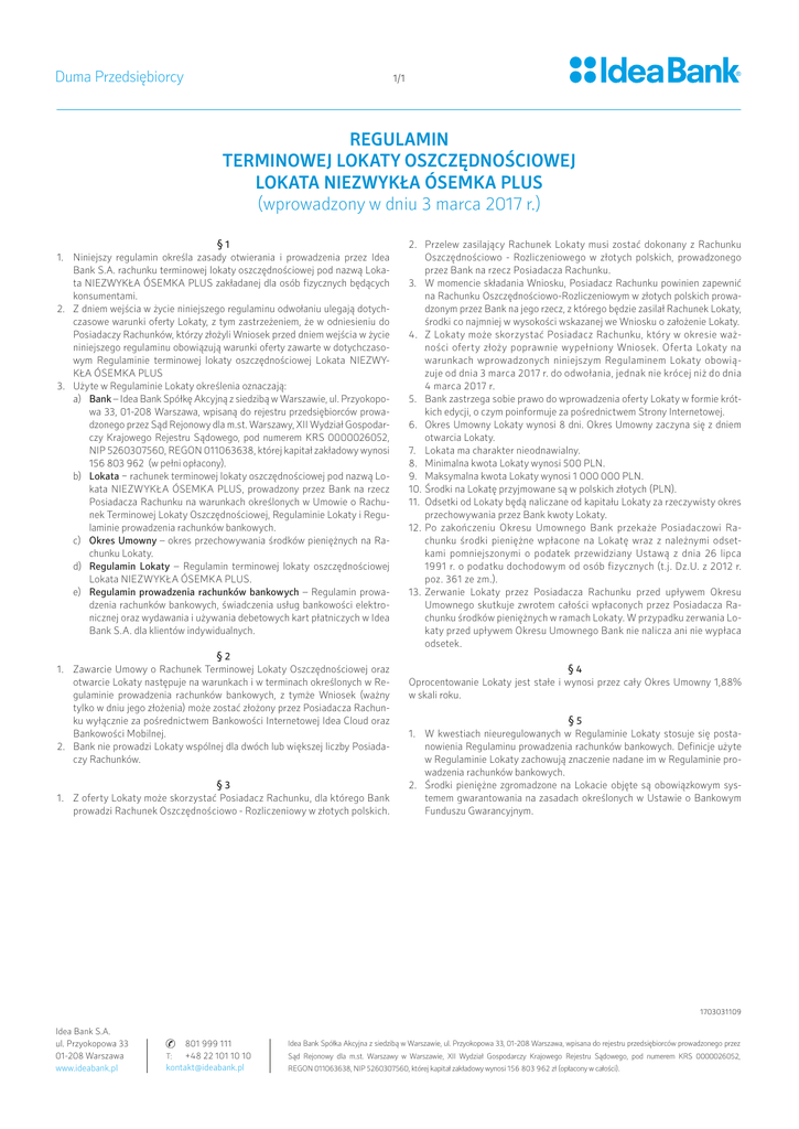 Duma Przedsiębiorcy 1/1 Regulamin TERMINOWEJ LOKATY OSZCZĘDNOŚCIOWEJ Lokata NIEZWYKŁA ÓSEMKA PLUS (wprowadzony w dniu 3 marca 2017 r.) §1 1. Niniejszy regulamin określa zasady otwierania i prowadzenia przez Idea Bank S.A. rachunku terminowej lokaty oszczędnościowej pod nazwą Lokata NIEZWYKŁA ÓSEMKA PLUS zakładanej dla osób fizycznych będących konsumentami. 2. Z dniem wejścia w życie niniejszego regulaminu odwołaniu ulegają dotychczasowe warunki oferty Lokaty, z tym zastrzeżeniem, że w odniesieniu do Posiadaczy Rachunków, którzy złożyli Wniosek przed dniem wejścia w życie niniejszego regulaminu obowiązują warunki oferty zawarte w dotychczasowym Regulaminie terminowej lokaty oszczędnościowej Lokata NIEZWYKŁA ÓSEMKA PLUS 3. Użyte w Regulaminie Lokaty określenia oznaczają: a) Bank – Idea Bank Spółkę Akcyjną z siedzibą w Warszawie, ul. Przyokopowa 33, 01-208 Warszawa, wpisaną do rejestru przedsiębiorców prowadzonego przez Sąd Rejonowy dla m.st. Warszawy, XII Wydział Gospodarczy Krajowego Rejestru Sądowego, pod numerem KRS 0000026052, NIP 5260307560, REGON 011063638, której kapitał zakładowy wynosi 156 803 962 (w pełni opłacony). b) Lokata − rachunek terminowej lokaty oszczędnościowej pod nazwą Lokata NIEZWYKŁA ÓSEMKA PLUS, prowadzony przez Bank na rzecz Posiadacza Rachunku na warunkach określonych w Umowie o Rachunek Terminowej Lokaty Oszczędnościowej, Regulaminie Lokaty i Regulaminie prowadzenia rachunków bankowych. c) Okres Umowny – okres przechowywania środków pieniężnych na Rachunku Lokaty. d) Regulamin Lokaty – Regulamin terminowej lokaty oszczędnościowej Lokata NIEZWYKŁA ÓSEMKA PLUS. e) Regulamin prowadzenia rachunków bankowych – Regulamin prowadzenia rachunków bankowych, świadczenia usług bankowości elektronicznej oraz wydawania i używania debetowych kart płatniczych w Idea Bank S.A. dla klientów indywidualnych. §2 1. Zawarcie Umowy o Rachunek Terminowej Lokaty Oszczędnościowej oraz otwarcie Lokaty następuje na warunkach i w terminach określonych w Regulaminie prowadzenia rachunków bankowych, z tymże Wniosek (ważny tylko w dniu jego złożenia) może zostać złożony przez Posiadacza Rachunku wyłącznie za pośrednictwem Bankowości Internetowej Idea Cloud oraz Bankowości Mobilnej. 2. Bank nie prowadzi Lokaty wspólnej dla dwóch lub większej liczby Posiadaczy Rachunków. §3 1. Z oferty Lokaty może skorzystać Posiadacz Rachunku, dla którego Bank prowadzi Rachunek Oszczędnościowo - Rozliczeniowy w złotych polskich. 2. Przelew zasilający Rachunek Lokaty musi zostać dokonany z Rachunku Oszczędnościowo - Rozliczeniowego w złotych polskich, prowadzonego przez Bank na rzecz Posiadacza Rachunku. 3. W momencie składania Wniosku, Posiadacz Rachunku powinien zapewnić na Rachunku Oszczędnościowo-Rozliczeniowym w złotych polskich prowadzonym przez Bank na jego rzecz, z którego będzie zasilał Rachunek Lokaty, środki co najmniej w wysokości wskazanej we Wniosku o założenie Lokaty. 4. Z Lokaty może skorzystać Posiadacz Rachunku, który w okresie ważności oferty złoży poprawnie wypełniony Wniosek. Oferta Lokaty na warunkach wprowadzonych niniejszym Regulaminem Lokaty obowiązuje od dnia 3 marca 2017 r. do odwołania, jednak nie krócej niż do dnia 4 marca 2017 r. 5. Bank zastrzega sobie prawo do wprowadzenia oferty Lokaty w formie krótkich edycji, o czym poinformuje za pośrednictwem Strony Internetowej. 6. Okres Umowny Lokaty wynosi 8 dni. Okres Umowny zaczyna się z dniem otwarcia Lokaty. 7. Lokata ma charakter nieodnawialny. 8. Minimalna kwota Lokaty wynosi 500 PLN. 9. Maksymalna kwota Lokaty wynosi 1 000 000 PLN. 10.Środki na Lokatę przyjmowane są w polskich złotych (PLN). 11. Odsetki od Lokaty będą naliczane od kapitału Lokaty za rzeczywisty okres przechowywania przez Bank kwoty Lokaty. 12.Po zakończeniu Okresu Umownego Bank przekaże Posiadaczowi Rachunku środki pieniężne wpłacone na Lokatę wraz z należnymi odsetkami pomniejszonymi o podatek przewidziany Ustawą z dnia 26 lipca 1991 r. o podatku dochodowym od osób fizycznych (t.j. Dz.U. z 2012 r. poz. 361 ze zm.). 13.Zerwanie Lokaty przez Posiadacza Rachunku przed upływem Okresu Umownego skutkuje zwrotem całości wpłaconych przez Posiadacza Rachunku środków pieniężnych w ramach Lokaty. W przypadku zerwania Lokaty przed upływem Okresu Umownego Bank nie nalicza ani nie wypłaca odsetek. §4 Oprocentowanie Lokaty jest stałe i wynosi przez cały Okres Umowny 1,88% w skali roku. §5 1. W kwestiach nieuregulowanych w Regulaminie Lokaty stosuje się postanowienia Regulaminu prowadzenia rachunków bankowych. Definicje użyte w Regulaminie Lokaty zachowują znaczenie nadane im w Regulaminie prowadzenia rachunków bankowych. 2. Środki pieniężne zgromadzone na Lokacie objęte są obowiązkowym systemem gwarantowania na zasadach określonych w Ustawie o Bankowym Funduszu Gwarancyjnym. 1703031109 Idea Bank S.A. ul. Przyokopowa 33 01-208 Warszawa www.ideabank.pl 801 999 111 +48 22 101 10 10 [email protected] T: Idea Bank Spółka Akcyjna z siedzibą w Warszawie, ul. Przyokopowa 33, 01-208 Warszawa, wpisana do rejestru przedsiębiorców prowadzonego przez Sąd Rejonowy dla m.st. Warszawy w Warszawie, XII Wydział Gospodarczy Krajowego Rejestru Sądowego, pod numerem KRS 0000026052, REGON 011063638, NIP 5260307560, której kapitał zakładowy wynosi 156 803 962 zł (opłacony w całości).