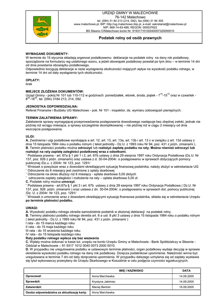 URZĄDGMI NYW MALECHOWI E 76-142 Malechowo tel. (094) 31 84 213 (214, 092), fax (094) 31 84 305 www.malechowo.pl, BIP: http://ug.malechowo.ibip.pl, e-mail: [email protected] NIP: 669-14-63-489, REGON: 000537622 BSSł awnoO/ Malechowo konto Nr: 91931710120040007320000010 Podatek rolny od osób prawnych WYMAGANE DOKUMENTY: Wt er mi ni edo15st y cz ni ask ł adaj ąor ganowipodat kowemu dekl ar ac j enapodat ekr ol ny nadanyr okpodat kowy , spor z ądz onenaf or mul ar z uwgust al onegowz or u,aj eż el i obowi ąz ekpodat k owypowst ał pot y m dni u–w terminie 14 dni od dnia powst ani aobowi ąz kupodat kowego. Odpowi edni okor y guj ądekl ar acj ewr az i ewy st ąpi eni aokol i cz noś ci maj ący chwpł y wnawy sokośćpodat kur ol nego,w t er mi ni e14dnioddat ywy st ąpi eni at y chokol i cz noś ci . OPŁATY: brak MI EJSCEZŁOŻENI ADOKUMENTÓW: 15 15 Ur z ądGmi ny- pokój Nr 101 lub 110-112wgodz i nach:poni edz i ał ek,wt or ek,śr oda,pi ąt ek- 7 -15 oraz w czwartek 00 00 8 -16 , tel. (094) 3184 213, 214, 092. JEDNOSTKA ODPOWIEDZIALNA: Ref er atFi nansówiBudż et uUG Mal echowo- pok. Nr 101 - inspektor, ds. wymiaru zobowi ąz ańpi eni ęż ny ch. TERMI NZAŁATWI ENI ASPRAWY: Zał at wi eni es pr awywy magaj ącej pr z epr owadz eni apost ępowani adowodowegonas t ępuj ebezz będnejz wł oki ,j ednakni e póź ni ej ni żwci ągumi esi ąca,aspr awysz cz egól ni es kompl i k owanej–ni epóź ni ej ni żwci ągu2mi esi ęcyoddni a wsz cz ęci apos t ępowani a. ULGI: A. Zwol ni eni ai ul gipodat k owewy ni kaj ąceaar t .12,ar t .13,ar t .13a,ar t .13biar t .13cwz wi ąz kuzar t .13dust awyz dnia 15 listopada 1984 roku o podatku rolnym ( tekst jednolity - Dz.U. z 1993 roku Nr 94, poz .431zpóź n.z mi anami) . B. Ter mi npł at noś cipodat kumoż naodr oczyćlub r ozł ożyćzapł at ępodat kunar at y.Możnar ówni eżodr oczyćl ub r ozł ożyćnar at yzapł at ęzal egł ościpodat kowejwr azzodset kami . ¨ Podstawa prawna - art. 67a § 1 pkt 1 i 2, art. 67b ustawy z dnia 29 sierpnia 1997 roku Ordynacja Podatkowa (Dz.U. Nr 137,poz .926zpóź n.z mi anami )or azust awazd.30-04-2004r .opos t ępowani uwspr awachdot y cz ący chpomocy publicznej /Dz.u. z 2004r. Nr 123, poz. 1291/ ¨Wni osekopowy ż sz ewr azzdowodami okr eśl aj ący mi sy t uacj ęf i nansowąpodat ni ka,nal eż yz ł oż y ćwsekr et ar i aci eUG ¨Odr ocz eni edo6mi esi ęcyj estz wol ni onezopł at yskar bowej ¨Odr ocz eni enaokr esdł uż sz yni ż6mi esi ęcy- opł at ask ar bowa5, 00z ł ot y ch ¨odr ocz eni ez apł at yz al egł oś cii r oz ł oż enie na raty –opł at askar bowa5, 00z ł . C. Podat ekr ol nymoż naumor zyć. ¨ Podstawa prawna - art.67a § 1 pkt 3 i art. 67b ustawy z dnia 29 sierpnia 1997 roku Ordynacja Podatkowa ( Dz.U. Nr 137,poz .926 póź n.z mi anami )or azus t awazdn.30-04-2004r. o post ępowani uwspr awac hdot .pomocypubl i cz nej /Dz. U. z 2004r. Nr 123, poz. 1291/ ¨Wni osekoumor z eni ewr azzdowodami okr eśl aj ący mi sy t uacj ęf i nans owapodat ni k a,skł adas i ęwsekr et ar i ac i eUr z ędu pot er mi ni epł at nościpodat ku. UWAGI: A. Wy s okośćpodat k ur ol negookr eśl asamodz i el ni epodat ni kwz ł oż onejdek l ar acj inapodat ekr ol ny . B. Ter mi nypł at ności podat k ur ol negookr eśl aar t .6aust .8pkt3ust awyzdni a15l i st opada1984r ok uopodat kur ol ny m ( tekst jednolity - Dz.U. z 1993 roku Nr 94, poz. 431 z póź n.z mi anami) I rata - do15mar cakaż degor oku II rata - do15maj akaż degor oku III rata - do15wr z eśni akaż degor oku IV rata - do15l i st opadak aż degor oku Rat ypodat kur ol negowpł acasi ębezwez wani a C. Wpł at ymoż nadokonaćwkasi et ut .ur z ędunakont oUr z ęduGmi nywMal echowi e- BankSpół dz i el cz ywSł awni eOddz i ałwMal echowi e–91 9317 1012 0040 0073 2000 0010. D. W pr z y padkuni eur egul owani apodat kuwust awowy mt er mi ni epł at noś ci ,or ganpodat k owywy daj edecy z j ęwspr awi e okr eśl eni awy sokośc ipodat k ur ol negonadanyr okpodat kowy .Dor ęcz apodat ni kowiupomni eni e.Nal eż noś ćwi nnaby ć ur egul owanawt er mi ni e7dni oddat ydor ęcz eni aupomni eni a.W pr z y padkudal sz egouchy l ani as i ęodz apł at ywy st awi a si ęt y t ułwy konawcz ypr z esy ł anydoUr z ęduSkar bowegowKosz al i ni ewcel upodj ęci acz y nnoś ci egz ekucy j ny ch. I MI ĘINAZWI SKO DATA Opr acował : Anna Marchewka 14.09.2005 Spr awdzi ł : Krystyna Jakimiec 14.09.2005 Zat wi er dzi ł : Maciej Berlicki 15.09.2005 Osoba odpowiedzialna za aktuali zacj ękar t y: Anna Marchewka URZĄDGMI NYW MALECHOWI E 76-142 Malechowo tel. (094) 31 84 213 (214, 092), fax (094) 31 84 305 www.malechowo.pl, BIP: http://ug.malechowo.ibip.pl, e-mail: [email protected] NIP: 669-14-63-489, REGON: 000537622 BSSł awnoO/ Malechowo konto Nr: 91931710120040007320000010 Podatek rolny od osób prawnych TRYBODWOŁAWCZY: Odwoł ani ewnosi si ędoSamor z ądowegoKol egi um Odwoł awcz egowKosz al i ni ez apośr edni c t wem or ganu,kt ór ywy dał decy z j ę( odwoł ani esk ł adasi ęwSekr et ar i aci eUG Mal echowowgodz i nachpr acyUr z ędu) . Odwoł ani ewnosi si ęwt er mi ni e14dni oddni ador ęcz eni adecy z j ist r oni e. PODSTAWA PRAWNA: ¨ Ustawa z dnia 15 listopada 1984 roku o podatku rolnym ( tekst jednolity - Dz . U.z1993r ok uNr94,poz .431zpóź n. z mi anami)¨Uchwał aNrXVI I / 179/ 2004RadyGmi nyMal echowozdni a29. 11.2004r .wspr awi eobni ż eni aśr edni ej ceny skupuż y t adl acel ówwy mi ar upodat kur ol negonat er eni eGmi nyw2005r . Cenas kupu1kwi nt al aż y t ast anowi ącapodst awędoobl i cz ani apodat kur ol negona2005r okz ost ał aobni ż ona do wy sokoś ci 35, 00z ł . I MI ĘINAZWI SKO DATA Opr acował : Anna Marchewka 14.09.2005 Spr awdzi ł : Krystyna Jakimiec 14.09.2005 Zat wi er dzi ł : Maciej Berlicki 15.09.2005 Osoba odpowiedzialna za aktuali zacj ękar t y: Anna Marchewka