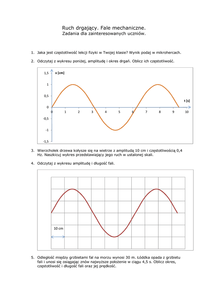 Ruch drgający. Fale mechaniczne. Zadania dla zainteresowanych uczniów. 1. Jaka jest częstotliwość lekcji fizyki w Twojej klasie? Wynik podaj w mikrohercach. 2. Odczytaj z wykresu poniżej, amplitudę i okres drgań. Oblicz ich częstotliwość. x [cm] 1,5 1 0,5 t [s] 0 0 1 2 3 4 5 6 7 8 9 -0,5 -1 -1,5 3. Wierzchołek drzewa kołysze się na wietrze z amplitudą 10 cm i częstotliwością 0,4 Hz. Naszkicuj wykres przedstawiający jego ruch w ustalonej skali. 4. Odczytaj z wykresu amplitudę i długość fali. 10 cm 5. Odległość między grzbietami fal na morzu wynosi 30 m. Łóddka opada z grzbietu fali i unosi się osiągając znów najwyższe położenie w ciągu 4,5 s. Oblicz okres, częstotliwość i długość fali oraz jej prędkość. 10 6. Ile czasu mija między błyskawicą i grzmotem, jeśli piorun bije 10 km od nas. 7. Oblicz, jaką długość ma fala dźwiękowa o najwyższej częstotliwości słyszalnej dla człowieka w powietrzu. 8. Ile kilometrów ma rok świetlny? Zadania pochodzą: Zbiór zdań z fizyki dla gimnazjum. Wyd. NowaEra.