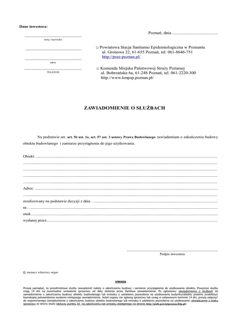 Dane inwestora: Poznań, dnia ......................................... ............................................... imię i nazwisko .............................................. .. ............................................... □ Powiatowa Stacja Sanitarno Epidemiologiczna w Poznaniu ul. Gronowa 22, 61-655 Poznań, tel. 061-8646-751 http://psse-poznan.pl/ adres ............................................... TELEFON □ Komenda Miejska Państwowej Straży Pożarnej ul. Bobrzańska 6a, 61-248 Poznań, tel. 061-2220-300 http://www.kmpsp.poznan.pl/ ZAWIADOMIENIE O SŁUŻBACH Na podstawie art. art. 56 ust. 1a, art. 57 ust. 3 ustawy Prawa Budowlanego zawiadamiam o zakończeniu budowy obiektu budowlanego i zamiarze przystąpienia do jego użytkowania. Obiekt: ................................................................................................................................................................................... ................................................................................................................................................................................................ ................................................................................................................................................................................................ ................................................................................................................................................................................................ ................................................................................................................................................................................................ Adres: ..................................................................................................................................................................................... ................................................................................................................................................................................................ zrealizowany na podstawie decyzji z dnia …......................................................................................................................... nr.…........................................................................................................................................................................................ znak......................................................................................................................................................................................... wydanej przez......................................................................................................................................................................... .................................................................................. Podpis inwestora □ zaznacz właściwy organ UWAGA Proszę pamiętać, że przedmiotowe służby zawiadomić należy o zakończeniu budowy i zamiarze przystąpienia do użytkowania obiektu. Powyższe służby mają 14 dni na ewentualne wniesienie sprzeciwu od daty złożenia przez Państwa zawiadomienia. Po zgłoszeniu zawiadomienia o służbach do zawiadomienia o zakończeniu budowy obiektu budowlanego lub wniosku o udzieleniu pozwolenia na użytkowanie budynku/obiektu prosimy przedłożyć kserokopię potwierdzenia wysłania niniejszego zawiadomienia. Jeżeli organy nie zgłoszą sprzeciwu lub uwag w ustawowym terminie 14 dni, proszę załączyć do wspomnianego zawiadomienia o zakończeniu budowy obiektu budowlanego lub wniosku o udzieleniu pozwolenia na użytkowanie oświadczenie o braku sprzeciwu ze strony służb (dotyczy punktu 10 na zakończeniu lub wniosku dostępnego na stronie http://pinb.powiatpoznan.ibip.pl)