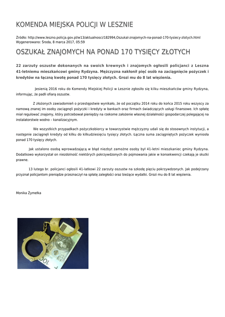 KOMENDA MIEJSKA POLICJI W LESZNIE Źródło: http://www.leszno.policja.gov.pl/w13/aktualnosci/182994,Oszukal-znajomych-na-ponad-170-tysiecy-zlotych.html Wygenerowano: Środa, 8 marca 2017, 05:59 OSZUKAŁ ZNAJOMYCH NA PONAD 170 TYSIĘCY ZŁOTYCH 22 zarzuty oszustw dokonanych na swoich krewnych i znajomych ogłosili policjanci z Leszna 41-letniemu mieszkańcowi gminy Rydzyna. Mężczyzna nakłonił pięć osób na zaciągnięcie pożyczek i kredytów na łączną kwotę ponad 170 tysięcy złotych. Grozi mu do 8 lat więzienia. Jesienią 2016 roku do Komendy Miejskiej Policji w Lesznie zgłosiło się kilku mieszkańców gminy Rydzyna, informując, że padli ofiarą oszustw. Z złożonych zawiadomień o przestępstwie wynikało, że od początku 2014 roku do końca 2015 roku wszyscy za namową znanej im osoby zaciągnęli pożyczki i kredyty w bankach oraz firmach świadczących usługi finansowe. Ich spłatę miał regulować znajomy, który potrzebował pieniędzy na rzekome założenie własnej działalności gospodarczej polegającej na instalatorstwie wodno – kanalizacyjnym. We wszystkich przypadkach pożyczkobiorcy w towarzystwie mężczyzny udali się do stosownych instytucji, a następnie zaciągnęli kredyty od kilku do kilkudziesięciu tysięcy złotych. Łączna suma zaciągniętych pożyczek wyniosła ponad 170 tysięcy złotych. Jak ustalono osobą wprowadzającą w błąd niezbyt zamożne osoby był 41-letni mieszkaniec gminy Rydzyna. Dodatkowo wykorzystał on niezdolność niektórych pokrzywdzonych do pojmowania jakie w konsekwencji czekają je skutki prawne. 13 lutego br. policjanci ogłosili 41-latkowi 22 zarzuty oszustw na szkodę pięciu pokrzywdzonych. Jak podejrzany przyznał policjantom pieniądze przeznaczył na spłatę zaległości oraz bieżące wydatki. Grozi mu do 8 lat więzienia. Monika Żymełka Ocena: 0/5 (0) Tweetnij