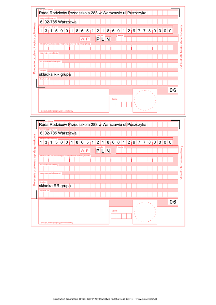Rada Rodziców Przedszkola 283 w Warszawie ul.Puszczyka 6, 02-785 Warszawa 1 3 1 5 0 0 1 8 6 5 1 2 1 8 6 0 1 2 9 7 7 8 0 0 0 0 składka RR grupa Rada Rodziców Przedszkola 283 w Warszawie ul.Puszczyka 6, 02-785 Warszawa 1 3 1 5 0 0 1 8 6 5 1 2 1 8 6 0 1 2 9 7 7 8 0 0 0 0 składka RR grupa Drukowane programem DRUKI GOFIN Wydawnictwa Podatkowego GOFIN - www.Druki.Gofin.pl