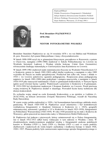 Kopia publikacji: Polskie Towarzystwo Fotogrametrii i Teledetekcji Sekcja Naukowa Stowarzyszenia Geodetów Polskich 60-lecie Polskiego Towarzystwa Fotogrametrycznego Sesja Naukowa, Warszawa, 22-24 maj 1991 r Prof. Bronisław PIĄTKIEWICZ 1878-1966 NESTOR FOTOGRAMETRII POLSKIEJ Bronisław Stanisław Piątkiewicz ur. się 14 września 1878 r. we wsi Babica nad Wisłokiem (b. pow. Rzeszów), był synem Maksymiliana i Anny z Krzyształowiczów. W latach 1890-1898 uczył się w gimnazjum klasycznym, początkowo w Rzeszowie, a potem w Chyro-wie, następnie (1898-1900) studiował w Szkole Politechnicznej we Lwowie na Wydziale Inżynierii Lądowej i Wodnej (chyba kończąc 2-letni Kurs Geometrów) równocześnie studiując matematykę w Uniwersytecie Jana Kazimierza we Lwowie. W latach 1899-1902 studiował nauki matematyczno-fizyczne na Wydziale Filozoficznym UJ w Krakowie, potem (w latach 1902-1903) odbył służbę wojskową, a następnie w roku 1909 wyjeżdża do Paryża na studia specjalistyczne. Przebywał tam tylko rok, wraca i składa w 1910 r. we Lwowie państwowy egzamin pedagogiczny. Rozpoczyna pracę pedagogiczną najpierw (w latach 1903-1909) jako praktykant i zastępca nauczyciela, a następnie w latach 1910-1919 jako nauczyciel matematyki i fizyki w gimnazjach krakowskich, w Nowym Sączu (gdzie uczył również łaciny i greki). Wadowicach i ponownie w Krakowie w II gimnazjum. W 1919-1920 był dyrektorem naukowym I Korpusu Kadetów we Lwowie. Przed pierwszą wojną światową B. Piątkiewicz działał w skautingu. Prowadził liczne kursy techniczne dla drużyn krakowskich. Po wybuchu wojny stanął na czele Komendy Krakowskiej, a na zjeździe w Lublinie (120.XI.1918), na którym utworzono Związek Harcerstwa Polskiego, wszedł do Naczelnej Rady Harcerskiej. W czasie wojny polsko-radzieckiej w 1920 r. był komendantem harcerskiego oddziału straży granicznej. W latach 1920-1930 B. Piątkiewicz uczył miernictwa i był kontraktowym wykładowcą fotogrametrii w Akademii Górniczej w Krakowie (w r. 1925), geografii matematycznej, astronomii i geodezji w UJ w Krakowie (w latach 1923-1939), fotogrametrii na Politechnice Warszawskiej (1926-1939). W roku 1930 przeniósł się na stałe z Krakowa do Warszawy, gdzie pracował na stanowisku radcy w Ministerstwie Robót Publicznych. B. Piątkiewicz był jednym z pierwszych, którzy zainteresowali się w Polsce fotogrametrią. Już w latach 1912-1913 odbył kursy wakacyjne w tym zakresie w Wiedniu i Jenie. W dwudziestoleciu międzywojennym pogłębiał wiedzę z fotogrametrii podczas podobnych kursów w Wiedniu (1929 r.), Jenie (1929 r.), Dreźnie (1925 r.) oraz w czasie podróży służbowych i naukowych do wielu krajów zachodniej i środkowej Europy w latach 1926, 1928 i 1937. Plonem podróży było zastosowanie najnowszego sprzętu fotogrametrycznego w badaniach na terenie Polski. W 1924 r. B. Piątkiewicz zorganizował „Oddział Fotogeodezyjny" w Ministerstwie Robót Publicznych (z siedzibą do 1930 r. w Krakowie), którym kierował do 1932 r. Siedzibą pracowni był lokal w Instytucie Geografii UJ (mieszczący się w dawnym arsenale Władysława IV, naprzeciw Wawelu). Wyposażył ten Oddział w fototeodolit Haydego 13 18, stereokomparator i wreszcie autograf Wilda A2. Przeszkolił też praktycznie pierwszych pracowników (inż. Skibę z magistratu m. Krakowa, inż. Sobola i Szczurkowskiego) i rozpoczął w 1925 r. - w ramach prac Komisji Granicznej - prace terenowe nad mapą Tatr. Wynikami tych prac było streofotogrametryczne zdjęcie i opracowanie na autografie Wilda A2 mapy Tatr polskich w skali oryginału 1:10 000. Mapa ta w wydaniu użytkowym została zmniejszona do skali 1:20 000. Zredagowaniem i drukiem mapy zajął się Wojskowy Instytut Geograficzny. W tym samym czasie B. Piątkiewicz brał udział w komisjach granicznych: polsko-czechosłowackiej, polskorumuńskiej i polsko-łotewskiej, przeprowadzając kurs z fotogrametrii dla oficerów rumuńskich. Opracował również metodą fotogrametryczną mapę granicy polsko-rumuńskiej od Zaleszczyk do Okopów św. Trójcy. Był prekursorem zastosowania fotogrametrii dla potrzeb gospodarczych. Organizował i prowadził prace w Biurze Projektów Melioracji Polesia (1928 r.), w Rożnowie. Zastosował metody fotogrametryczne przy wykopaliskach archeologicznych w Biskupinie i Gnieźnie (1938 r.), przy planach odbudowy Ratusza w Krakowie. B. Piątkiewicz należał do członków założycieli Polskiego Towarzystwa Fotogrametrycznego (w 1930 r.) i wchodził w skład zarządu. Pracował nad polskim słownikiem fotogrametrycznym, organizował kursy dla inżynierów, wygłaszał referaty na zjazdach. Jak już wspomniano, B. Piątkiewicz rozpoczął wykłady z fotogrametrii w Politechnice Warszawskiej w 1926 r., dojeżdżając przez pierwsze cztery lata na wykłady z Krakowa. Zaczął organizować Pracownię Fotogrametryczną w Politechnice Warszawskiej. Nabył mały fototeodolit firmy Heyde 9 12, przetwornik Huggershoffa uproszczonej konstrukcji firmy Heyde, autograf Wilda A4, stereokomparator Zeissa i inne przyrządy. W czasie okupacji niemieckiej prowadziła Warszawa wykłady w Szkole Budownictwa Lądowego i Wodnego oraz w Państwowej Szkole Technicznej. Wywieziony z początkiem sierpnia 1944 r. na roboty przymusowe do Thöringswerder pod Berlinem, z powodu złego stanu zdrowia i dzięki różnym staraniom, został zwolniony pod koniec 1944 r. Po wyzwoleniu B. Piątkiewicz pracował w Akademii Górniczej w Krakowie. Latem 1945 r. powrócił do pracy w Politechnice Warszawskiej jako adiunkt na Wydziale Geodezyjnym. Dnia 31 lipca 1946 r. otrzymał nominację na profesora zwyczajnego i objął funkcję kierownika katedry fotogrametrii (w latach 1946-1960). W latach 1945-1950 był dziekanem Wydziału Geodezyjnego, pełniąc równocześnie obowiązki zastępcy dyrektora resortowego instytutu (Geodezyjny Instytut Naukowo-Badawczy). Oprócz pracy w Politechnice Warszawskiej, prowadził w latach 19