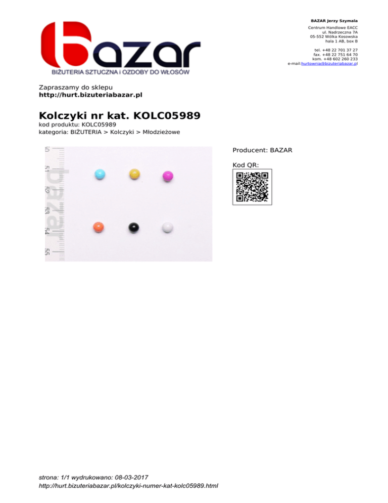 BAZAR Jerzy Szymala Centrum Handlowe EACC ul. Nadrzeczna 7A 05-552 Wólka Kosowska hala 1 AB, box B tel. +48 22 701 37 27 fax. +48 22 751 64 70 kom. +48 602 260 233 e-mail:[email protected] Zapraszamy do sklepu http://hurt.bizuteriabazar.pl Kolczyki nr kat. KOLC05989 kod produktu: KOLC05989 kategoria: BIŻUTERIA > Kolczyki > Młodzieżowe Producent: BAZAR Kod QR: strona: 1/1 wydrukowano: 08-03-2017 http://hurt.bizuteriabazar.pl/kolczyki-numer-kat-kolc05989.html