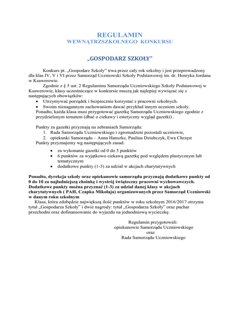 REGULAMIN WEWNĄTRZSZKOLNEGO KONKURSU „GOSPODARZ SZKOŁY” Konkurs pt. „Gospodarz Szkoły” trwa przez cały rok szkolny i jest przeprowadzony dla klas IV, V i VI przez Samorząd Uczniowski Szkoły Podstawowej im. dr. Henryka Jordana w Ksawerowie. Zgodnie z § 5 ust. 2 Regulaminu Samorządu Uczniowskiego Szkoły Podstawowej w Ksawerowie, klasy uczestniczące w konkursie muszą jak najlepiej wywiązać się z następujących obowiązków: Utrzymywać porządek i bezpiecznie korzystać z pracowni szkolnych. Swoim nienagannym zachowaniem dawać przykład innym uczniom szkoły. Ponadto, każda klasa musi przygotować gazetkę Samorządu Uczniowskiego zgodnie z przydzielonym tematem (dbać o ciekawy i estetyczny wygląd gazetki) . Punkty za gazetki przyznają na zebraniach Samorządu: Rada Samorządu Uczniowskiego i zgromadzeni pozostali uczniowie, opiekunki Samorządu – Anna Hanszke, Paulina Dziubczyk, Ewa Chrzęst Punkty przyznajemy wg następujących zasad: za wykonanie gazetki od 0 do 5 punktów 6 punktów za wyjątkowo ciekawą gazetkę pod względem plastycznym lub tematycznym dodatkowe punkty (1-3) za udział w akcjach charytatywnych Ponadto, dyrekcja szkoły oraz opiekunowie samorządu przyznają dodatkowe punkty od 0 do 10 za najładniejszą choinkę i wystrój świąteczny pracowni wychowawczych. Dodatkowe punkty można przyznać (1-3) za udział danej klasy w akcjach charytatywnych ( PAH, Czapka Mikołaja) organizowanych przez Samorząd Uczniowski w danym roku szkolnym Klasa, która zdobędzie największą ilość punktów w roku szkolnym 2016/2017 otrzyma tytuł „Gospodarza Szkoły” i dwie nagrody: tytuł „Gospodarza Szkoły” oraz puchar przechodni oraz dofinansowanie do wyjazdu na jednodniową wycieczkę. Regulamin przygotowali: opiekunowie Samorządu Uczniowskiego oraz Rada Samorządu Uczniowskiego