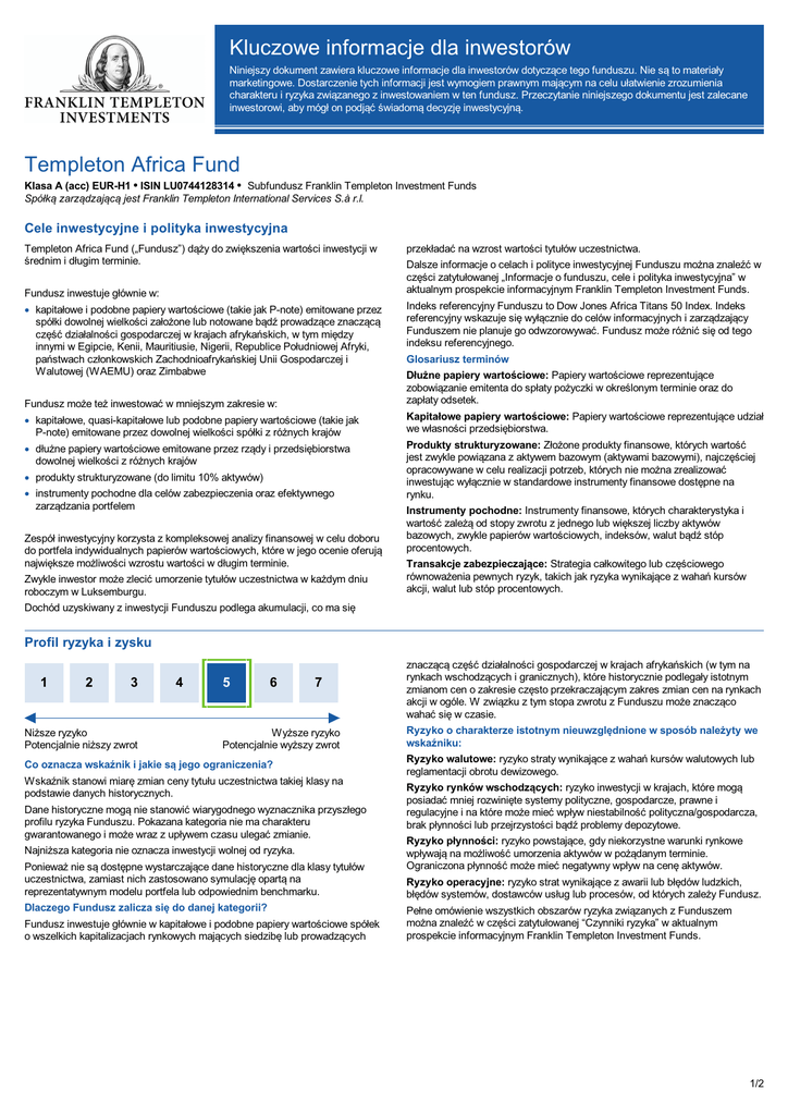 Kluczowe informacje dla inwestorów Niniejszy dokument zawiera kluczowe informacje dla inwestorów dotyczące tego funduszu. Nie są to materiały marketingowe. Dostarczenie tych informacji jest wymogiem prawnym mającym na celu ułatwienie zrozumienia charakteru i ryzyka związanego z inwestowaniem w ten fundusz. Przeczytanie niniejszego dokumentu jest zalecane inwestorowi, aby mógł on podjąć świadomą decyzję inwestycyjną. Templeton Africa Fund Klasa A (acc) EUR-H1 • ISIN LU0744128314 • Subfundusz Franklin Templeton Investment Funds Spółką zarządzającą jest Franklin Templeton International Services S.à r.l. Cele inwestycyjne i polityka inwestycyjna Templeton Africa Fund („Fundusz”) dąży do zwiększenia wartości inwestycji w średnim i długim terminie. Fundusz inwestuje głównie w: · kapitałowe i podobne papiery wartościowe (takie jak P-note) emitowane przez spółki dowolnej wielkości założone lub notowane bądź prowadzące znaczącą część działalności gospodarczej w krajach afrykańskich, w tym między innymi w Egipcie, Kenii, Mauritiusie, Nigerii, Republice Południowej Afryki, państwach członkowskich Zachodnioafrykańskiej Unii Gospodarczej i Walutowej (WAEMU) oraz Zimbabwe przekładać na wzrost wartości tytułów uczestnictwa. Dalsze informacje o celach i polityce inwestycyjnej Funduszu można znaleźć w części zatytułowanej „Informacje o funduszu, cele i polityka inwestycyjna” w aktualnym prospekcie informacyjnym Franklin Templeton Investment Funds. Indeks referencyjny Funduszu to Dow Jones Africa Titans 50 Index. Indeks referencyjny wskazuje się wyłącznie do celów informacyjnych i zarządzający Funduszem nie planuje go odwzorowywać. Fundusz może różnić się od tego indeksu referencyjnego. Glosariusz terminów Fundusz może też inwestować w mniejszym zakresie w: Dłużne papiery wartościowe: Papiery wartościowe reprezentujące zobowiązanie emitenta do spłaty pożyczki w określonym terminie oraz do zapłaty odsetek. · kapitałowe, quasi-kapitałowe lub podobne papiery wartościowe (takie jak P-note) emitowane przez dowolnej wielkości spółki z różnych krajów Kapitałowe papiery wartościowe: Papiery wartościowe reprezentujące udział we własności przedsiębiorstwa. · dłużne papiery wartościowe emitowane przez rządy i przedsiębiorstwa dowolnej wielkości z różnych krajów Produkty strukturyzowane: Złożone produkty finansowe, których wartość jest zwykle powiązana z aktywem bazowym (aktywami bazowymi), najczęściej opracowywane w celu realizacji potrzeb, których nie można zrealizować inwestując wyłącznie w standardowe instrumenty finansowe dostępne na rynku. · produkty strukturyzowane (do limitu 10% aktywów) · instrumenty pochodne dla celów zabezpieczenia oraz efektywnego zarządzania portfelem Zespół inwestycyjny korzysta z kompleksowej analizy finansowej w celu doboru do portfela indywidualnych papierów wartościowych, które w jego ocenie oferują największe możliwości wzrostu wartości w długim terminie. Zwykle inwestor może zlecić umorzenie tytułów uczestnictwa w każdym dniu roboczym w Luksemburgu. Instrumenty pochodne: Instrumenty finansowe, których charakterystyka i wartość zależą od stopy zwrotu z jednego lub większej liczby aktywów bazowych, zwykle papierów wartościowych, indeksów, walut bądź stóp procentowych. Transakcje zabezpieczające: Strategia całkowitego lub częściowego równoważenia pewnych ryzyk, takich jak ryzyka wynikające z wahań kursów akcji, walut lub stóp procentowych. Dochód uzyskiwany z inwestycji Funduszu podlega akumulacji, co ma się Profil ryzyka i zysku 1 2 3 Niższe ryzyko Potencjalnie niższy zwrot 4 5 6 7 Wyższe ryzyko Potencjalnie wyższy zwrot Co oznacza wskaźnik i jakie są jego ograniczenia? Wskaźnik stanowi miarę zmian ceny tytułu uczestnictwa takiej klasy na podstawie danych historycznych. Dane historyczne mogą nie stanowić wiarygodnego wyznacznika przyszłego profilu ryzyka Funduszu. Pokazana kategoria nie ma charakteru gwarantowanego i może wraz z upływem czasu ulegać zmianie. Najniższa kategoria nie oznacza inwestycji wolnej od ryzyka. Ponieważ nie są dostępne wystarczające dane historyczne dla klasy tytułów uczestnictwa, zamiast nich zastosowano symulację opartą na reprezentatywnym modelu portfela lub odpowiednim benchmarku. Dlaczego Fundusz zalicza się do danej kategorii? Fundusz inwestuje głównie w kapitałowe i podobne papiery wartościowe spółek o wszelkich kapitalizacjach rynkowych mających siedzibę lub prowadzących znaczącą część działalności gospodarczej w krajach afrykańskich (w tym na rynkach wschodzących i granicznych), które historycznie podlegały istotnym zmianom cen o zakresie często przekraczającym zakres zmian cen na rynkach akcji w ogóle. W związku z tym stopa zwrotu z Funduszu może znacząco wahać się w czasie. Ryzyko o charakterze istotnym nieuwzględnione w sposób należyty we wskaźniku: Ryzyko walutowe: ryzyko straty wynikające z wahań kursów walutowych lub reglamentacji obrotu dewizowego. Ryzyko rynków wschodzących: ryzyko inwestycji w krajach, które mogą posiadać mniej rozwinięte systemy polityczne, gospodarcze, prawne i regulacyjne i na które może mieć wpływ niestabilność polityczna/gospodarcza, brak płynności lub przejrzystości bądź problemy depozytowe. Ryzyko płynności: ryzyko powstające, gdy niekorzystne warunki rynkowe wpływają na możliwość umorzenia aktywów w pożądanym terminie. Ograniczona płynność może mieć negatywny wpływ na cenę aktywów. Ryzyko operacyjne: ryzyko strat wynikające z awarii lub błędów ludzkich, błędów systemów, dostawców usług lub procesów, od których zależy Fundusz. Pełne omówienie wszystkich obszarów ryzyka związanych z Funduszem można znaleźć w części zatytułowanej “Czynniki ryzyka” w aktualnym prospekcie informacyjnym Franklin Templeton Investm