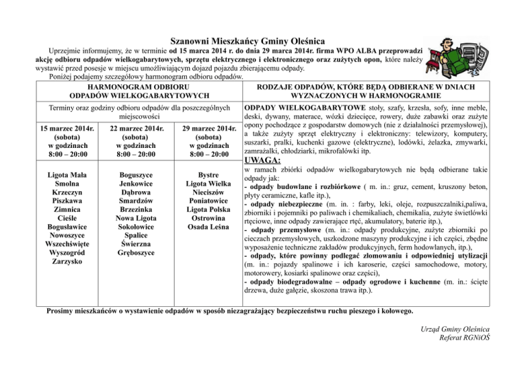 Szanowni Mieszkańcy Gminy Oleśnica Uprzejmie informujemy, że w terminie od 15 marca 2014 r. do dnia 29 marca 2014r. firma WPO ALBA przeprowadzi akcję odbioru odpadów wielkogabarytowych, sprzętu elektrycznego i elektronicznego oraz zużytych opon, które należy wystawić przed posesje w miejscu umożliwiającym dojazd pojazdu zbierającemu odpady. Poniżej podajemy szczegółowy harmonogram odbioru odpadów. HARMONOGRAM ODBIORU RODZAJE ODPADÓW, KTÓRE BĘDĄ ODBIERANE W DNIACH ODPADÓW WIELKOGABARYTOWYCH WYZNACZONYCH W HARMONOGRAMIE Terminy oraz godziny odbioru odpadów dla poszczególnych miejscowości 15 marzec 2014r. (sobota) w godzinach 8:00 – 20:00 22 marzec 2014r. (sobota) w godzinach 8:00 – 20:00 29 marzec 2014r. (sobota) w godzinach 8:00 – 20:00 Ligota Mała Smolna Krzeczyn Piszkawa Zimnica Cieśle Bogusławice Nowoszyce Wszechświęte Wyszogród Zarzysko Boguszyce Jenkowice Dąbrowa Smardzów Brzezinka Nowa Ligota Sokołowice Spalice Świerzna Gręboszyce Bystre Ligota Wielka Nieciszów Poniatowice Ligota Polska Ostrowina Osada Leśna ODPADY WIELKOGABARYTOWE stoły, szafy, krzesła, sofy, inne meble, deski, dywany, materace, wózki dziecięce, rowery, duże zabawki oraz zużyte opony pochodzące z gospodarstw domowych (nie z działalności przemysłowej), a także zużyty sprzęt elektryczny i elektroniczny: telewizory, komputery, suszarki, pralki, kuchenki gazowe (elektryczne), lodówki, żelazka, zmywarki, zamrażalki, chłodziarki, mikrofalówki itp. UWAGA: w ramach zbiórki odpadów wielkogabarytowych nie będą odbierane takie odpady jak: - odpady budowlane i rozbiórkowe ( m. in.: gruz, cement, kruszony beton, płyty ceramiczne, kafle itp.), - odpady niebezpieczne (m. in. : farby, leki, oleje, rozpuszczalniki,paliwa, zbiorniki i pojemniki po paliwach i chemikaliach, chemikalia, zużyte świetlówki rtęciowe, inne odpady zawierające rtęć, akumulatory, baterie itp.), - odpady przemysłowe (m. in.: odpady produkcyjne, zużyte zbiorniki po cieczach przemysłowych, uszkodzone maszyny produkcyjne i ich części, zbędne wyposażenie techniczne zakładów produkcyjnych, ferm hodowlanych, itp.), - odpady, które powinny podlegać złomowaniu i odpowiedniej utylizacji (m. in.: pojazdy spalinowe i ich karoserie, części samochodowe, motory, motorowery, kosiarki spalinowe oraz części), - odpady biodegradowalne – odpady ogrodowe i kuchenne (m. in.: ścięte drzewa, duże gałęzie, skoszona trawa itp.). Prosimy mieszkańców o wystawienie odpadów w sposób niezagrażający bezpieczeństwu ruchu pieszego i kołowego. Urząd Gminy Oleśnica Referat RGNiOŚ