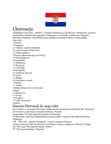 Chorwacja (Republika Chorwacji) – państwo w Europie Południowej, nad Morzem Adriatyckim, graniczy od południa z Bośnią i Hercegowiną i Czarnogórą, od wschodu z Serbią oraz Węgrami i Słowenią od północy. Od południowego zachodu ma dostęp do Morza Adriatyckiego. Spis treści 1 Historia 2 Geografia 2.1 Granice i punkty skrajne[8] 2.2 Linia brzegowa Chorwacji 2.3 Parki narodowe 3 Podział administracyjny Chorwacji 4 Ustrój polityczny 5 Gospodarka 5.1 Rolnictwo 5.2 Przemysł 5.3 Turystyka 6 Demografia 6.1 Struktura etniczna 6.2 Język 6.3 Religia 6.4 Największe miasta 7 Kultura 7.1 Święta 8 Krainy historyczne w Chorwacji 9 Sport 10 Zobacz też 11 Uwagi 12 Przypisy 13 Linki zewnętrzne Historia historia Chorwacji do 1945 roku. Do I wieku n.e. na terenie Chorwacji znajdowała się rzymska prowincja Iliria (łac. Illyricum). Od I wieku n.e. prowincje rzymskie Dalmacja i Panonia. Na początku VII wieku przybyły plemiona Chorwatów. W 803 tereny Chorwacji Dalmatyńskiej zostały podbite i włączone do imperium Karola Wielkiego. VII – VIII wiek – najazdy Ostrogotów, Awarów i plemion Słowian. Tereny Chorwacji stały się miejscem rywalizacji o wpływy: papiestwa, Wenecji i Węgier. Do 1102 rządy chorwackich książąt i królów. W 1102 unia personalna z Węgrami. XIV wiek – pod koniec panowania Andegawenów na Węgrzech (1308-95) okres walk wewnętrznych. Po bitwie pod Mohaczem w 1526 Chorwacja dostała się pod panowanie Habsburgów. Część ziem pod panowaniem Turków osmańskich, stopniowy ich napór spowodował zajmowanie praktycznie całego terytorium. W XVIII wieku zmniejszanie wpływów tureckich i w latach 1809-1813 powstały Prowincje Ilyrijskie Napoleona. W XIX wieku w Cesarstwie Austriackim, a później w strefie wpływów Węgier (po 1867 w Krajach Korony Świętego Stefana, czyli węgierskiej części państwa; w części austriackiej pozostała Dalmacja), cieszyła się tam jednakże autonomią (własny sejm). Austriacy starali się wyzyskiwać konflikty węgiersko-chorwackie dla umocnienia dynastii habsburskiej (np. Chorwaci pomogli w stłumieniu powstania węgierskiego w 1848). Także w XIX wieku tendencje niepodległościowe (1848). W 1918 Chorwacja weszła w skład Królestwa SHS (Serbów, Chorwatów i Słoweńców), od 1929 w Jugosławii. W roku 1941 faszystowskie ugrupowanie ustaszy na czele z Ante Paveliciem przejęło władzę, ogłosiło niepodległość i powstało Niepodległe Państwo Chorwackie (NDH). Terytorium Chorwacji sprzymierzonej wówczas z Niemcami obejmowało Chorwację właściwą (choć nie całą, część terytorium przyłączono do Włoch) oraz tereny dzisiejszej Bośni i Hercegowiny. W maju 1945 likwidacja przez armię jugosłowiańską Niezależnego Państwa Chorwackiego. historia współczesna Chorwacji. Rozpad Jugosławii. Od 1945 po zakończeniu II wojny światowej Chorwacja została włączona do Jugosławii Josipa Broz-Tity (który sam był z pochodzenia Chorwatem). W 1991 proklamowano niepodległość; rozpoczęła się wojna z Jugosławią (de facto z Serbią, wspomaganą przez oddziały czarnogórskie) (Wojna w Chorwacji). Od kwietnia 1992 siły pokojowe ONZ. Konflikt rozwiązany w 1995 – układ w Dayton. Chorwacja zabiega o członkostwo w Unii Europejskiej i NATO. Od początku lat 90. rządy nacjonalistów Chorwackiej Wspólnoty Demokratycznej (HDZ) pod wodzą Franja Tudjmana (aż do jego śmierci w 1999). Wygrana w wyborach 2000 sił umiarkowanych: prezydentem został Stjepan Mesić, dawny antykomunistyczny opozycjonista państwa. Rząd utworzyła koalicja zreformowanych postkomunistów z ludowcami, chadekami i partią liberalną a na jego czele stanął Ivica Račan. Gabinet zabiegał o zbliżenie Chorwacji do struktur europejskich. Przegrana w wyborach 2003, powrót do władzy Chorwackiej Wspólnoty Demokratycznej (HDZ). 3 października 2005 roku Chorwacja rozpoczęła negocjacje w sprawie przyjęcia do Unii Europejskiej. lipiec-sierpień 2007 roku – wielkie pożary spustoszyły wybrzeża południowo-środkowej części Chorwacji 1 kwietnia 2009 – Chorwacja dołączyła do grona państw członkowskich NATO 14 września 2011 – zakończono negocjacje w sprawie przyjęcia Chorwacji do Unii Europejskiej[6] 9 grudnia 2011 – podpisanie traktatu akcesyjnego[7] 1 lipca 2013 – planowane jest wejście Chorwacji do Unii Europejskiej Tłumaczenia – język chorwacki: Oferujemy tłumaczenia zwykle, specjalistyczne, techniczne, przysięgłe, konsekutywne i symultaniczne. Przy realizacji zlecenia tłumacze dobierani są indywidualnie w zależności od tematyki oraz specjalizacji tekstu. Projekty oraz tłumaczenia przyjmujemy oraz dostarczamy pocztą, firmą kurierską, osobiście, faksem, pocztą elektroniczną. Jeśli potrzebują Państwo tłumaczenia z języka serbskiego lub na język serbski– prosimy o kontakt. Udzielimy wszelkich niezbędnych informacji. Współpracujemy z najlepszymi tłumaczami w kraju. Zlecenie tłumaczenia można złożyć drogą e-mailową, za pomocą formularza lub przez telefon. Po otrzymaniu zlecenia natychmiast przystępujemy do tłumaczenia. Wybrane dziedziny i obszary tłumaczeń w zakresie języka serbskiego: Ekonomia, prawo, finanse, ubezpieczenia – umowy cywilne i handlowe, analizy księgowe, raporty spółek, oferty, prezentacje, biznesplany, studia opłacalności i wiele innych dokumentów i opracowań. Informatyka, elektronika, szeroko pojęta inżynieria z rożnych specjalistycznych dziedzin techniki (np. technika wojskowa, grzewcza i ciepłownicza, klimatyzacja, motoryzacja) – oferty, schematy, instrukcje obsługi, opisy. Ekologia, rolnictwo, biotechnologia. Medycyna, farmacja, technika medyczna. Marketing i sprzedaż – oferty, publikacje marketingowe – foldery, ulotki, prezentacje, strony www, inne. Unia Europejska, fundusze strukturalne, projekty i partnerstwa, dofinansowanie, dotacje – wszelkie dokumenty partnerstw i związane z aplikacją i realizacje proje