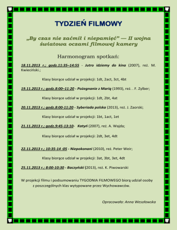 TYDZIEŃ FILMOWY „By czas nie zaćmił i niepamięć” — II wojna światowa oczami filmowej kamery Harmonogram spotkań: 18.11.2013 r.; godz.11:35–14:55 - Jutro idziemy do kina (2007), reż. M. Kwieciński.; Klasy biorące udział w projekcji: 1dt, 2act, 3ct, 4bt 19.11.2013 r.; godz.8:00–11:20 - Pożegnanie z Marią (1993), reż. . F. Zylber; Klasy biorące udział w projekcji: 1dt, 2bt, 4at 20.11.2013 r.; godz.8:00-11:20 - Syberiada polska (2013), reż. J. Zaorski; Klasy biorące udział w projekcji: 1bt, 1act, 1et 21.11.2013 r.; godz.9:45-13:10- Katyń (2007), reż. A. Wajda; Klasy biorące udział w projekcji: 2dt, 3et, 4dt 22.11.2013 r.; 10:35-14 :05 - Niepokonani (2010), reż. Peter Weir; Klasy biorące udział w projekcji: 3at, 3bt, 3et, 4dt 25.11.2013 r.; 8:00-10:30 - Baczyński (2013), reż. K. Piwowarski W projekcji filmu i podsumowaniu TYGODNIA FILMOWEGO biorą udział osoby z poszczególnych klas wytypowane przez Wychowawców. Opracowała: Anna Wesołowska