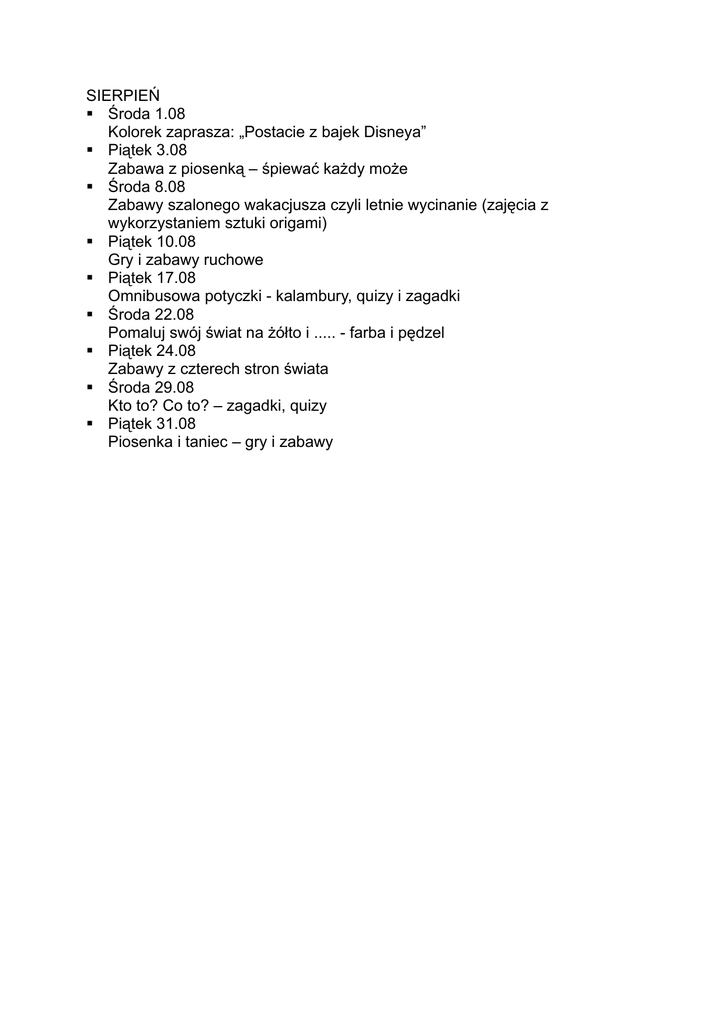 SIERPIEŃ Środa 1.08 Kolorek zaprasza: „Postacie z bajek Disneya” Piątek 3.08 Zabawa z piosenką – śpiewać każdy może Środa 8.08 Zabawy szalonego wakacjusza czyli letnie wycinanie (zajęcia z wykorzystaniem sztuki origami) Piątek 10.08 Gry i zabawy ruchowe Piątek 17.08 Omnibusowa potyczki - kalambury, quizy i zagadki Środa 22.08 Pomaluj swój świat na żółto i ..... - farba i pędzel Piątek 24.08 Zabawy z czterech stron świata Środa 29.08 Kto to? Co to? – zagadki, quizy Piątek 31.08 Piosenka i taniec – gry i zabawy