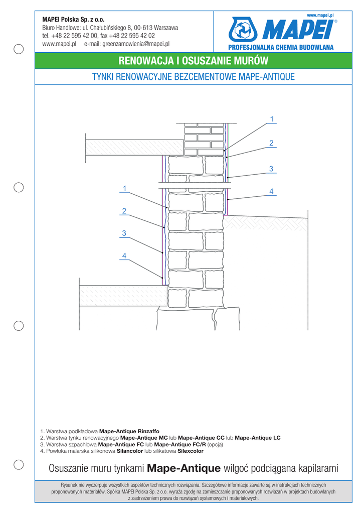 MAPEI Polska Sp. z o.o. Biuro Handlowe: ul. Chałubińskiego 8, 00-613 Warszawa tel. +48 22 595 42 00, fax +48 22 595 42 02 www.mapei.pl e-mail: [email protected] RENOWACJA I OSUSZANIE MURÓW TYNKI RENOWACYJNE BEZCEMENTOWE MAPE-ANTIQUE 1 2 3 1 4 2 3 4 1. Warstwa podkładowa Mape-Antique Rinzaffo 2. Warstwa tynku renowacyjnego Mape-Antique MC lub Mape-Antique CC lub Mape-Antique LC 3. Warstwa szpachlowa Mape-Antique FC lub Mape-Antique FC/R (opcja) 4. Powłoka malarska silikonowa Silancolor lub silikatowa Silexcolor Osuszanie muru tynkami Mape-Antique wilgoć podciągana kapilarami Rysunek nie wyczerpuje wszystkich aspektów technicznych rozwiązania. Szczegółowe informacje zawarte są w instrukcjach technicznych proponowanych materiałów. Spółka MAPEI Polska Sp. z o.o. wyraża zgodę na zamieszczanie proponowanych rozwiazań w projektach budowlanych z zastrzeżeniem prawa do rozwiązań systemowych i materiałowych.