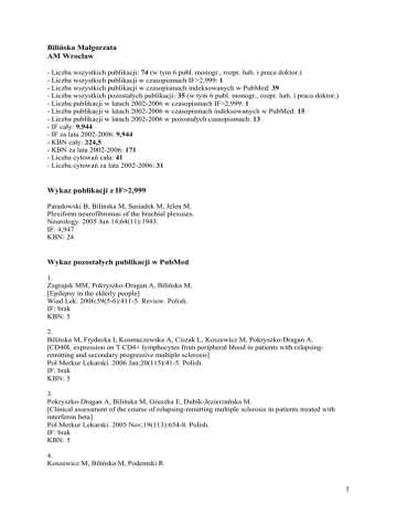 Bilińska Małgorzata AM Wrocław - Liczba wszystkich publikacji: 74 (w tym 6 publ. monogr., rozpr. hab. i praca doktor.) - Liczba wszystkich publikacji w czasopismach IF>2,999: 1 - Liczba wszystkich publikacji w czasopismach indeksowanych w PubMed: 39 - Liczba wszystkich pozostałych publikacji: 35 (w tym 6 publ. monogr., rozpr. hab. i praca doktor.) - Liczba publikacji w latach 2002-2006 w czasopismach IF>2,999: 1 - Liczba publikacji w latach 2002-2006 w czasopismach indeksowanych w PubMed: 15 - Liczba publikacji w latach 2002-2006 w pozostałych czasopismach: 13 - IF cały: 9,944 - IF za lata 2002-2006: 9,944 - KBN cały: 224,5 - KBN za lata 2002-2006: 171 - Liczba cytowań cała: 41 - Liczba cytowań za lata 2002-2006: 31 Wykaz publikacji z IF>2,999 Paradowski B, Bilinska M, Sasiadek M, Jelen M. Plexiform neurofibromas of the brachial plexuses. Neurology. 2005 Jun 14;64(11):1943. IF: 4,947 KBN: 24 Wykaz pozostałych publikacji w PubMed 1. Zagrajek MM, Pokryszko-Dragan A, Bilińska M. [Epilepsy in the elderly people] Wiad Lek. 2006;59(5-6):411-5. Review. Polish. IF: brak KBN: 5 2. Bilińska M, Frydecka I, Kosmaczewska A, Ciszak L, Koszewicz M, Pokryszko-Dragan A. [CD40L expression on T CD4+ lymphocytes from peripheral blood in patients with relapsingremitting and secondary progressive multiple sclerosis] Pol Merkur Lekarski. 2006 Jan;20(115):41-5. Polish. IF: brak KBN: 5 3. Pokryszko-Dragan A, Bilińska M, Gruszka E, Dubik-Jezierzańska M. [Clinical assessment of the course of relapsing-remitting multiple sclerosis in patients treated with interferon beta] Pol Merkur Lekarski. 2005 Nov;19(113):654-8. Polish. IF: brak KBN: 5 4. Koszewicz M, Bilińska M, Podemski R. 1 [Electrophysiological estimation of the peripheral nerves conduction parameters and the autonomic nervous system function in the course of amyotrophic lateral sclerosis] Neurol Neurochir Pol. 2005 Sep-Oct;39(5):351-7. Polish. Pawlak E, Kochanowska IE, Frydecka I. IF: brak KBN: 5 5. Kiełbiński M, Potoczek S, Bilińska M. The soluble CTLA-4 receptor: a new marker in autoimmune diseases. Arch Immunol Ther Exp (Warsz). 2005 Jul-Aug;53(4):336-41. Review. IF: 1,000 KBN: 10 6. Bilińska M, Brzezowska D, Koszewicz M, Antonowicz-Juchniewicz J, Modrzycka T. [Subclinical lead neuropathy] Pol Merkur Lekarski. 2004 Sep;17(99):244-7. Polish. IF: brak KBN: 5 7. Bilińska M, Frydecka I, Noga L, Dobosz T, Zołedziewska M, Suwalska K, Tutak A, Pokryszko-Dragan A. Progression of multiple sclerosis is associated with exon 1 CTLA-4 gene polymorphism. Acta Neurol Scand. 2004 Jul;110(1):67-71. IF: 1,712 KBN: 10 8. Bilińska M. [Multiple stimulation of T lymphocytes in the pathogenesis of multiple sclerosis] Pol Merkur Lekarski. 2003 Dec;15(90):570-3. Review. Polish. IF: brak KBN: 5 9. Paradowski B, Bilinska M. [Gabapentin in the treatment of neuropathic pain in patients with type 2 diabetes mellitus]. Pol Merkur Lekarski. 2003 Jul;15(85):61-4. Polish. IF: brak KBN: 5 10. Bilińska M, Frydecka I, Podemski R. [Fas receptor expression on peripheral blood T lymphocytes in patients with secondary progressive multiple sclerosis] Pol Merkur Lekarski. 2003 May;14(83):421-4. Polish. IF: brak KBN: 5 11. Boćko D, Bilińska M, Dobosz T, Zołedziewska M, Suwalska K, Tutak A, Gruszka E, Frydecka I. Lack of association between an exon 1 CTLA-4 gene polymorphism A(49)G and multiple sclerosis in a Polish population of the Lower Silesia region. Arch Immunol Ther Exp (Warsz). 2003;51(3):201-5. 2 IF: 0,707 KBN: 8 12. Bilinska M, Frydecka I, Podemski R, Gruszka E. Fas expression on T cells and sFas in relapsing-remitting multiple sclerosis. Acta Neurol Scand. 2003 Jun;107(6):387-93. IF: 1,226 KBN: 9 13. Bilińska M, Frydecka I, Podemski R, Gruszka E. Serum levels of sTNFR-1 and sFas in patients with relapsing-remitting multiple sclerosis. Med Sci Monit. 2002 Oct;8(10):CR720-3. IF: brak KBN: 5 14. Bilikiewicz A, Opala G, Podemski R, Puzyński S, Łapin J, Sołtys K, Ochudło S, Barcikowska M, Pfeffer A, Bilińska M, Paradowski B, Parnowski T, Gabryelewicz T. An open-label study to evaluate the safety, tolerability and efficacy of rivastigmine in patients with mild to moderate probable Alzheimer's disease in the community setting. Med Sci Monit. 2002 Feb;8(2):PI9-15. IF: brak KBN: 5 15. Paradowski B, Waszczuk E, Bilińska M, Paradowski L, Podemski R. [Multimodal evoked potentials in malabsorption syndrome] Pol Merkur Lekarski. 2001 Dec;11(66):499-502. Polish. IF: brak KBN: 5 16. Bilińska M, Frydecka I, Podemski R. [Clinical course and changes of soluble interleukin-2 receptor and soluble forms of intercellular adhesion molecule-1 (ICAM-1) in serum of multiple sclerosis patients] Neurol Neurochir Pol. 2001 Jan-Feb;35(1):47-56. Polish. IF: brak KBN: 4 17. Bilińska M, Frydecka I, Podemski R, Teodorowska R, Gruszka E. Expression of Fas antigen on T cell subpopulations in peripheral blood of patients with relapsingremitting multiple sclerosis. Med Sci Monit. 2001 Mar-Apr;7(2):251-5. IF: brak KBN: 5 18. Iwanicka Z, Głab E, Bilińska M, Wasikowa R. [The incidence of neuropathy in patients with diabetes type 1] Endokrynol Diabetol Chor Przemiany Materii Wieku Rozw. 2000;6(2):93-9. Polish. IF: brak KBN: 2 3 19. Bilińska M, Swierkocka-Miastkowska M, Dobrzyńska L. [Primary and secondary intraventricular hemorrhage--clinical analysis] Neurol Neurochir Pol. 1999;32 Suppl 6:141-7. Polish. IF: brak KBN: 4 20. Paradowski B, Bilińska M, Koszewicz M, Pokryszko A. [Evaluation of cardiovascular and sudomotor functions in Alzheimer's disease] Pol Merkur Lekarski. 1999 Oct;7(40):180-4. Polish. IF: brak KBN: 5 21. Pokryszko A, Podemski R, Bilińska M. [Clinical-electrophysiological characteristics of Alzheimer's dementia and cerebrovascular dementia based on determination of cerebral refraction time] Neurol Neurochir Pol. 1999 Mar-Apr;33(2):321-30. Polish. IF: brak KBN: 4 22. Bilińska M, Pokryszko A. [Autonomic nervous system disturbances in Parkinson's disease] Neurol Neurochir P