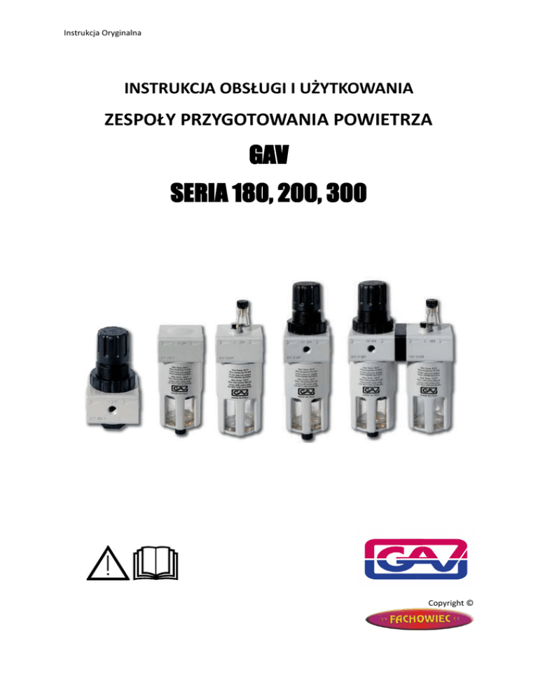 Instrukcja Oryginalna INSTRUKCJA OBSŁUGI I UŻYTKOWANIA ZESPOŁY PRZYGOTOWANIA POWIETRZA GAV SERIA 180, 200, 300 Copyright © SPIS TREŚCI: I. II. III. IV. V. Przeznaczenie ................................................................................................................................................. 3 Zasady bezpiecznego użytkowania ................................................................................................................. 3 Budowa i Dane techniczne: ............................................................................................................................ 4 Instalacja, użytkowanie, konserwacja ............................................................................................................ 6 Wykaz części ................................................................................................................................................... 8 PRODUCENT: GAV Srl via Meucci 11/15 Brendola (Vicenza) IMPORTER: F.H.W. FACHOWIEC, Zenon Świętek ul. Stefańskiego 29 61-415 Poznań 2/8 | BLOKI PRZYGOTOWANIA POWIETRZA - GAV SPRZEDAŻ HURTOWA I DETALICZNA: F.H.W. FACHOWIEC, Zenon Świętek ul. Grunwaldzka 390, 60-169 Poznań tel. 61 66 18 159, www.fachowiec.com [email protected] UWAGA Niniejsze instrukcje są dostarczane w celu poinformowania operatora, jak należy prawidłowo i bezpiecznie używać produktu. Muszą być one przechowywane w wyraźnie wskazanym miejscu, tak aby były łatwo i szybko dostępne. Prosimy o przeczytanie tych instrukcji przed użyciem. I. PRZEZNACZENIE FILTR (F) REDUKTOR (R) NAOLEJACZ (L) BLOK PRZYGOTOWANIA POWIETRZA F+R (FILTR + REDUKTOR) BLOK PRZYGOTOWANIA POWIETRZA F+R+L (FILTR + REDUTOR + NAOLEJACZ II. FILTROWANIE SPRĘŻONEGO POWIETRZA Filtrowanie sprężonego powietrza, przy pomocy wkładu filtrującego, zanim zostanie użyte do zasilania odbiornika. REDUKCJA CIŚNIENIA Redukcja ciśnienia wejściowego sprężonego powietrza, do zadanej przez operatora wartości (zakres regulacji podano w danych technicznych). SMAROWANIE SPRĘŻONEGO POWIETRZA Smarowanie sprężonego powietrza, wchodzącego do naolejacza, zanim zostanie użyte do zasilania odbiornika. Filtrowanie sprężonego powietrza, redukcja ciśnienia. Filtrowanie sprężonego powietrza, redukcja ciśnienia, smarowanie sprężonego powietrza ZASADY BEZPIECZNEGO UŻYTKOWANIA Zabronione jest stosowanie jakichkolwiek innych gazów zamiast sprężonego powietrza. Zabronione jest stosowanie niezgodne z przeznaczeniem. Zastosowanie innych gazów może prowadzić do powstania poważnych obrażeń, spowodować pożar lub grozić wybuchem. Maksymalne ciśnienie wlotowe nie może przekroczyć wartości podanych w danych technicznych. Nigdy nie wolno wystawiać układu FRL na oddziaływanie źródeł ciepła o temperaturze większej niż o 60 C. Należy unikać instalowania układu FRL w pozycjach, które byłby on narażony na wstrząs, drgania lub oddziaływania innego rodzaju. Należy unikać instalowania układu FRL w miejscach, w których występuje silne stężenie alkoholu lub rozpuszczalników. Na stanowisku pracy powinna być zapewniona skuteczna wentylacja. Nigdy nie modyfikuj sprzętu na własną rękę. Sprawdzaj czy wszystkie części są sprawne, a w razie zużycia wymieniaj tylko na nowe i oryginalne. Nigdy nie należy odkręcać kielichów ani innych części, jeżeli układ znajduje się pod ciśnieniem. Stosować się do ogólnych zasad BHP na stanowisku pracy. Zabronione jest dopuszczanie do obsługi elementów bloku przygotowania powietrza, osób bez odpowiednich kwalifikacji, w szczególności dzieci. UWAGA ZABRONIONE JEST PRZEKRACZANIE MAKSYMALNEGO DOPUSZCZALNEGO CIŚNIENIA WEJŚCIOWEGO. MAKSYMALNE DOPUSZCZALNE CIŚNIENIE WEJŚCIOWE, PODANO W INSTRUKCJI OBSŁUGI (DANE TECHNICZEN) ORAZ NA KORPUSIE ELEMENTU PRZYGOTOWANIA POWIETRZA. 3/8 | BLOKI PRZYGOTOWANIA POWIETRZA - GAV III. BUDOWA I DANE TECHNICZNE: Pokrętło regulacji ciśnienia Pokrętło regulacji dozownika oleju Wejście GW Wyjście GW Przyłącze gwintowe pod manometr Pojemnik naolejacza Pojemnik filtra Zawór spustowy kondensatu Dane Techniczne: MODEL MAX. CIŚNIENIE WEJŚCIOWE [bar] R – 180 F – 180 12 12 L – 180 12 FR – 180 12 FRL – 180 12 R – 200 F – 200 16 16 L – 200 16 FR – 200 16 FRL – 200 16 R – 300 F – 300 16 16 L – 300 16 FR – 300 16 FRL – 300 16 MAX. TEMP. PRACY o [ C] ELEMENT FILTRUJĄCY [μm] ZAKRES REGULACJI CIŚNIENIA [bar] ZAKRES REGULACJI DOZOWANIA LUBRYKANTU BLOKI PRZYGOTOWANIA POWIETRZA PRZYŁĄCZE ¼” GW 60 ----0 – 10 ---60 10 ------1 kropla na 300 – 60 ------600 l/min 60 10 0 – 10 ---1 kropla na 300 – 60 10 0 – 10 600 l/min BLOKI PRZYGOTOWANIA POWIETRZA PRZYŁĄCZE ½” GW 60 ---0 – 12 ---60 10 ------1 kropla na 300 – 60 ------600 l/min 60 10 0 – 12 ---1 kropla na 300 – 60 10 0 – 12 600 l/min BLOKI PRZYGOTOWANIA POWIETRZA PRZYŁACZE 1” GW 60 ---0 – 12 ---60 10 ------1 kropla na 300 – 60 ------600 l/min 60 10 0 – 12 ---1 kropla na 300 – 60 10 0 – 12 600 l/min 4/8 | BLOKI PRZYGOTOWANIA POWIETRZA - GAV POJEMNOŚĆ ZBIORNIKA [ml] ---30 40 30 30 (F) 40 (L) ---50 170 50 50 (F) 170 (L) ---150 300 150 150 (F) 300 (L) Przepustowość: BLOKI PRZYGOTOWANIA POWIETRZA PRZYŁACZE ¼” GW R – 180 F – 180 L – 180 FR – 180 FRL – 180 1800 l/min dla p= 6 [bar] BLOKI PRZYGOTOWANIA POWIETRZA PRZYŁĄCZE ½” GW R – 200 F – 200 L – 200 FR – 200 FRL – 200 5/8 | BLOKI PRZYGOTOWANIA POWIETRZA - GAV 5200 l/min dla p= 6 [bar] BLOKI PRZYGOTOWANIA POWIETRZA PRZYŁĄCZE 1” GW R – 300 F – 300 L – 300 FR – 300 FRL – 300 8000 l/min dla p= 6 [bar] IV. INSTALACJA, UŻYTKOWANIE, KONSERWACJA UWAGA WSZELKIE CZYNNOŚCI OBSŁUGOWO NAPRAWCZE, KTÓRE WYMAGAJĄ DEMONTAŻU ELEMENTÓW BLOKU, NALEŻY ZAWSZE DOKONYWAĆ PRZY ODPOWIETRZONYM UKŁADZIE (BEZ CIŚNIENIA) Instalacja: Układ powinien zostać zainstalowany jak najbliżej odbiornika powietrza. W przypadku kombinacji stosować kole
