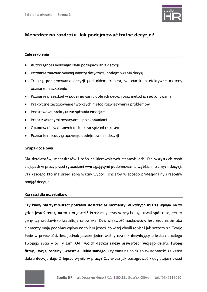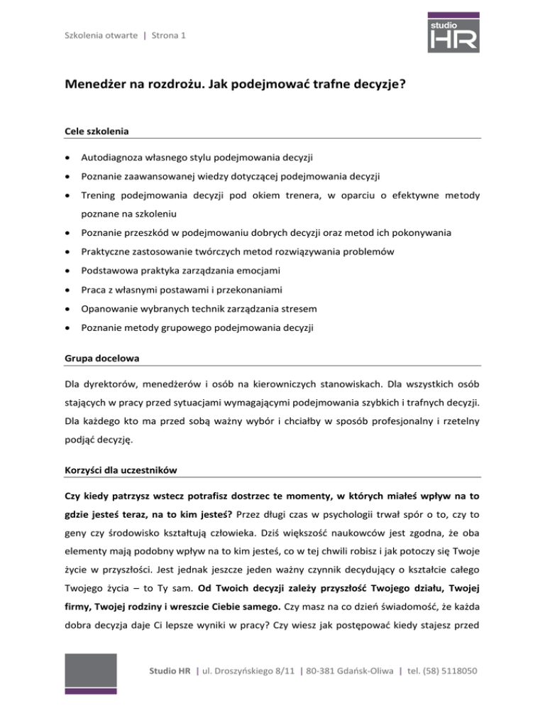 studio Szkolenia otwarte | Strona 1 Menedżer na rozdrożu. Jak podejmować trafne decyzje? Cele szkolenia Autodiagnoza własnego stylu podejmowania decyzji Poznanie zaawansowanej wiedzy dotyczącej podejmowania decyzji Trening podejmowania decyzji pod okiem trenera, w oparciu o efektywne metody poznane na szkoleniu Poznanie przeszkód w podejmowaniu dobrych decyzji oraz metod ich pokonywania Praktyczne zastosowanie twórczych metod rozwiązywania problemów Podstawowa praktyka zarządzania emocjami Praca z własnymi postawami i przekonaniami Opanowanie wybranych technik zarządzania stresem Poznanie metody grupowego podejmowania decyzji Grupa docelowa Dla dyrektorów, menedżerów i osób na kierowniczych stanowiskach. Dla wszystkich osób stających w pracy przed sytuacjami wymagającymi podejmowania szybkich i trafnych decyzji. Dla każdego kto ma przed sobą ważny wybór i chciałby w sposób profesjonalny i rzetelny podjąć decyzję. Korzyści dla uczestników Czy kiedy patrzysz wstecz potrafisz dostrzec te momenty, w których miałeś wpływ na to gdzie jesteś teraz, na to kim jesteś? Przez długi czas w psychologii trwał spór o to, czy to geny czy środowisko kształtują człowieka. Dziś większość naukowców jest zgodna, że oba elementy mają podobny wpływ na to kim jesteś, co w tej chwili robisz i jak potoczy się Twoje życie w przyszłości. Jest jednak jeszcze jeden ważny czynnik decydujący o kształcie całego Twojego życia – to Ty sam. Od Twoich decyzji zależy przyszłość Twojego działu, Twojej firmy, Twojej rodziny i wreszcie Ciebie samego. Czy masz na co dzień świadomość, że każda dobra decyzja daje Ci lepsze wyniki w pracy? Czy wiesz jak postępować kiedy stajesz przed Studio HR | ul. Droszyńskiego 8/11 | 80-381 Gdańsk-Oliwa | tel. (58) 5118050 studio Szkolenia otwarte | Strona 2 jedynym wyborem dwóch złych opcji? Co zrobić kiedy podjęło się błędną decyzję – być wytrwałym, czy szybko się wycofać? Zazwyczaj jesteśmy przekonani o swojej racjonalności, a nawet chytrości. Współczesna nauka dowodzi, że jest to pierwszy błędny krok w podejmowaniu decyzji. Czy jesteś gotów skorzystać z jej wskazówek i zmienić na lepsze swoje jutro? Program szkolenia 1. WSTĘP a. Czy można nauczyć się uniwersalnej metody podejmowania właściwych decyzji? b. Autodiagnoza – najlepszy sposób na rozpoczęcie zmiany – gra szkoleniowa c. Rodzaje decyzji i najczęściej stosowane metody ich rozwiązywania (ich wady i zalety) d. Decyzje w życiu prywatnym i zawodowym. 2. METODA a. Model skutecznego podejmowania decyzji – teoria i praktyka b. Struktura procesu decyzyjnego Identyfikacja sytuacji decyzyjnej Sformułowanie zadania decyzyjnego Zbudowanie modelu decyzyjnego Wyznaczenie decyzji ostatecznej Podjęcie decyzji ostatecznej c. Intuicja vs. racjonalna analiza d. Test - czy potrafisz racjonalnie podejmować decyzje? e. Każdy ma dwa mózgi - jak wykorzystać ten drugi mózg? f. Twórcze metody rozwiązywania problemów – kilka prostych technik do zastosowania od zaraz 3. PRZESZKODY NA DRODZE DO CELU a. Ryzyko, presja czasu i brak informacji b. Najczęstsze błędy popełniane podczas podejmowania decyzji – case study c. Przeszkody i myślowe pułapki – czy potrafisz myśleć logicznie? Studio HR | ul. Droszyńskiego 8/11 | 80-381 Gdańsk-Oliwa | tel. (58) 5118050 studio Szkolenia otwarte | Strona 3 d. Emocje a logiczne myślenie – eksperyment: most nad przepaścią e. Co gdy podjąłeś błędną decyzję – być wytrwałym czy elastycznym? 4. ZARZĄDZANIE KONTEKSTEM a. Nasze postawy, wartości i przekonania – co warto zmieniać, a czego nie warto i jak to robić. b. Grupowe podejmowanie decyzji – pułapka czy strzał w dziesiątkę? c. Stres – jego znaczenie i metody panowania nad nim d. Efektywne komunikowanie swoich decyzji e. Coaching a efektywne podejmowanie decyzji 5. PODSUMOWANIE Metody pracy na szkoleniu: Praca z kamerą, mini wykład, elementy relaksacji, eksperymenty psychologiczne, testy, dyskusja, prezentacja multimedialna, gry szkoleniowe. Koszty szkolenia wraz z materiałami i lunchem wynoszą 999 zł + 23% VAT. Wypełniony i przesłany do Studia HR formularz zgłoszeniowy oraz dokonanie wpłaty na wskazane w formularzu konto stanowi podstawę do włączenia na listę uczestników danego szkolenia. Studio HR | ul. Droszyńskiego 8/11 | 80-381 Gdańsk-Oliwa | tel. (58) 5118050
