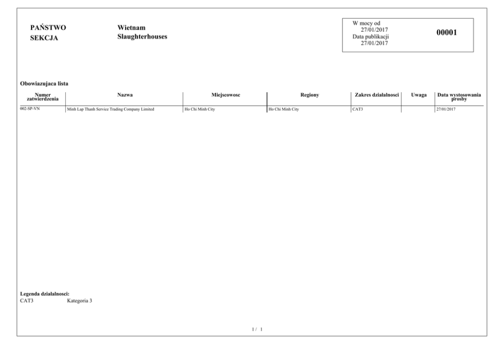 PAŃSTWO SEKCJA W mocy od 27/01/2017 Data publikacji 27/01/2017 Wietnam Slaughterhouses 00001 Obowiazujaca lista Numer zatwierdzenia 002-SP-VN Nazwa Minh Lap Thanh Service Trading Company Limited Miejscowosc Regiony Ho Chi Minh City Ho Chi Minh City Legenda dzialalnosci: CAT3 Kategoria 3 1/ 1 Zakres dzialalnosci CAT3 Uwaga Data wystosowania prosby 27/01/2017