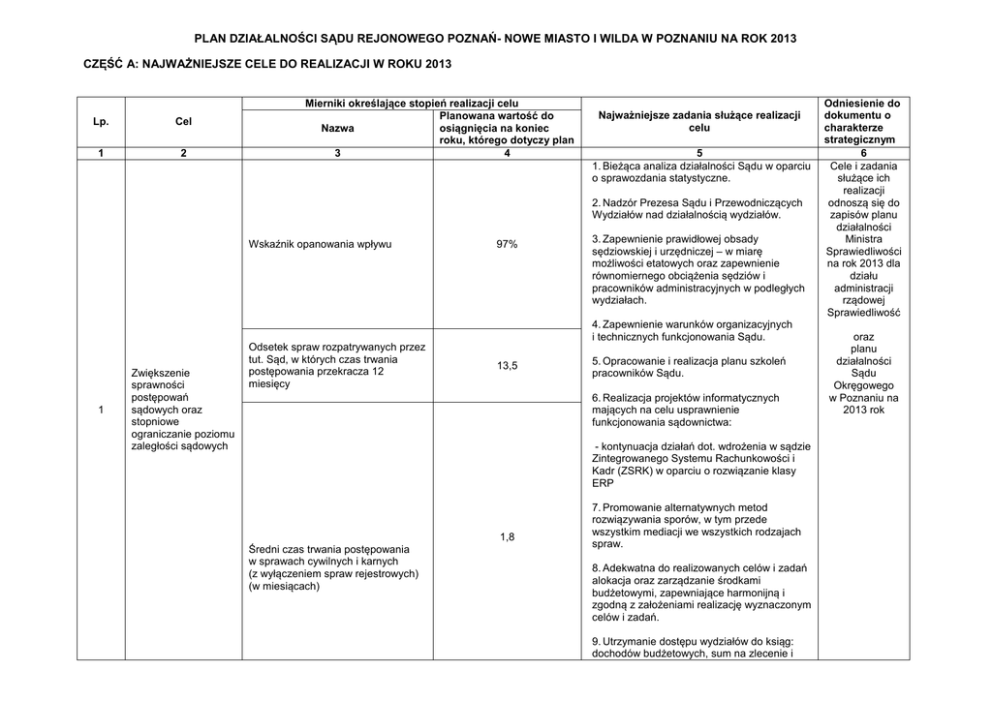PLAN DZIAŁALNOŚCI SĄDU REJONOWEGO POZNAŃ- NOWE MIASTO I WILDA W POZNANIU NA ROK 2013 CZĘŚĆ A: NAJWAŻNIEJSZE CELE DO REALIZACJI W ROKU 2013 Lp. Cel 1 2 Mierniki określające stopień realizacji celu Planowana wartość do Nazwa osiągnięcia na koniec roku, którego dotyczy plan 3 4 Najważniejsze zadania służące realizacji celu 5 1. Bieżąca analiza działalności Sądu w oparciu o sprawozdania statystyczne. 2. Nadzór Prezesa Sądu i Przewodniczących Wydziałów nad działalnością wydziałów. Wskaźnik opanowania wpływu 97% 3. Zapewnienie prawidłowej obsady sędziowskiej i urzędniczej – w miarę możliwości etatowych oraz zapewnienie równomiernego obciążenia sędziów i pracowników administracyjnych w podległych wydziałach. 4. Zapewnienie warunków organizacyjnych i technicznych funkcjonowania Sądu. 1 Zwiększenie sprawności postępowań sądowych oraz stopniowe ograniczanie poziomu zaległości sądowych Odsetek spraw rozpatrywanych przez tut. Sąd, w których czas trwania postępowania przekracza 12 miesięcy 13,5 5. Opracowanie i realizacja planu szkoleń pracowników Sądu. 6. Realizacja projektów informatycznych mających na celu usprawnienie funkcjonowania sądownictwa: - kontynuacja działań dot. wdrożenia w sądzie Zintegrowanego Systemu Rachunkowości i Kadr (ZSRK) w oparciu o rozwiązanie klasy ERP 1,8 Średni czas trwania postępowania w sprawach cywilnych i karnych (z wyłączeniem spraw rejestrowych) (w miesiącach) 7. Promowanie alternatywnych metod rozwiązywania sporów, w tym przede wszystkim mediacji we wszystkich rodzajach spraw. 8. Adekwatna do realizowanych celów i zadań alokacja oraz zarządzanie środkami budżetowymi, zapewniające harmonijną i zgodną z założeniami realizację wyznaczonym celów i zadań. 9. Utrzymanie dostępu wydziałów do ksiąg: dochodów budżetowych, sum na zlecenie i Odniesienie do dokumentu o charakterze strategicznym 6 Cele i zadania służące ich realizacji odnoszą się do zapisów planu działalności Ministra Sprawiedliwości na rok 2013 dla działu administracji rządowej Sprawiedliwość oraz planu działalności Sądu Okręgowego w Poznaniu na 2013 rok sum depozytowych w celu ustalenia uiszczenia wyznaczonych kwot. 10. Opracowanie modelu struktury i opisu stanowisk urzędniczych w Sądzie. 11. Wdrożenie nowej polityki bezpieczeństwa informacji. Udział odpisów z rejestrów KRS i RZ składanych drogą elektroniczną w ogólnej liczbie wydanych odpisów 2 Ułatwianie dostępu obywateli do wymiaru sprawiedliwości oraz wzmacnianie ochrony prawnej obywateli Odsetek Wydziałów wykorzystujących Portal Informacyjny z wyłączeniem Wydz. KRS i RZ Utworzenie Biura Obsługi Interesantów 50% Wartość miernika jest określana i monitorowana centralnie 100% 1. Wprowadzenie e-usług w zakresie Krajowego Rejestru Sądowego, Rejestru Zastawów. 2. Wprowadzenie elektronicznych form uiszczania opłat sądowych. 3. Kontynuacja użytkowania portalu informacyjnego sądu ułatwiającego korzystanie z informacji sądu. 4. Zapewnienie stałej aktualizacji danych i informacji udostępnianych przez stronę internetową Sądu. 1 5. Ułatwienie stronom postępowania w sprawach cywilnych, rodzinnych i karnych dostępu do informacji o stanie spraw i podejmowanych w nich czynnościach. 6. Uzyskanie certyfikatu dla utworzonego w Sądzie tzw. „niebieskiego pokoju”. 7. Utworzenie Biura Obsługi Interesantów. Poznań, dnia 28 grudnia 2012 roku Kierownik Finansowy Sądu Rejonowego Poznań – Nowe Miasto i Wilda w Poznaniu Wiceprezes Sądu Rejonowego Poznań – Nowe Miasto i Wilda w Poznaniu /-/ Lidia Baszczyńska /-/ Jolanta Ludwiczek