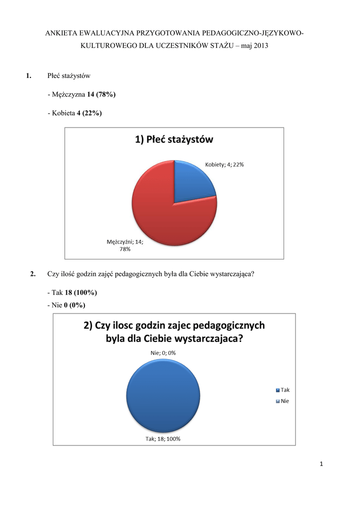 ANKIETA EWALUACYJNA PRZYGOTOWANIA PEDAGOGICZNO-JĘZYKOWOKULTUROWEGO DLA UCZESTNIKÓW STAŻU – maj 2013 1. Płeć stażystów - Mężczyzna 14 (78%) - Kobieta 4 (22%) 2. Czy ilość godzin zajęć pedagogicznych była dla Ciebie wystarczająca? - Tak 18 (100%) - Nie 0 (0%) 1 3. Jakie umiejętności nabyłeś podczas przygotowania pedagogicznego (można zaznaczyć kilka odpowiedzi)? - praca w grupie 14 TAK / 4 NIE - odnajdywanie swojej pozycji i funkcji w zespole 12 TAK / 6 NIE - przekazywanie informacji 13 TAK / 5 NIE - radzenie sobie w stresujących sytuacjach 11 TAK / 7 NIE - rozwiazywanie problemów 11 TAK / 7 NIE 4. W jakim stopniu zajęcia pedagogiczne były dla Ciebie przydatne? - 1 (1) - 2 (2) -3(2) - 4 (2) - 5 (5) - 6 (6) 2 5. 6. Na ile oceniasz przygotowanie pedagogiczne? - 1 (0) - 2 (1) -3(0) - 4 (2) - 5 (6) - 6 (9) Czy ilość godzin zajęć z języka angielskiego zawodowego była dla Ciebie wystarczająca? - Tak 15 - Nie 3 3 7. Czy zajęcia z języka angielskiego zwiększyły Twój poziom językowy i były dla Ciebie przydatne? - Tak 18 (100%) - Nie 0 (0%) 8. Czy ilość zajęć językowych z języka portugalskiego była dla Ciebie wystarczająca? - Tak 15 - Nie 3 4 9. 10. Na ile oceniasz znajomość języka portugalskiego po odbyciu zajęć językowych? - 1 mało (0) - 2 (10) - 3 (5) - 4 (2) - 5 (1) - 6 bardzo (0) Czy na zajęciach języka portugalskiego były wprowadzone elementy kulturowe? - Tak 18 - Nie 0 Jeśli „TAK” zaznacz jakie (można wybrać kilka odpowiedzi) Kuchnia portugalska(18) Styl życia Portugalczyków (17) Różnice kulturowe (14) Zwyczaje i tradycje (14) 5 11. 1 (0) Na ile oceniasz przygotowanie językowo-kulturowe? 2 (0) 3 (1) 4 (5) 5 (4) 6 (8) 12. Co zmieniłbyś/czego Ci brakowało w przygotowaniach do projektu Leonardo Da Vinci? większy nacisk na elementy kulturowe podczas zajęć języka portugalskiego zmiana stylu nauczania języka portugalskiego na bardziej użyteczny w życiu codziennym zorganizowanie spotkania integracyjnego przed wyjazdem 6 PODSUMOWANIE WYNIKÓW W ankiecie wzięli udział wszyscy stażyści tj. 14 mężczyzn i 4 kobiety. Wszyscy ankietowani uznali, że ilość godzin pedagogicznych była wystarczająca. Większość ankietowanych uznała, że podczas przygotowania pedagogicznego nabyła następujące umiejętności : praca w grupie - 14 osób odnajdowanie swojej pozycji i funkcji w zespole - 12 osób przekazywanie informacji - 13 osób radzenie sobie w stresujących sytuacjach - 11 osób rozwiązywanie problemów - 11 osób Ponad 60 % stażystów uznało przygotowanie pedagogiczne za przydatne. 83 % ankietowanych uznało ilość godzin zajęć z języka angielskiego zawodowego za wystarczającą. Dla wszystkich ankietowanych zajęcia te były przydatne i zwiększyły poziom językowy uczestników stażu. Również wymiar godzin języka portugalskiego został przez większość (83%) uznany na wystarczający , po tych zajęciach stażyści ocenili znajomość języka portugalskiego na poziomie 2 lub 3 w 6-stopniowej skali. Wszyscy potwierdzili, że podczas lekcji portugalskiego wprowadzane były elementy kulturowe głównie dotyczące kuchni portugalskiej (100%) , stylu życia Portugalczyków (95%), różnic kulturowych zwyczajów i tradycji (78%). Ogólnie stażyści ocenili przygotowanie językowo- kulturowe na dobre (28%) lub bardzo dobre (67%). Stażyści zaproponowali, aby podczas zajęć z języka portugalskiego pojawiło się więcej elementów kultury Portugalii oraz aby prowadzący więcej czasu poświęcił na ćwiczenia konwersacyjne zawierające proste zwroty z życia codziennego. Padła też propozycja zorganizowania spotkania integracyjnego przed wyjazdem. WNIOSKI Stażyści byli dobrze przygotowani do wyjazdu na staż. W drugim roku realizacji stażu należy powtórzyć przygotowanie pedagogiczno-kulturowo-językowe dla kolejnej grupy uczniów. Jedynie można zwiększyć liczbę godzin języka portugalskiego. 7
