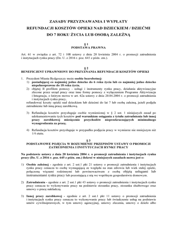 ZASADY PRZYZNAWANIA I WYPŁATY REFUNDACJI KOSZTÓW OPIEKI NAD DZIECKIEM / DZIEĆMI DO 7 ROKU ŻYCIA LUB OSOBĄ ZALEŻNĄ §1 PODSTAWA PRAWNA Art. 61 w związku z art. 72 i 108 ustawy z dnia 20 kwietnia 2004 r. o promocji zatrudnienia i instytucjach rynku pracy (Dz. U. z 2016 r. poz. 645 z późn. zm.). §2 BENEFICJENT UPRAWNIONY DO PRZYZNANIA REFUNDACJI KOSZTÓW OPIEKI 1. Prezydent Miasta Bydgoszczy może osobie bezrobotnej: 1) posiadającej co najmniej jedno dziecko do 6 roku życia lub co najmniej jedno dziecko niepełnosprawne do 18 roku życia, 2) objętej II profilem pomocy - usługi i instrumenty rynku pracy, działania aktywizacyjne zlecone przez urząd pracy oraz inne formy pomocy z wyłączeniem Programu Aktywizacja i Integracja, o którym mowa w art. 62a ustawy z dnia 20.04.2004 r. o promocji zatrudnienia i instytucjach rynku pracy, refundować koszty opieki nad dzieckiem lub dziećmi do lat 7 lub osobą zależną, jeżeli podjęła zatrudnienie lub inną pracę zarobkową. 3) Refundacja kosztów przysługuje osobie wymienionej w § 2 ust. 1 niniejszych zasad po udokumentowaniu tych kosztów pod warunkiem osiągania z tytułu zatrudnienia lub innej pracy zarobkowej miesięcznie przychodów nieprzekraczających minimalnego wynagrodzenia za pracę. 4) Refundacja kosztów przysługuje w przypadku podjęcia pracy w wymiarze nie mniejszym niż 1/4 etatu. §3 PODSTAWOWE POJĘCIA W ROZUMIENIU PRZEPISÓW USTAWY O PROMOCJI ZATRUDNIENIA I INSTYTUCJACH RYNKU PRACY Na podstawie ustawy z dnia 20 kwietnia 2004 r. o promocji zatrudnienia i instytucjach rynku pracy (Dz. U. z 2016 r. poz. 645 z późn. zm.) ilekroć w niniejszych zasadach mowa jest o: 1) Osobie zależnej - zgodnie z art. 2 ust.1 pkt 21 ustawy o promocji zatrudnienia i instytucjach rynku pracy oznacza to osobę wymagającą ze względu na stan zdrowia lub wiek stałej opieki, połączoną więzami rodzinnymi lub powinowactwem z osobą objętą usługami lub instrumentami rynku pracy lub pozostającą z nią we wspólnym gospodarstwie domowym. 2) Zatrudnieniu - zgodnie z art. 2 ust.1 pkt 43 ustawy o promocji zatrudnienia i instytucjach rynku pracy oznacza to wykonywanie pracy na podstawie stosunku pracy, stosunku służbowego oraz umowy o pracę nakładczą. 3) Innej pracy zarobkowej - zgodnie z art. 2 ust.1 pkt 11 ustawy o promocji zatrudnienia i instytucjach rynku pracy oznacza to wykonywanie pracy lub świadczenie usług na podstawie umów cywilnoprawnych, w tym umowy agencyjnej, umowy zlecenia, umowy o dzieło albo w okresie członkostwa w rolniczej spółdzielni produkcyjnej, spółdzielni kółek rolniczych lub spółdzielni usług rolniczych. §4 OKRES TRWANIA REFUNDACJI Refundacja kosztów opieki nad dzieckiem/dziećmi do lat 7 lub osobą zależną następuje na wniosek osoby uprawnionej w przypadku podjęcia zatrudnienia lub innej pracy zarobkowej na okres do 6 miesięcy. §5 WYSOKOŚĆ REFUNDACJI Refundacja kosztów opieki na dzieckiem/dziećmi do lat 7 lub osobą zależną przysługuje miesięcznie w wysokości uzgodnionej, nie wyższej jednak niż połowa 100% kwoty zasiłku dla bezrobotnych. Kwota refundacji nie może przekroczyć jednocześnie uzyskanego w danym miesiącu wynagrodzenia brutto. §6 WYPŁATA REFUNDACJI Wypłata refundacji kosztów opieki dokonywana jest z dołu, za okresy miesięczne: 1) na konto bankowe wskazane przez beneficjenta, którego jest posiadaczem, 2) za pośrednictwem placówek Banku PKO S.A. (dotyczy osób, które były zarejestrowane w Bydgoszczy), w oddziale Banku PKO BP (dotyczy osób, które były zarejestrowane w Solcu Kujawskim), w oddziale Banku PKO S.A. (dotyczy osób, które były zarejestrowane w Koronowie). po uprzednim przedłożeniu: 1) „oświadczenia o osiąganym przychodzie” potwierdzającym wysokość przychodów z tytułu zatrudnienia lub innej pracy zarobkowej, 2) dokumentów potwierdzających poniesione koszty z tytułu opieki nad dzieckiem/dziećmi lub osobą zależną, np. zaświadczenie o uiszczeniu opłaty, rachunki, dowody wpłaty, rachunki z innych instytucji (agencji) opiekujących się dzieckiem/dziećmi lub osobą zależną, określające dane osoby opłacającej rachunki oraz dane dziecka/dzieci lub osoby zależnej, a także miesiąc, którego dotyczy, 3) dodatkowo deklaracji rozliczeniowej ZUS P DRA oraz imiennego raportu miesięcznego o należnych składkach i wypłaconych świadczeniach ZUS P RCA (w przypadku umowy uaktywniającej). Powyższe dokumenty należy dostarczyć do 7-ego dnia każdego miesiąca za miesiąc poprzedni. Wypłata refundacji następuje w terminie ustalonym przez Powiatowy Urząd Pracy, nie później jednak niż w terminie 30 dni od dnia złożenia oświadczenia o osiąganych przychodach oraz dokumentów potwierdzających poniesione koszty opieki. W przypadku, gdy do dnia poprzedzającego termin wypłaty świadczenia beneficjent nie przedłoży oświadczenia o przychodach, Powiatowy Urząd Pracy wstrzymuje wypłatę świadczenia. Refundację za niepełny miesiąc ustala się dzieląc kwotę refundacji przez 30 i mnożąc przez liczbę dni kalendarzowych przypadających w okresie, za który świadczenie przysługuje. §7 UTRATA PRAWA DO REFUNDACJI Refundacja kosztów opieki nad dzieckiem / dziećmi do lat 7 lub osobą zależną nie przysługuje w przypadku: 1) przerwania zatrudnienia lub innej pracy zarobkowej; 2) ustania statusu osoby, o której mowa w art. 49 pkt 5 ustawy z dnia 20 kwietnia 2004 r. o promocji zatrudnienia i instytucjach rynku pracy (Dz. U. z 2016 r. poz. 645 z późn. zm.) tj. ukończenia przez dziecko, na które przysługuje refundacja 6 roku życia lub w przypadku dziecka niepełnosprawnego 18 roku życia; 3) zaprzestania sprawowania opieki nad dzieckiem/dziećmi do lat 7 lub osobą zależną; 4) osiągnięcia z tytułu zatrudnienia lub innej pracy zarobkowej miesięcznych przychodów przekraczających minimalne wynagrodzenie za pracę zgodnie z ustawą z dnia 10.10.2002r. o minimalnym wynagrodzeniu za pracę (Dz