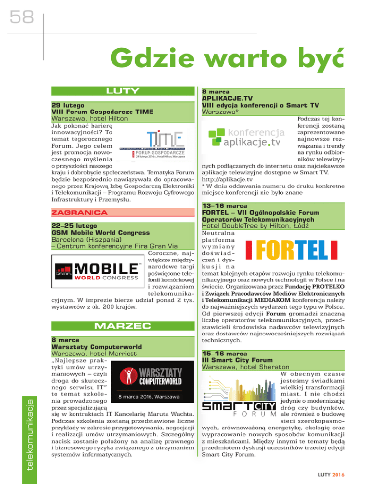 58 Gdzie warto być LUTY 29 lutego VIII Forum Gospodarcze TIME Warszawa, hotel Hilton Jak pokonać barierę innowacyjności? To temat tegorocznego Forum. Jego celem jest promocja nowoczesnego myślenia o przyszłości naszego kraju i dobrobycie społeczeństwa. Tematyka Forum będzie bezpośrednio nawiązywała do opracowanego przez Krajową Izbę Gospodarczą Elektroniki i Telekomunikacji – Programu Rozwoju Cyfrowego Infrastruktury i Przemysłu. ZAGRANICA 22–25 lutego GSM Mobile World Congress Barcelona (Hiszpania) – Centrum konferencyjne Fira Gran Via Coroczne, największe międzynarodowe targi poświęcone telefonii komórkowej i rozwiązaniom telekomunikacyjnym. W imprezie bierze udział ponad 2 tys. wystawców z ok. 200 krajów. telekomunikacja MARZEC 8 marca Warsztaty Computerworld Warszawa, hotel Marriott „Najlepsze praktyki umów utrzymaniowych – czyli droga do skutecznego serwisu IT” to temat szkolenia prowadzonego przez specjalizującą się w kontraktach IT Kancelarię Maruta Wachta. Podczas szkolenia zostaną przedstawione liczne przykłady w zakresie przygotowywania, negocjacji i realizacji umów utrzymaniowych. Szczególny nacisk zostanie położony na analizę prawnego i biznesowego ryzyka związanego z utrzymaniem systemów informatycznych. 8 marca APLIKACJE.TV VIII edycja konferencji o Smart TV Warszawa* Podczas tej konferencji zostaną zaprezentowane najnowsze rozwiązania i trendy na rynku odbiorników telewizyjnych podłączanych do internetu oraz najciekawsze aplikacje telewizyjne dostępne w Smart TV. http://aplikacje.tv * W dniu oddawania numeru do druku konkretne miejsce konferencji nie było znane 13–16 marca FORTEL – VII Ogólnopolskie Forum Operatorów Telekomunikacyjnych Hotel DoubleTree by Hilton, Łódź Neutralna platforma VII OGÓLNOP wymiany doświadHotel Doub czeń i dyskusji na temat kolejnych etapów rozwoju rynku telekomunikacyjnego oraz nowych technologii w Polsce i na świecie. Organizowana przez Fundację PROTELKO i Związek Pracodawców Mediów Elektronicznych i Telekomunikacji MEDIAKOM konferencja należy do najważniejszych wydarzeń tego typu w Polsce. Od pierwszej edycji Forum gromadzi znaczną liczbę operatorów telekomunikacyjnych, przedstawicieli środowiska nadawców telewizyjnych oraz dostawców najnowocześniejszych rozwiązań technicznych. 15–16 marca III Smart City Forum Warszawa, hotel Sheraton W obecnym czasie jesteśmy świadkami wielkiej transformacji miast. I nie chodzi jedynie o modernizację dróg czy budynków, ale również o budowę sieci szerokopasmowych, zrównoważoną energetykę, ekologię oraz wypracowanie nowych sposobów komunikacji z mieszkańcami. Między innymi te tematy będą przedmiotem dyskusji uczestników trzeciej edycji Smart City Forum. luty 2016 59 w 2016 roku? 31 marca VIII edycja Konferencji Sieci Szerokopasmowe Warszawa, hotel Westin Po w s z e c h ny dostęp do szybkiego internetu we współczesnym świecie to jedna z najważniejszych przewag konkurencyjnych gospodarek i sposób zapewnienia długofalowego wzrostu gospodarczego. Kluczowa w tym kontekście staje się debata, w jaki sposób taki dostęp zapewnić oraz kto powinien odpowiadać za jego dostarczenie. Naprzeciw tym wyzwaniom wychodzi Konferencja Sieci Szerokopasmowe, która już od sześciu edycji jest miejscem dyskusji dla najważniejszych na rynku podmiotów: regulatora, administracji rządowej i samorządowej, firm, izb branżowych i instytucji. ZAGRANICA 14–18 marca CeBIT 2016 Międzynarodowe Targi Technologii Informatycznych i Telekomunikacyjnych Hannover (Niemcy), Deutsche Messe Jedno z największych spotkań przedstawicieli sektora teleinformatycznego i gospodarki cyfrowej na świecie. Podczas targów, konferencji i imprez firmowych swoje osiągnięcia technologiczne prezentują m.in.: producenci oprogramowania, sprzętu komputerowego i twórcy nowych technologii informatycznych. 8–10 marca Satellite 2016 Maryland (USA), Gaylord National Convention Center, National Harbor, MD Konferencja i wystawa technologii satelitarnych, gdzie prezentowane będą najnowsze osiągnięcia w dziedzinie komunikacji satelitarnej wykorzystywanej w najróżniejszych obszarach życia, m.in.: w badaniach naukowych, gospodarce morskiej, telekomunikacji, dostępie szerokopasmowym, badaniach klimatycznych czy obronności. 15–17 marca Cabex 2016 13 Międzynarodowe Targi Kabli, Przewodów i Osprzętu Kablowego Moskwa (Rosja), ECC Sokolniki Globalne, światowe forum branży producentów kabli i przewodów oraz osprzętu i akcesoriów z tym związanych. Prezentowane są tu kable najróżniejszego autoramentu i zastosowań, w tym kable komunikacyjne i światłowodowe. Wśród akcesoriów znaleźć można m.in.: terminale i przełącznice światłowodowe, złącza do włókien optycznych czy sprzęt i narzędzia do mocowania kabli i przewodów. Cabex 2016 to także towarzyszące targom konferencje naukowe i techniczne, seminaria, warsztaty i prezentacje. 14–16 marca Konferencja DVB World 2016 Wenecja (Włochy), Hilton Molino Stucky Hotel Odbywające się co roku w innym europejskim mieście największe coroczne spotkanie poświę- telekomunikacja 30–31 marca XVI Sympozjum Świata Telekomunikacji i Mediów Warszawa, hotel Westin Doroczne spotkanie integrujące przedstawicieli administracji centralnej, regulatora, organizacji pozarządowych oraz przedstawicieli top managementu najważniejszych firm. Sympozjum stanowi platformę dialogu dotyczącego rozwoju sektorów telekomunikacyjnego i współpracujących. W ramach wydarzenia prowadzone są dyskusje o najistotniejszych zmianach na rynku, analizowane trendy, poszukiwane nowe modele biznesowe pozwalające efektywnie realizować przyjęte strategie. Wydarzenie, jak co roku uświetni Wielka Gala Złotych i Kryształowych Anten, podczas której niezależna Kapituła nagrodzi osoby, firmy i rozwiązania, które przyczyniły się do rozwoju rynku telekomunikacji i mediów AD 2015. 60 Gdzie wart