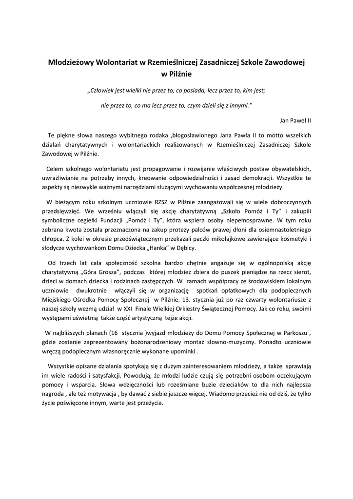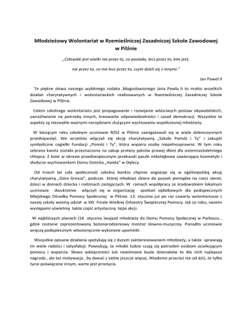 Młodzieżowy Wolontariat w Rzemieślniczej Zasadniczej Szkole Zawodowej w Pilźnie „Człowiek jest wielki nie przez to, co posiada, lecz przez to, kim jest; nie przez to, co ma lecz przez to, czym dzieli się z innymi.” Jan Paweł II Te piękne słowa naszego wybitnego rodaka ,błogosławionego Jana Pawła II to motto wszelkich działań charytatywnych i wolontariackich realizowanych w Rzemieślniczej Zasadniczej Szkole Zawodowej w Pilźnie. Celem szkolnego wolontariatu jest propagowanie i rozwijanie właściwych postaw obywatelskich, uwrażliwianie na potrzeby innych, kreowanie odpowiedzialności i zasad demokracji. Wszystkie te aspekty są niezwykle ważnymi narzędziami służącymi wychowaniu współczesnej młodzieży. W bieżącym roku szkolnym uczniowie RZSZ w Pilźnie zaangażowali się w wiele dobroczynnych przedsięwzięć. We wrześniu włączyli się akcję charytatywną „Szkoło Pomóż i Ty” i zakupili symboliczne cegiełki Fundacji „Pomóż i Ty”, która wspiera osoby niepełnosprawne. W tym roku zebrana kwota została przeznaczona na zakup protezy palców prawej dłoni dla osiemnastoletniego chłopca. Z kolei w okresie przedświątecznym przekazali paczki mikołajkowe zawierające kosmetyki i słodycze wychowankom Domu Dziecka „Hanka” w Dębicy. Od trzech lat cała społeczność szkolna bardzo chętnie angażuje się w ogólnopolską akcję charytatywną „Góra Grosza”, podczas której młodzież zbiera do puszek pieniądze na rzecz sierot, dzieci w domach dziecka i rodzinach zastępczych. W ramach współpracy ze środowiskiem lokalnym uczniowie dwukrotnie włączyli się w organizację spotkań opłatkowych dla podopiecznych Miejskiego Ośrodka Pomocy Społecznej w Pilźnie. 13. stycznia już po raz czwarty wolontariusze z naszej szkoły wezmą udział w XXI Finale Wielkiej Orkiestry Świątecznej Pomocy. Jak co roku, swoimi występami uświetnią także część artystyczną tejże akcji. W najbliższych planach (16 stycznia )wyjazd młodzieży do Domu Pomocy Społecznej w Parkoszu , gdzie zostanie zaprezentowany bożonarodzeniowy montaż słowno-muzyczny. Ponadto uczniowie wręczą podopiecznym własnoręcznie wykonane upominki . Wszystkie opisane działania spotykają się z dużym zainteresowaniem młodzieży, a także sprawiają im wiele radości i satysfakcji. Powodują, że młodzi ludzie czują się potrzebni osobom oczekującym pomocy i wsparcia. Słowa wdzięczności lub roześmiane buzie dzieciaków to dla nich najlepsza nagroda , ale też motywacja , by dawać z siebie jeszcze więcej. Wiadomo przecież nie od dziś, że tylko życie poświęcone innym, warte jest przeżycia.